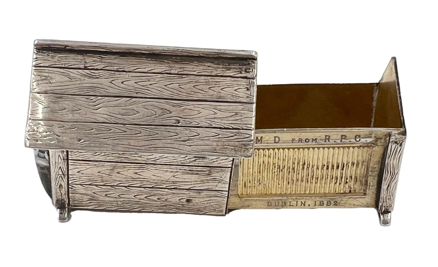 A rare silver and enamel “dog in kennel” vesta case with opening drawer. THOMAS JOHNSON I RETAILING BY W.THORNHILL AND CO, 144 BOND STREET, 1881.