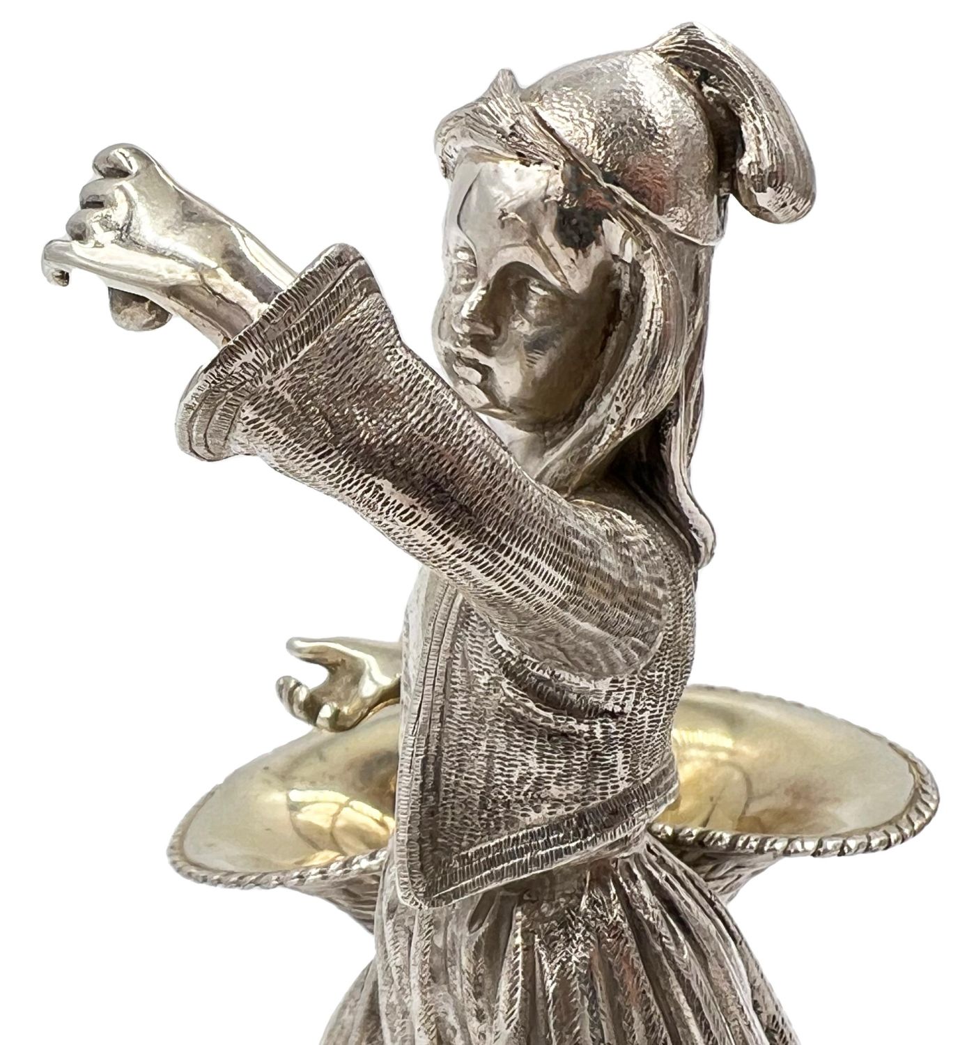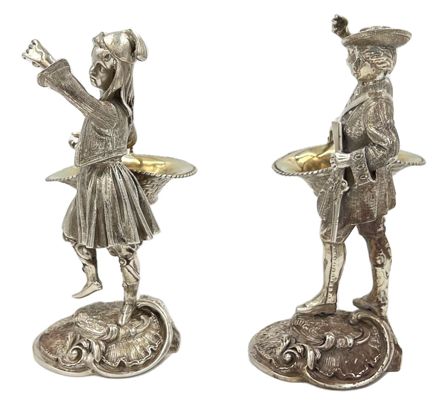 A STUNNING PAIR OF SOILD SILVER FIGURES DEPICTIONG A GENTLEMAN AND A LADY CARRYING BASKETS