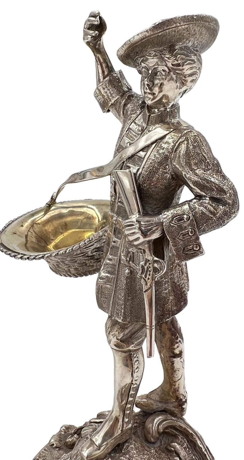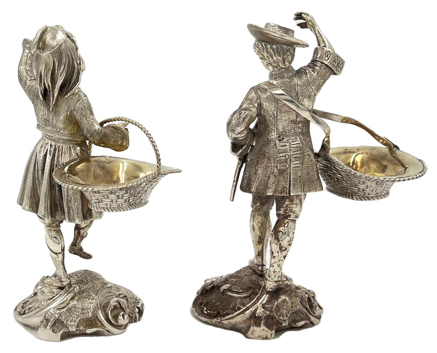 A stunning pair of cast table cruets modelled as a gentleman and a lady carrying baskets, GARRARD & CO, 1997
