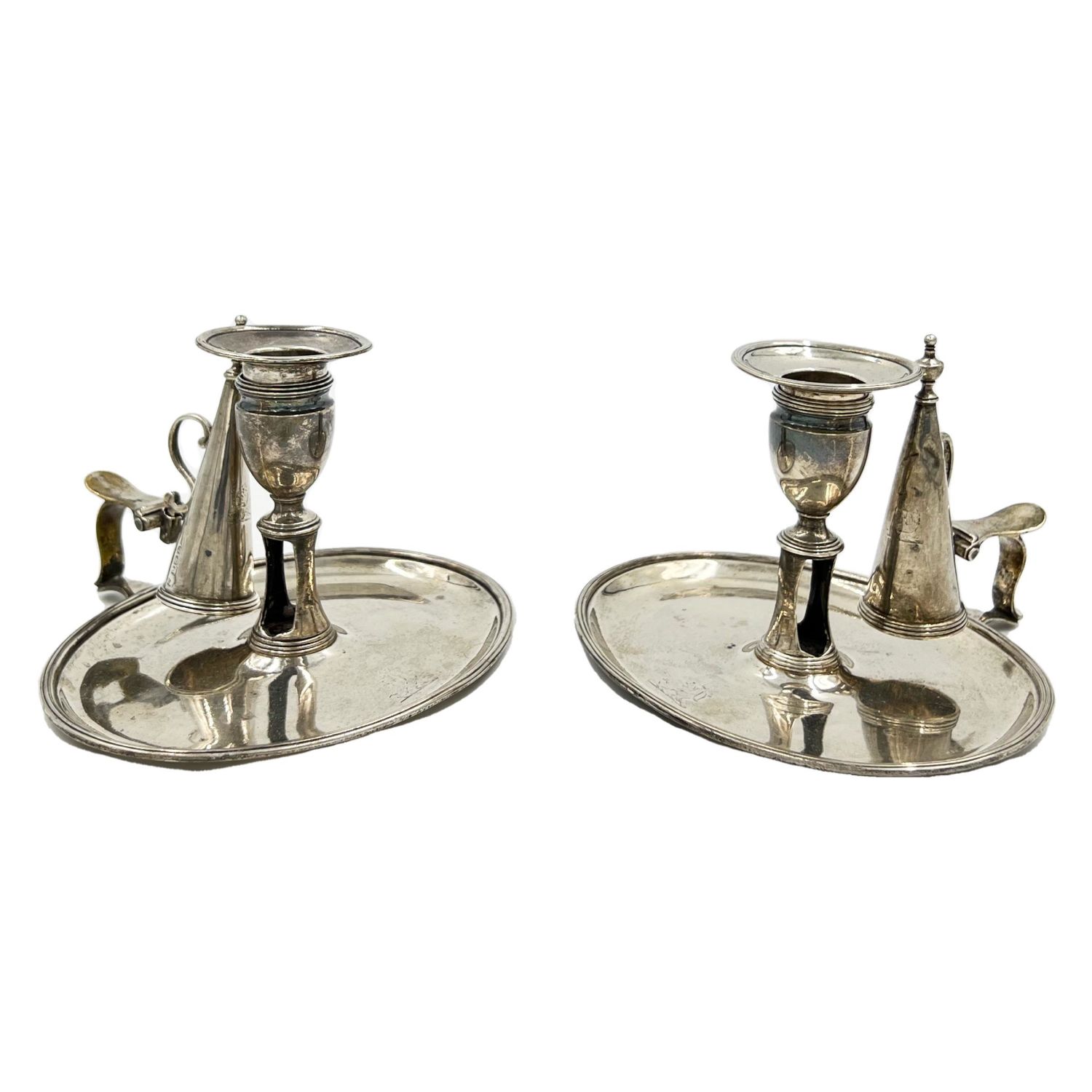 A FINE PAIR OF GEORGIAN SILVER CHAMBER-STICKS, LONDON, PROBABLY BY WILKES BOOTH, 1796 A Fine Pair Of Georgian Silver Chamber-Sticks H: 12,cm, W: 16cm, Weight: 294g & 308g