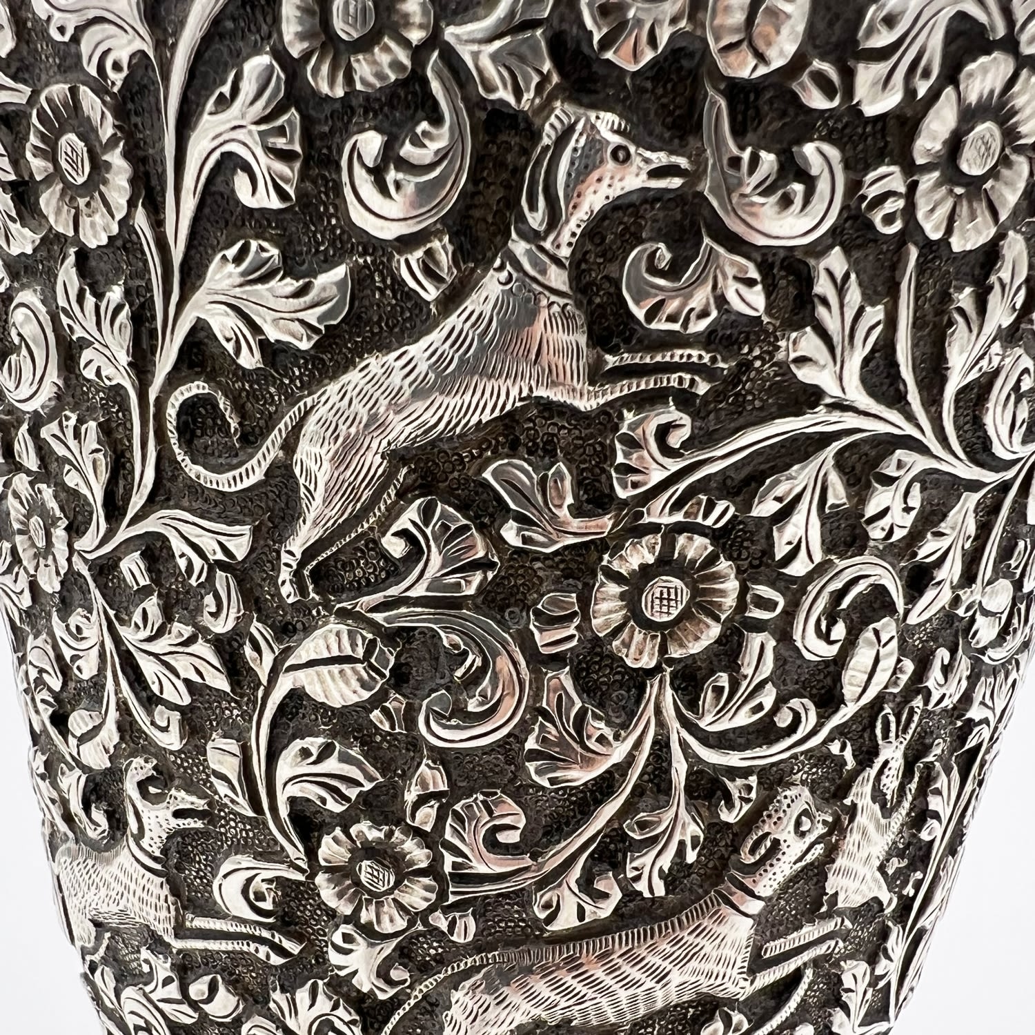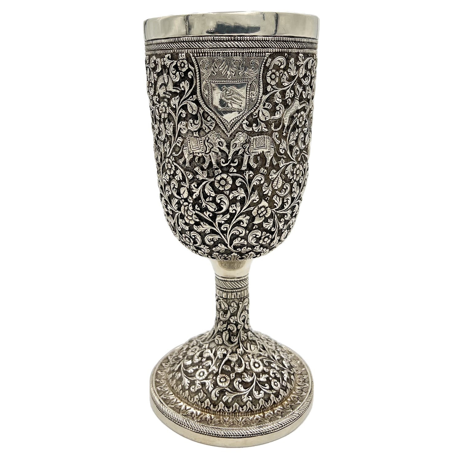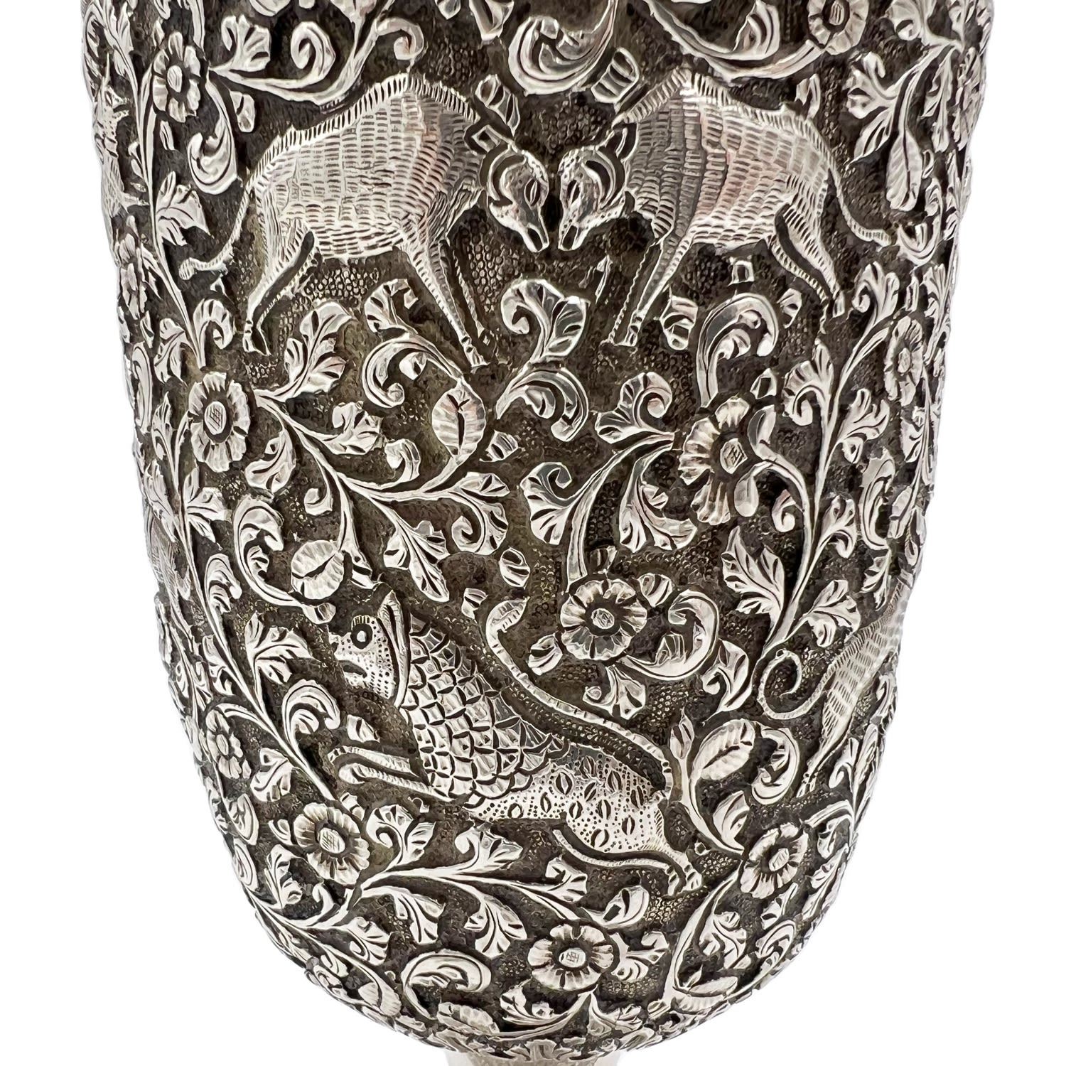 A fine quality large Indian silver goblet with intricate decoration throughout featuring elephants, deer and other animals.