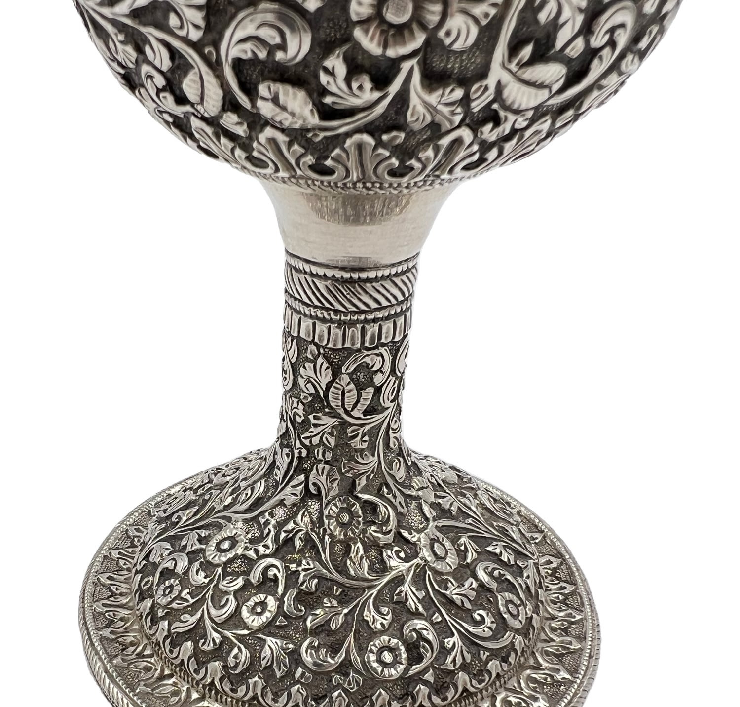 A FINE QUALITY LARGE INDIAN SILVER GOBLET WITH INTRICATE DECORATION