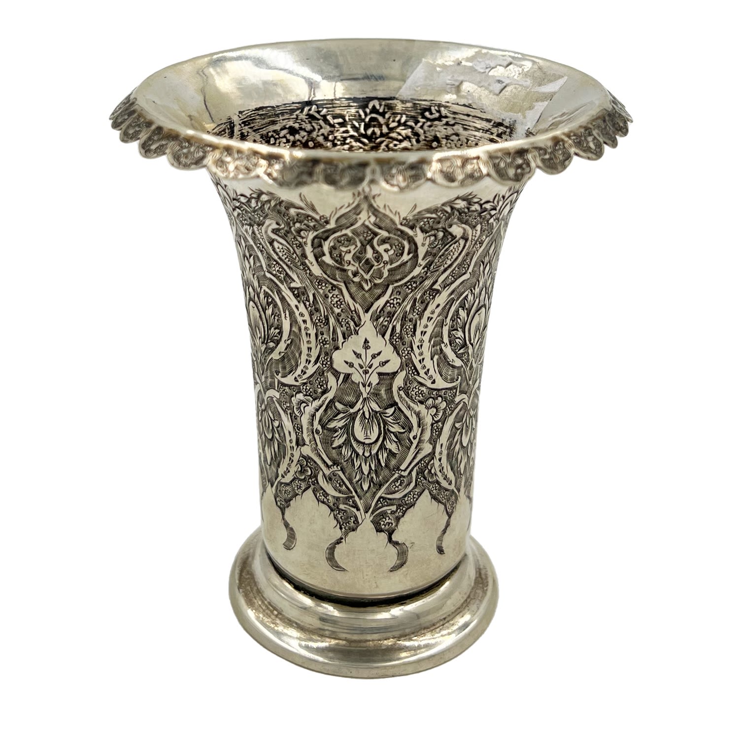 A GOOD QUALITY PERSIAN SILVER VASE WITH DETAILED DECORATION TO BODY A good quality Persian silver vase with detailed decoration to body. H: 12cm, Weight: 181g