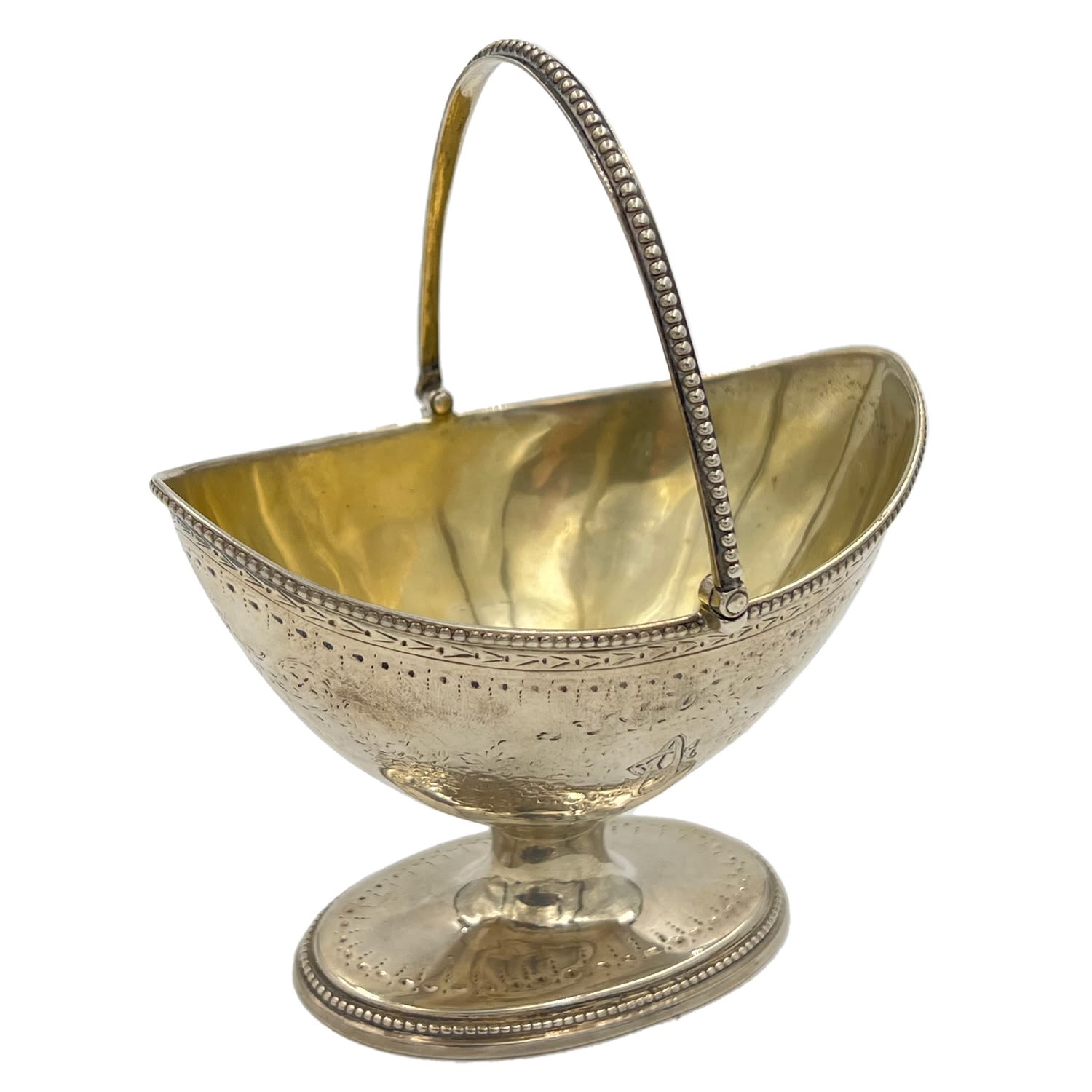A Georgian silver swing handle sugar basket raised on a pedestal foot.
