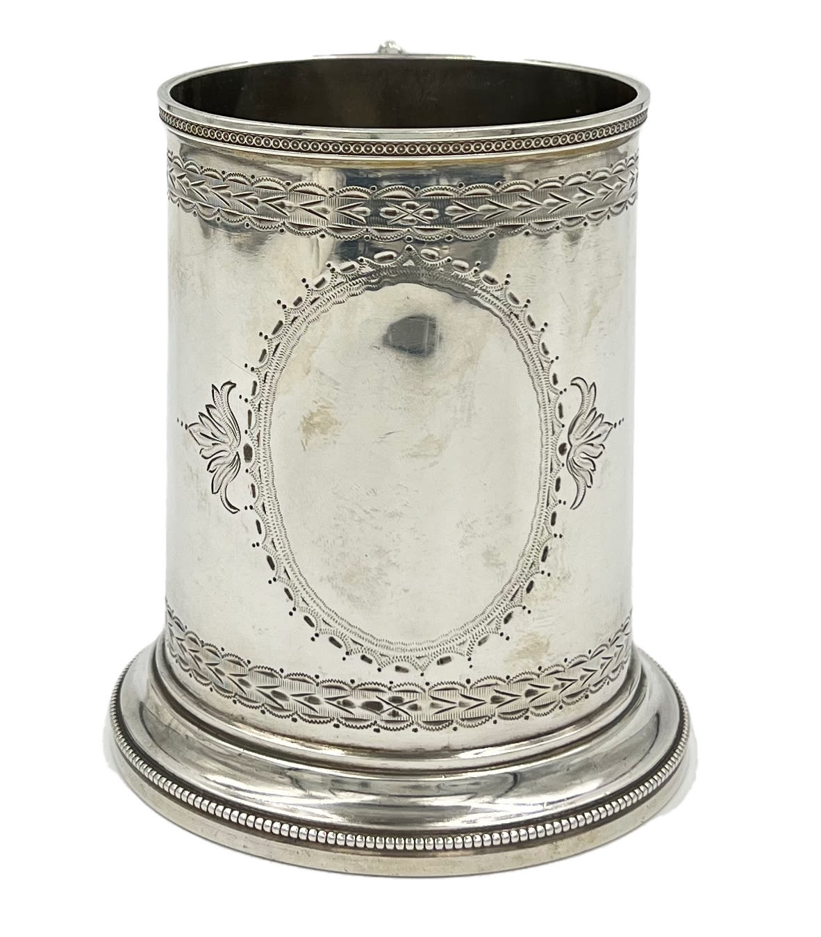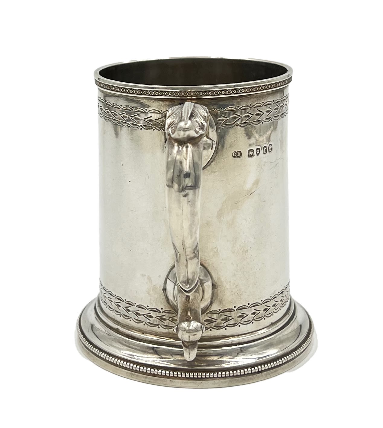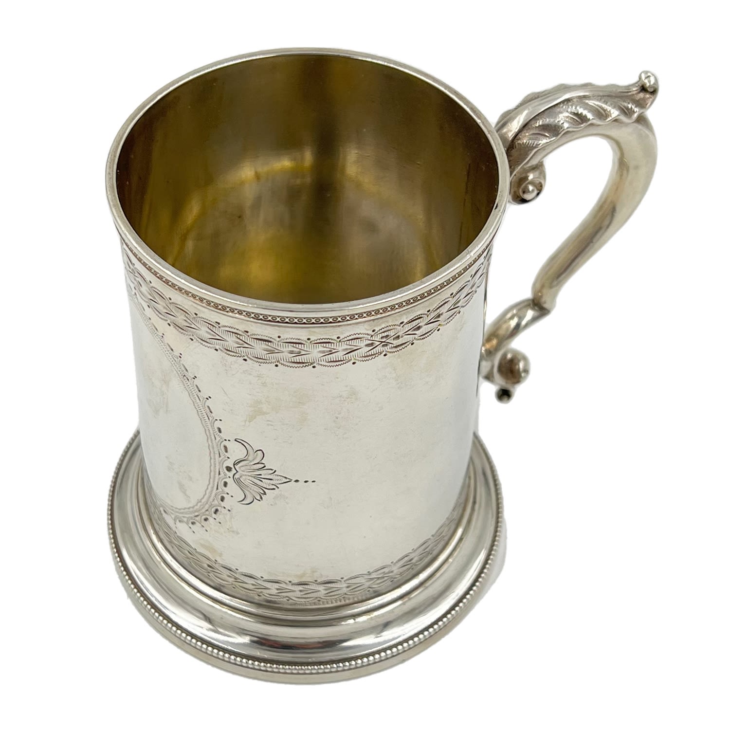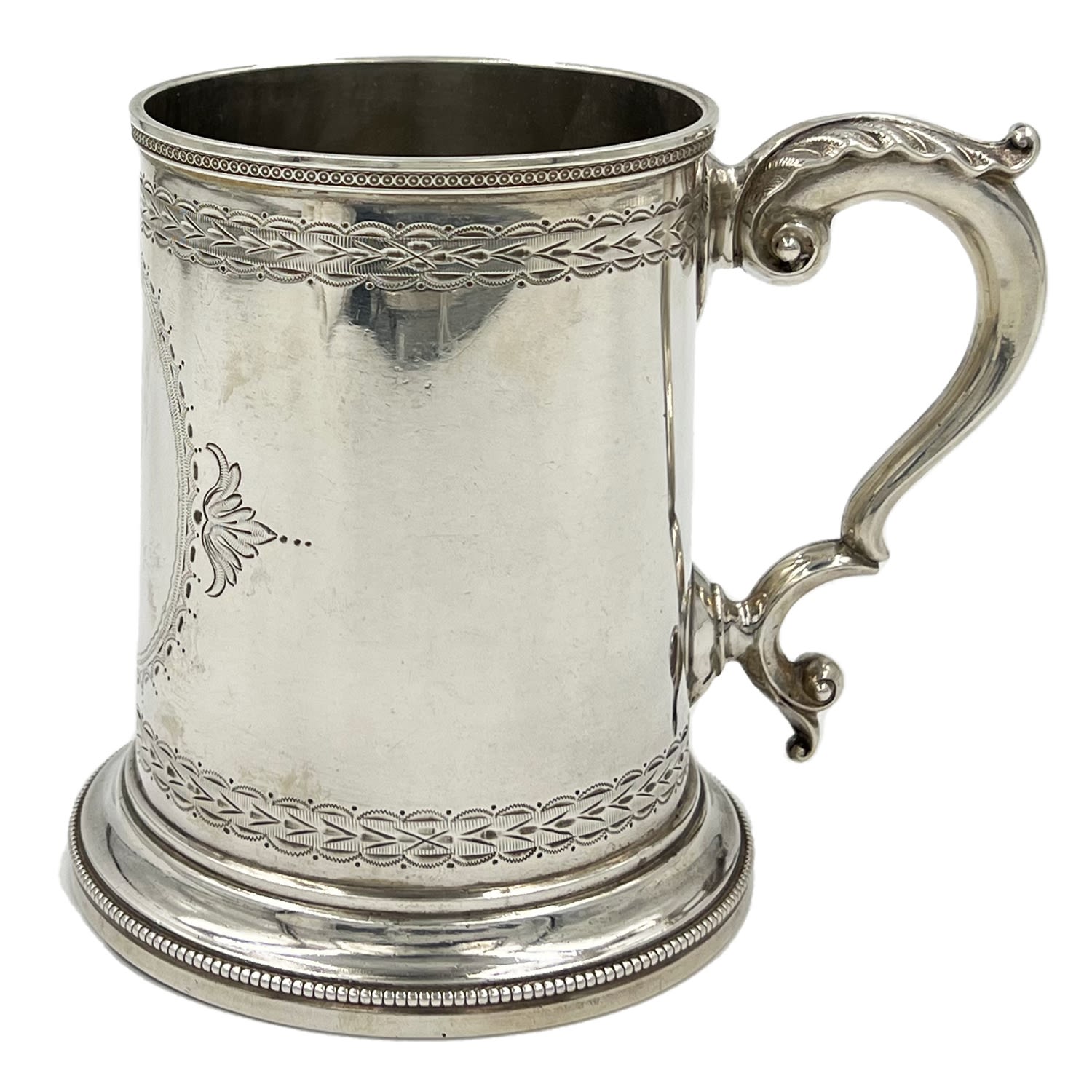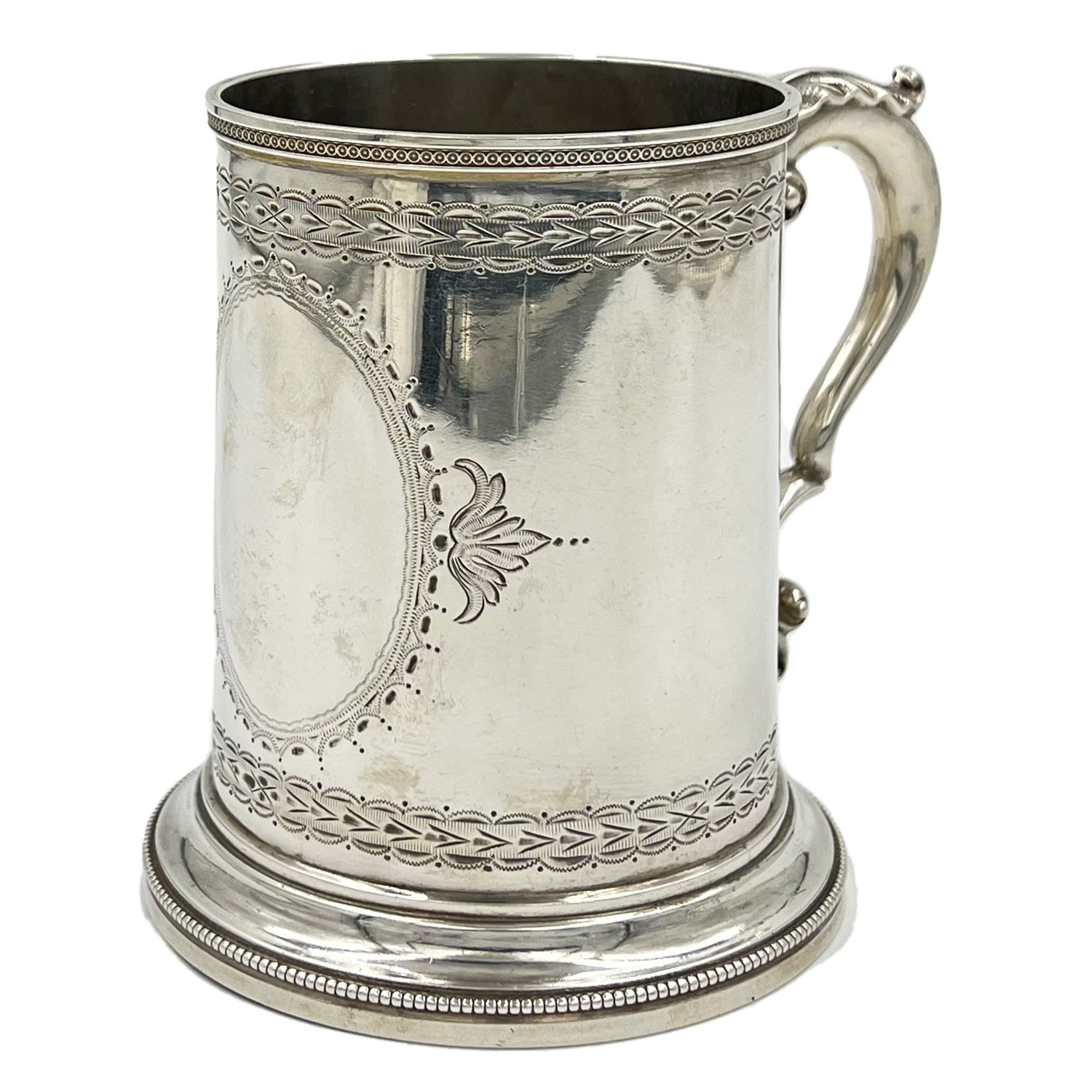 A good sized and good quality Victorian silver tankard with bright cut decoration and a large, vacant cartouche, LONDON, ROBERT HARPER, 1874.