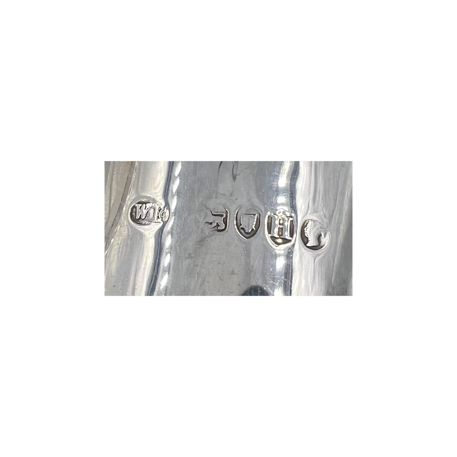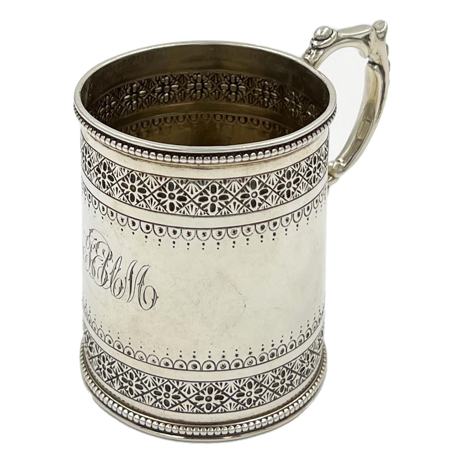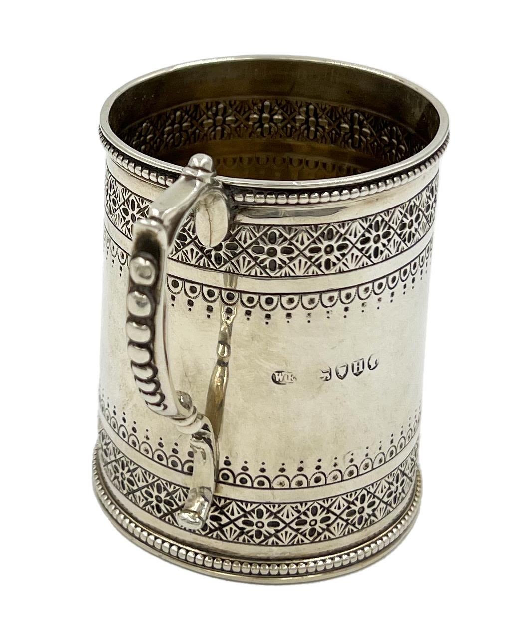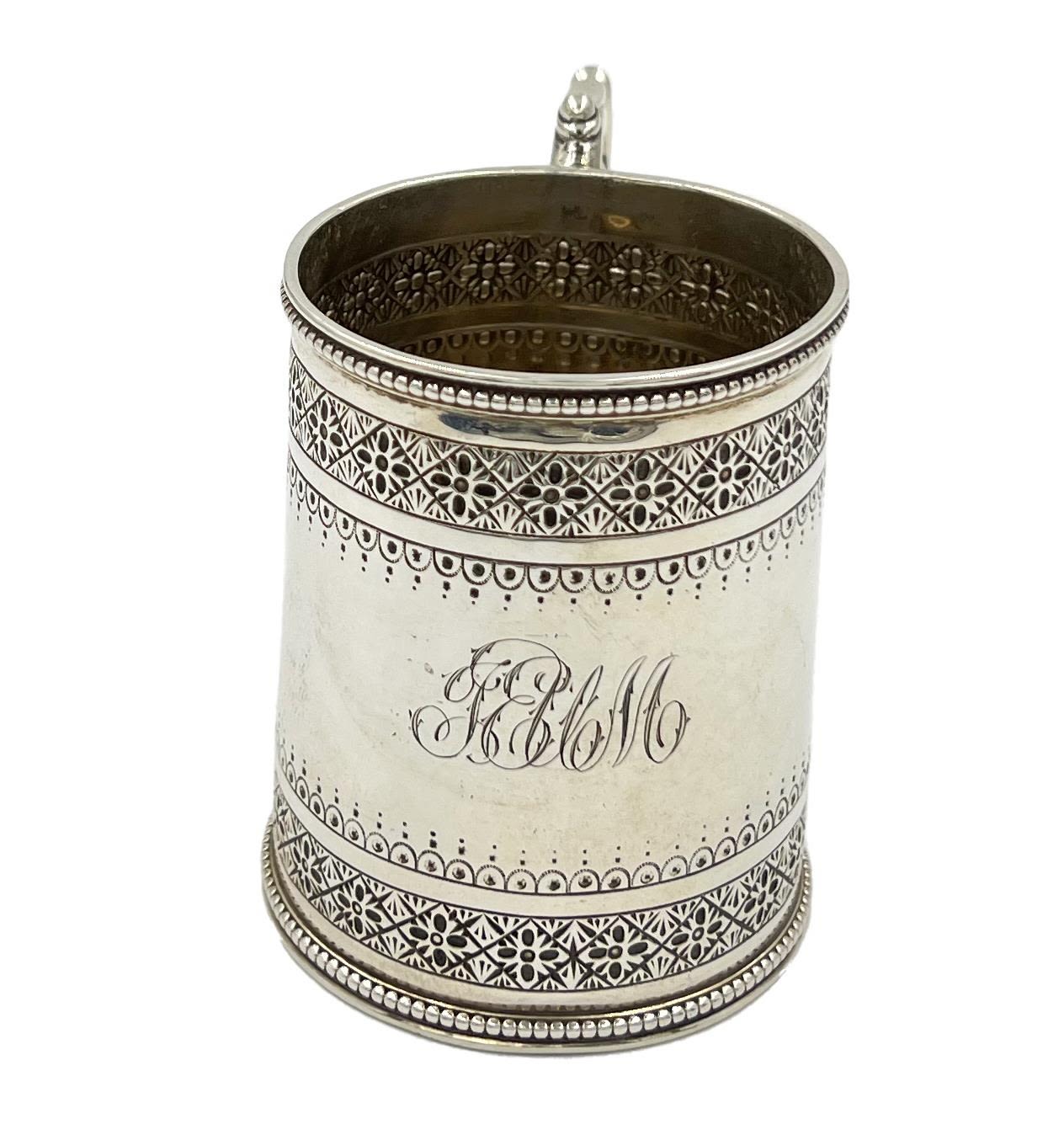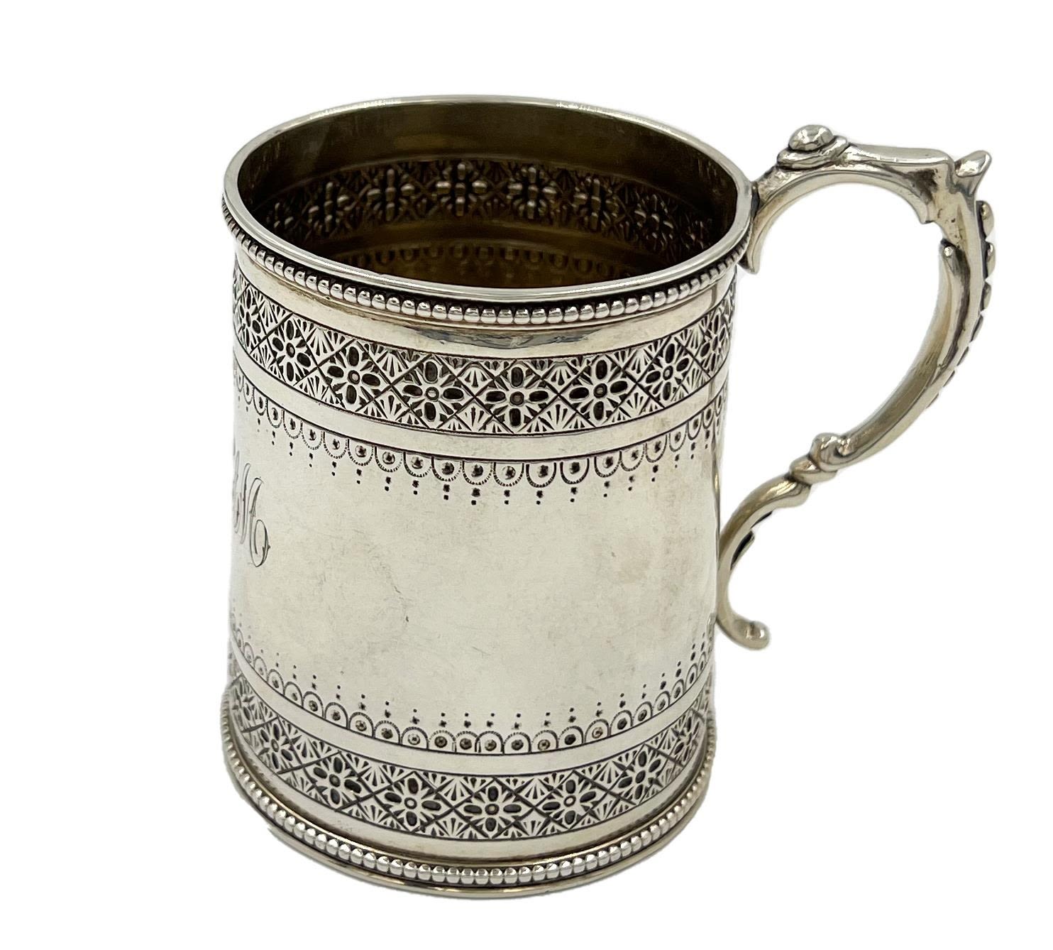 A small Victorian silver christening tankard with decoration to upper rim and base. Intertwined monogram to body. LONDON, WILLIAM EVANS, 1883.