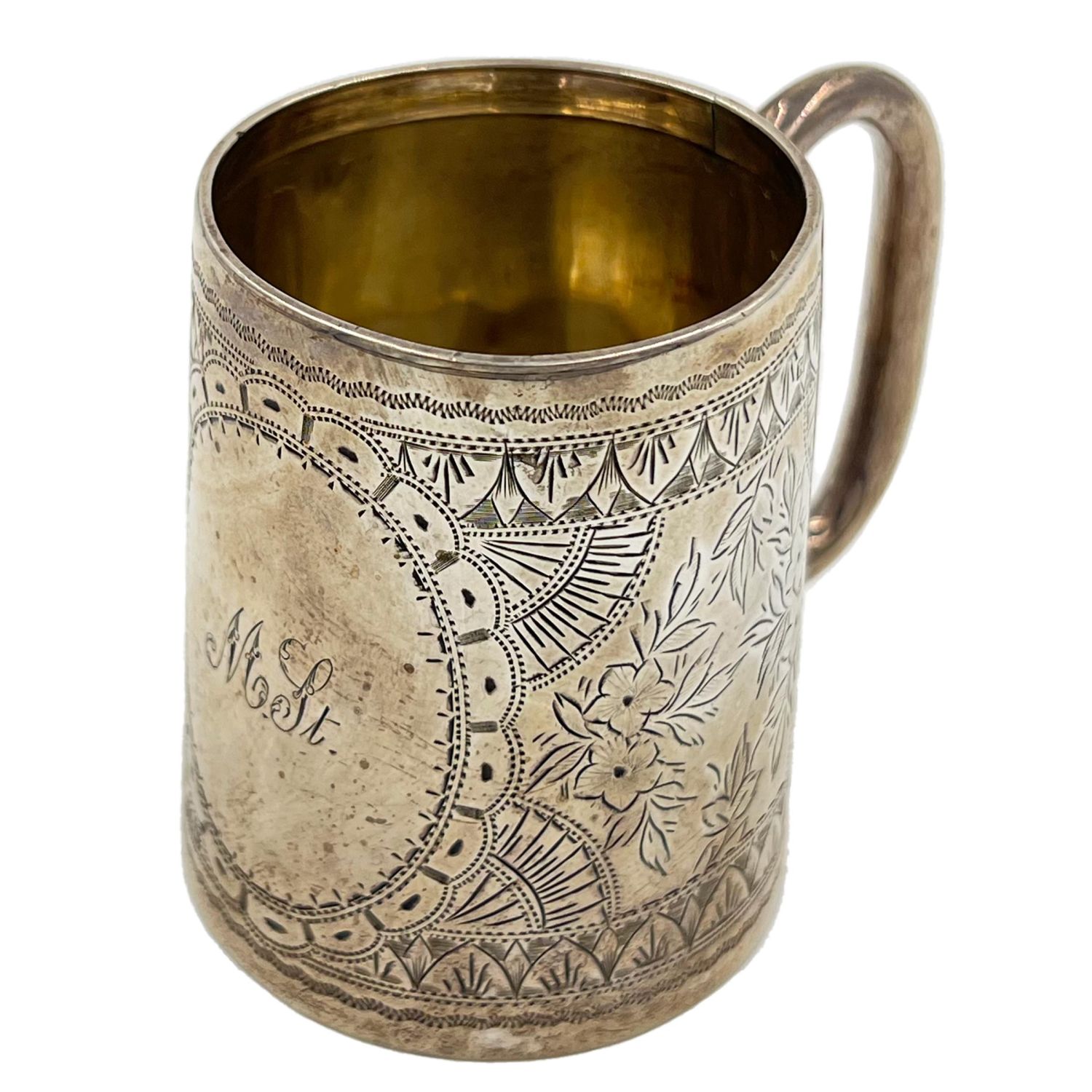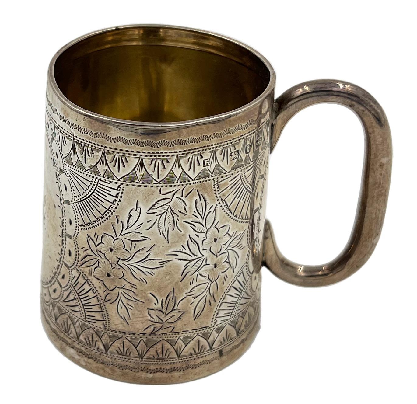A small silver Victorian christening mug with bright cut decoration to body. BIRMINGHAM, PROBABLY HENERY MATTHEWS, 1893
