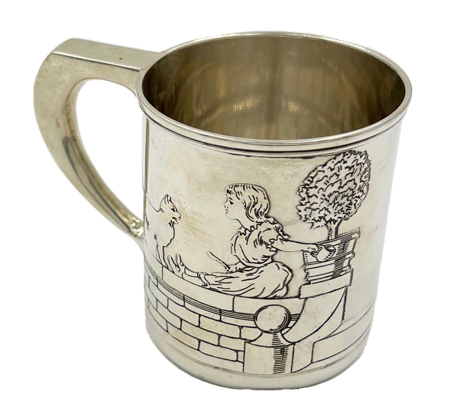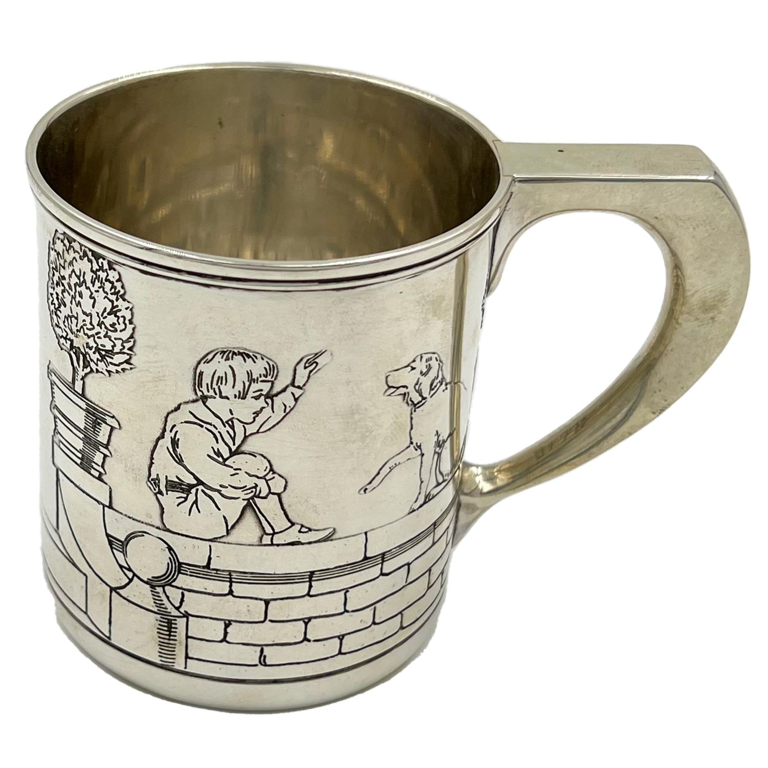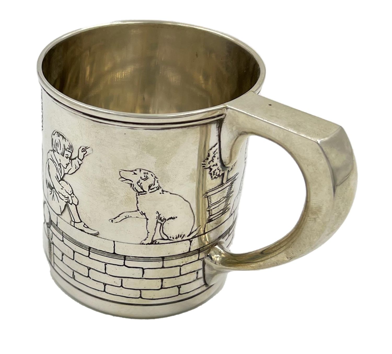 An unusual silver christening mug with an engraved scene of a young boy and a young girl, each playing with a dog.
