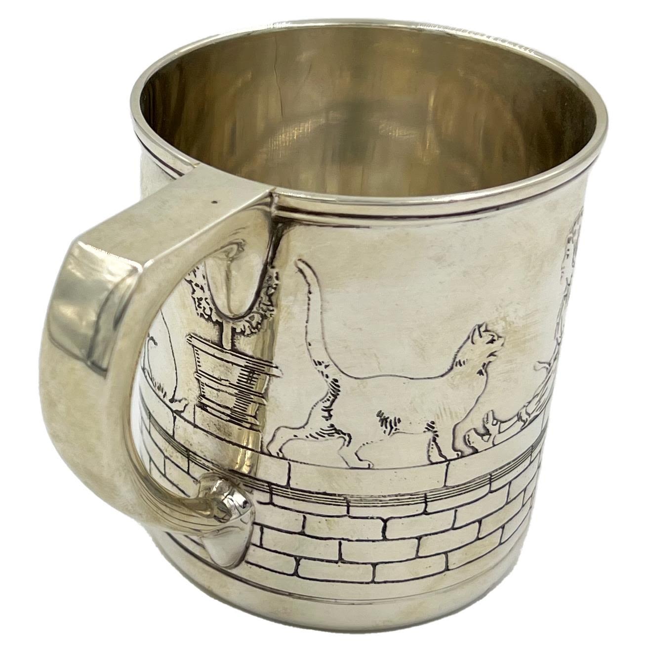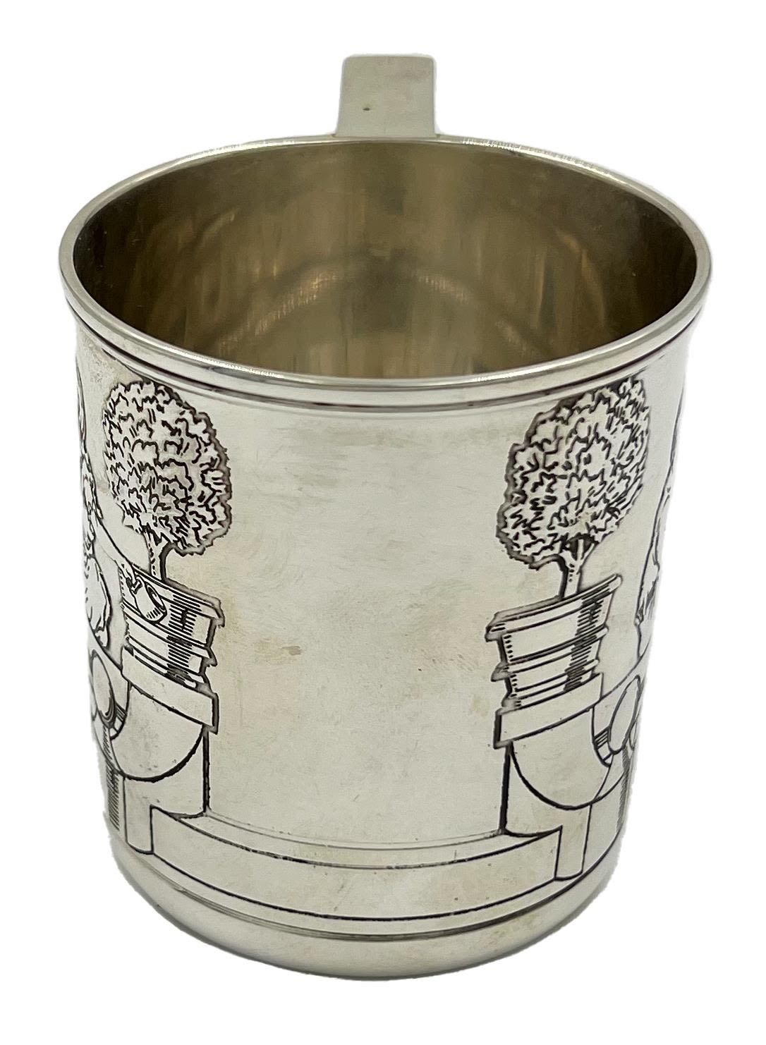 AN UNUSUAL TIFFANY AND CO SILVER CHRISTENING MUG WITH AN ENGRAVED SCENE, EARLY 20TH CENTURY
