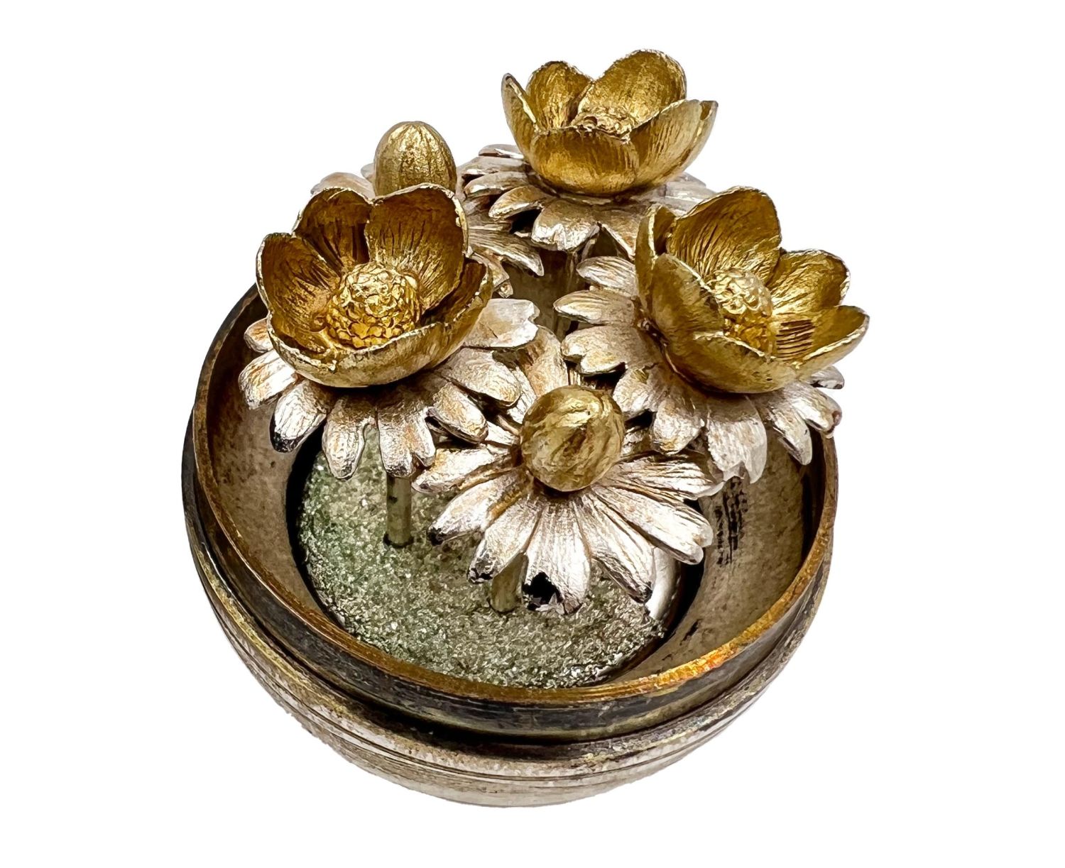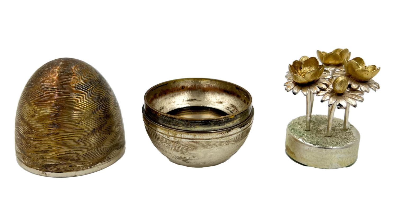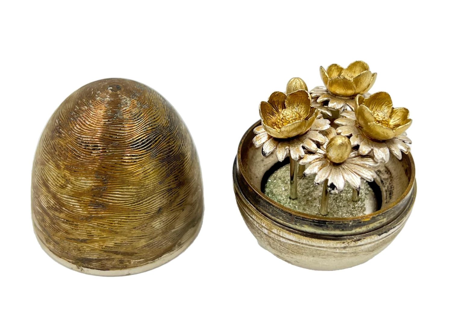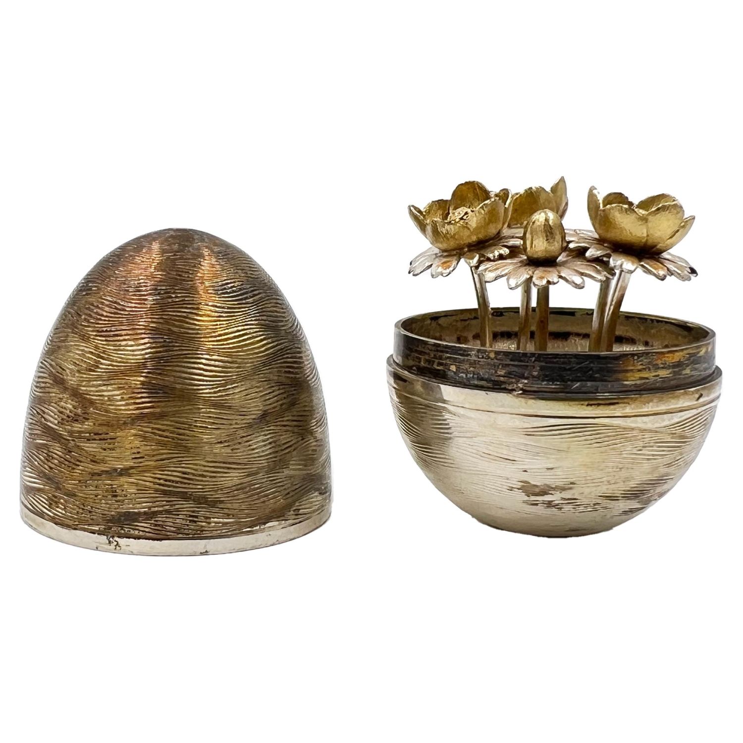 A Nicholas Plummer silver surprise egg that opens to reveal flowers.