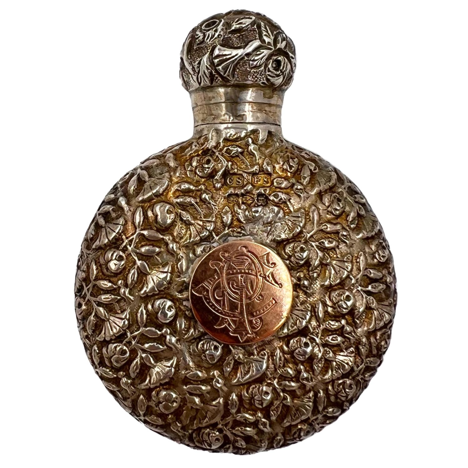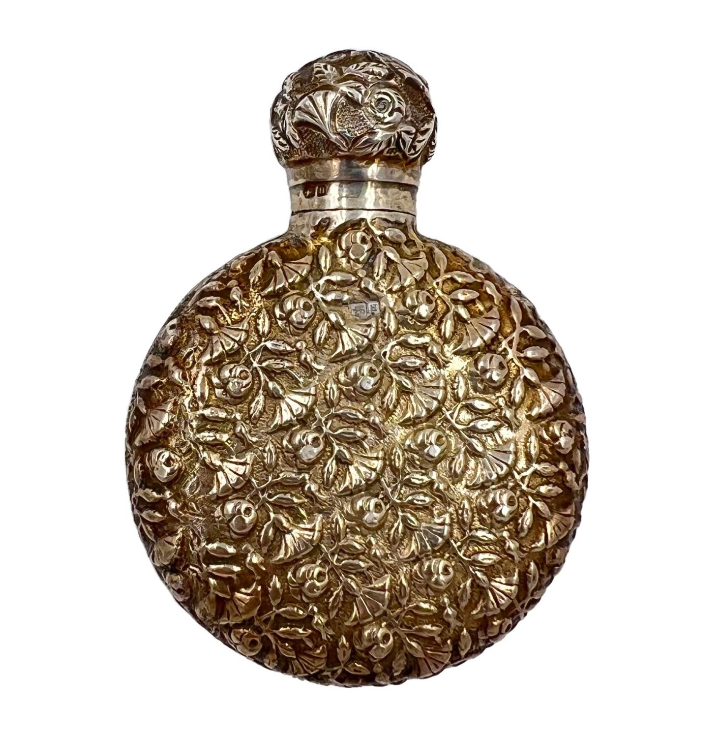 A delightful silver perfume bottle with extensive floral decoration throughout. CHESTER, SAUNDERS & SHEPHARD, 1891