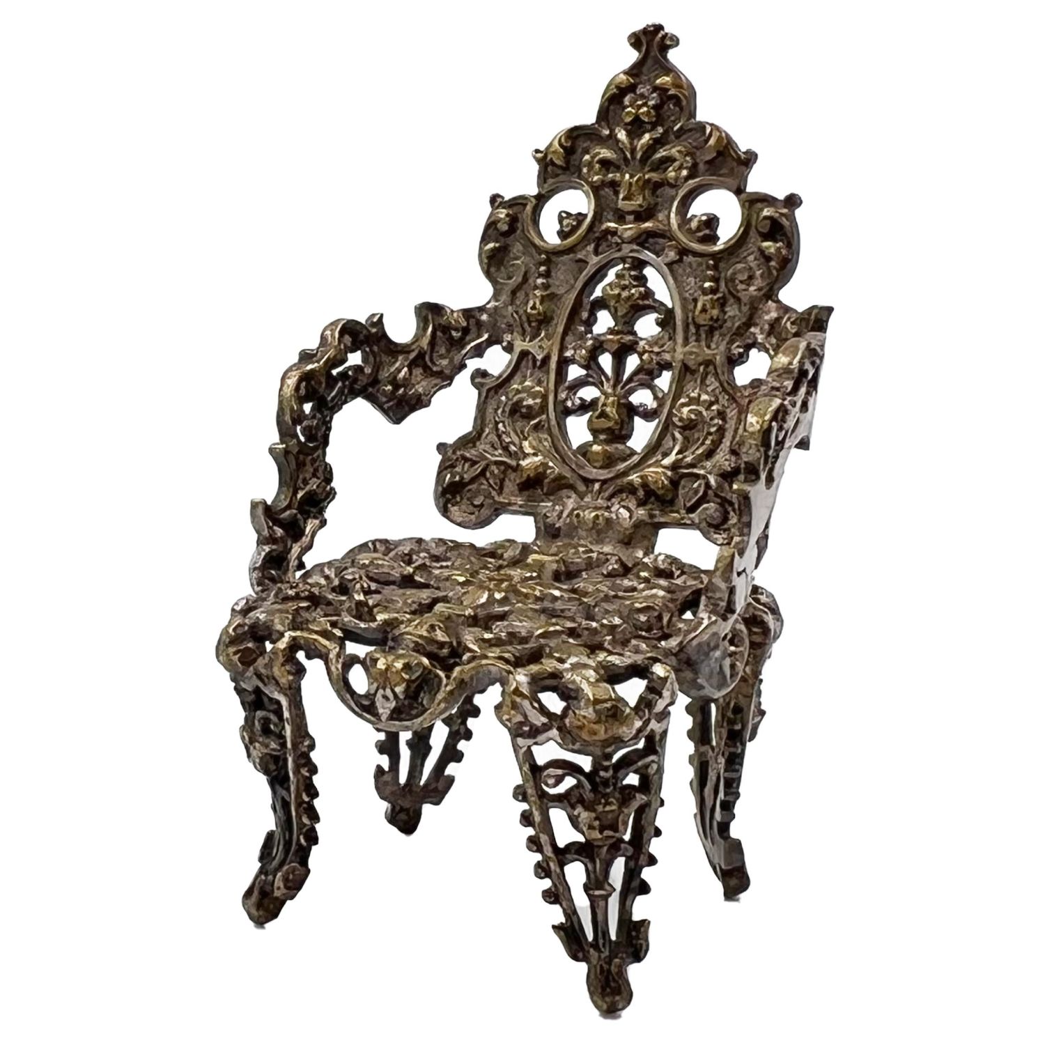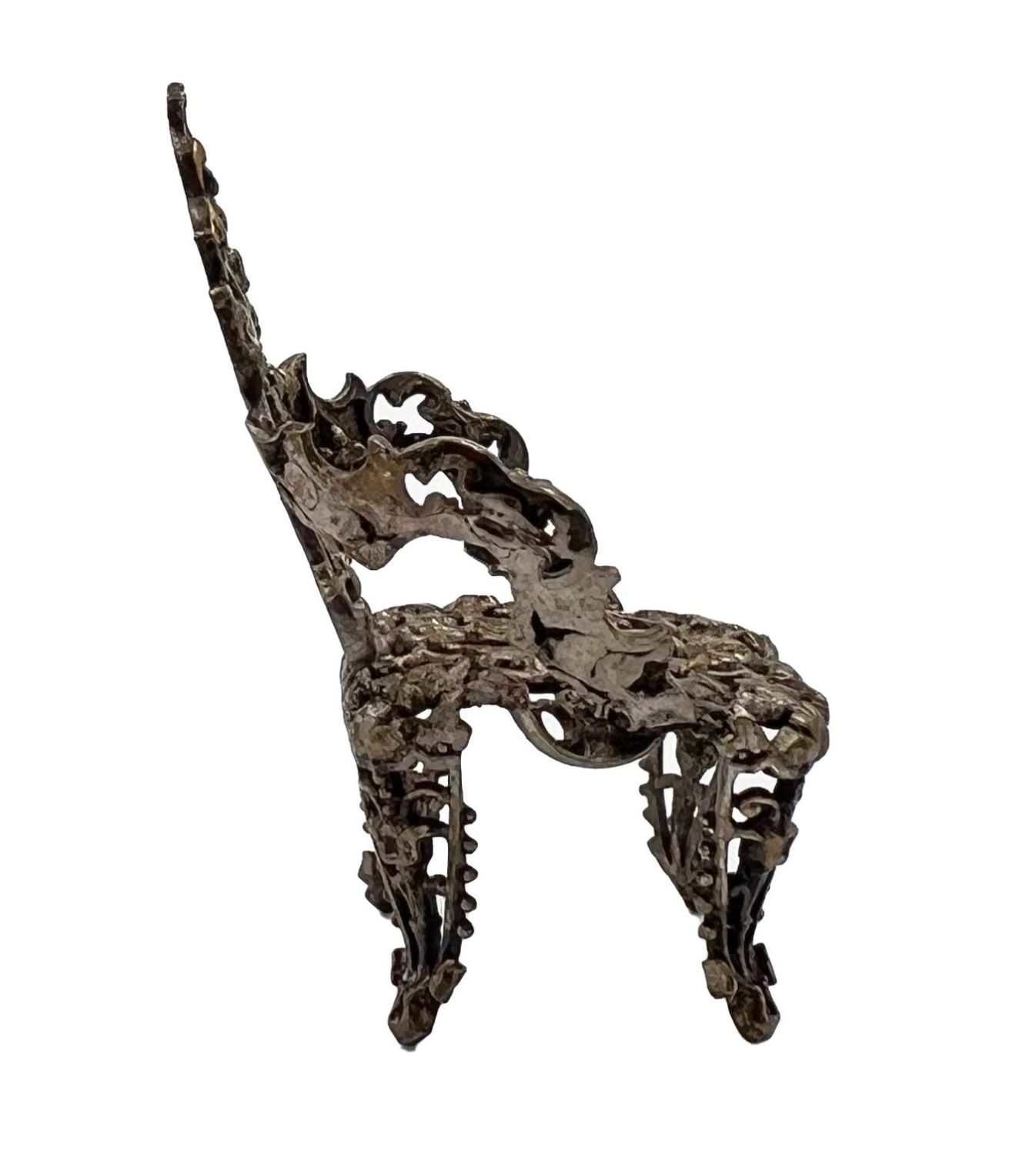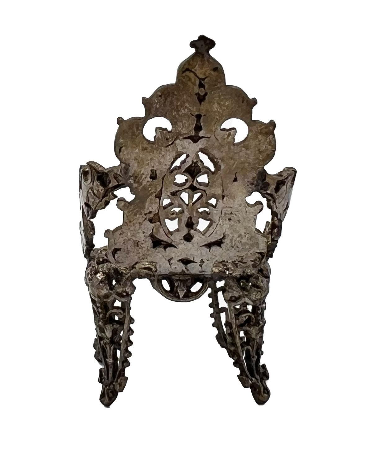 A HIGHLY DECORATIVE NOVELTY SILVER THRONE A highly decorative novelty silver throne. H: 5cm, W: 3cm, Weight: 14g