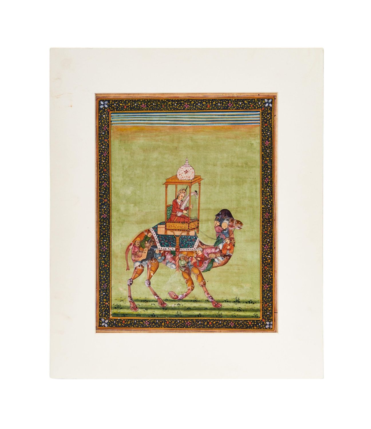 Gouache on paper, the camel composed of densely arranged animals and human figures, ridden by a harpist in a howdah