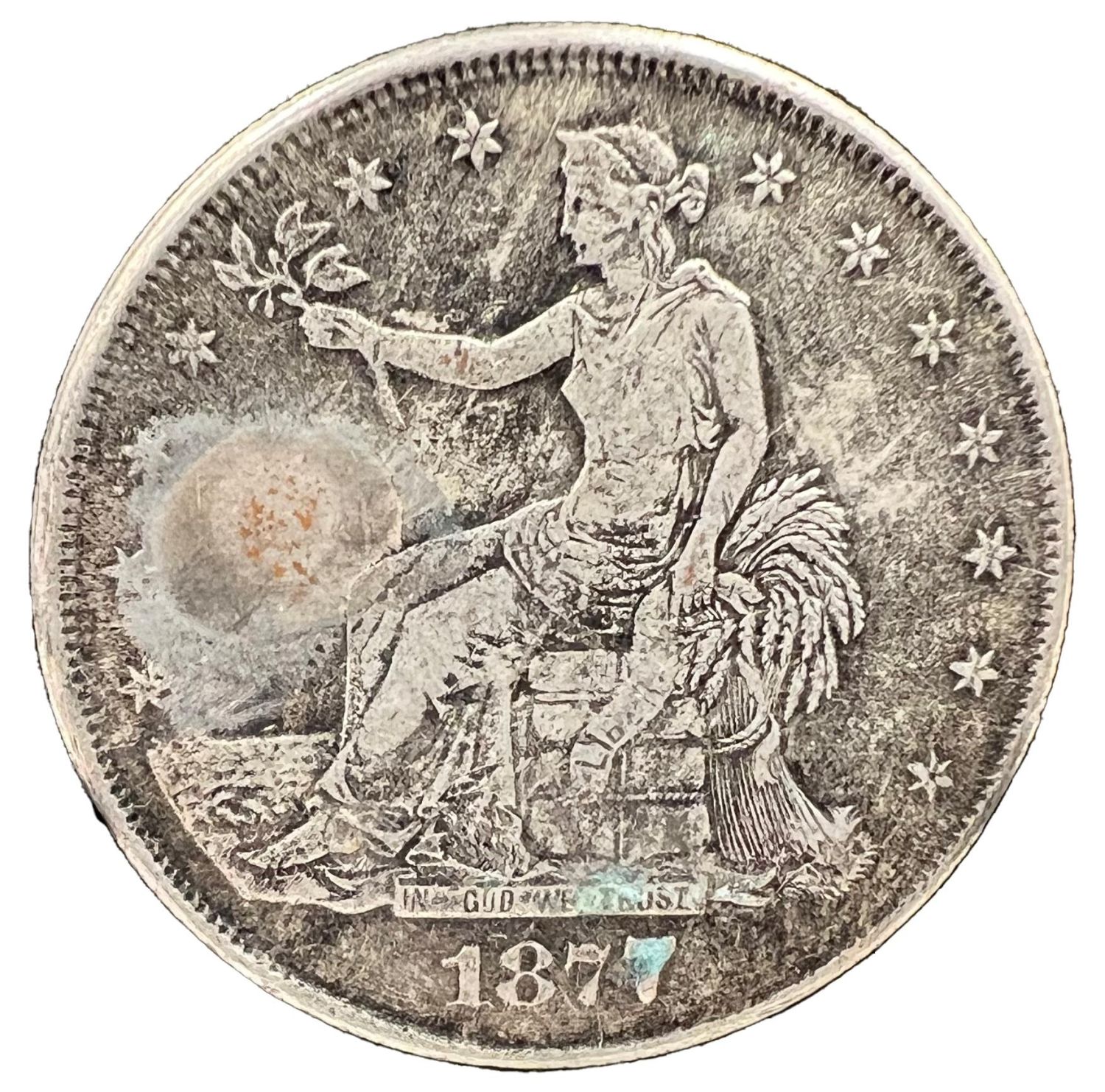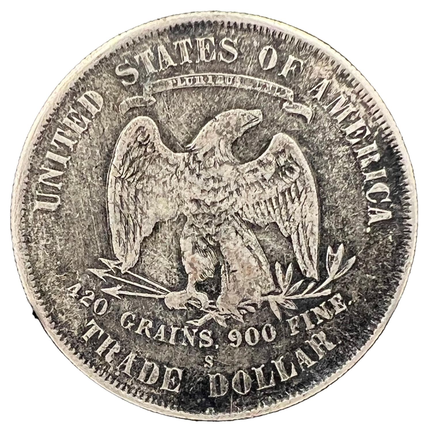 1877 S UNITED STATES OF AMERICA US SILVER TRADE DOLLAR COIN 1877 S United States Of America US Silver Trade Dollar Coin. Diameter: 3.8cm, Weight: 27g
