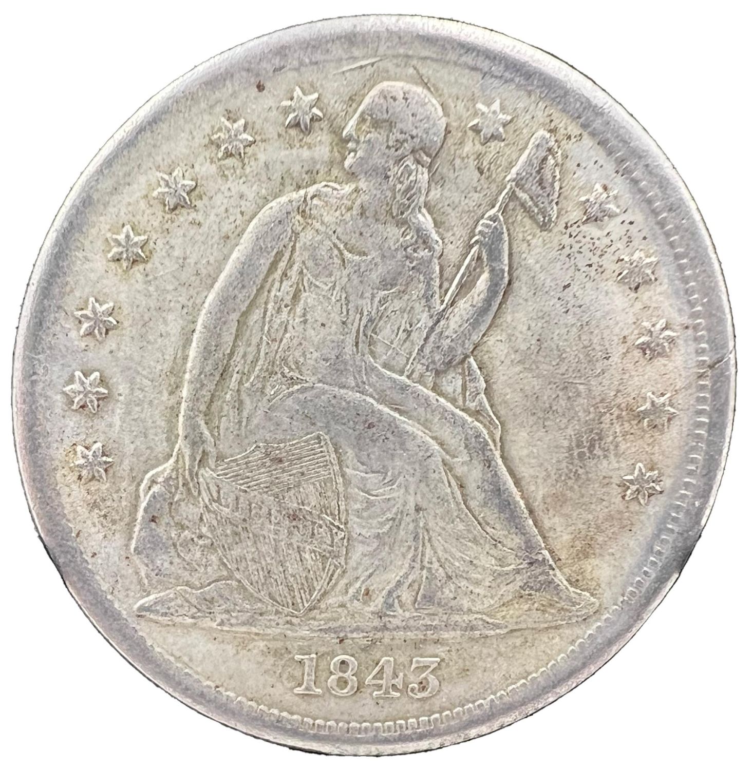1843 O SEATED LIBERTY SILVER US DOLLAR COIN 1843 O Seated Liberty Silver US Dollar. Diameter: 3.7cm, Weight: 19g
