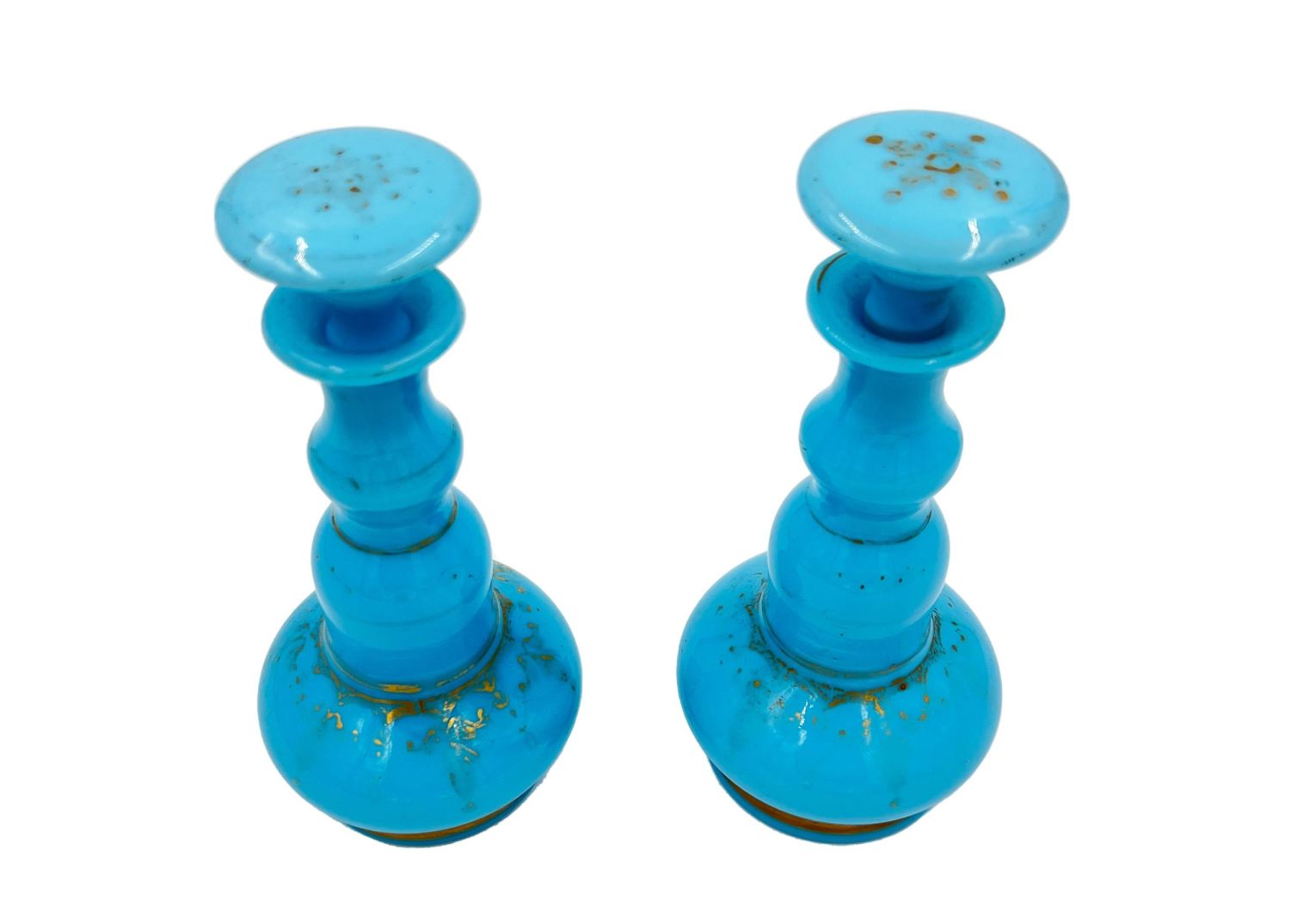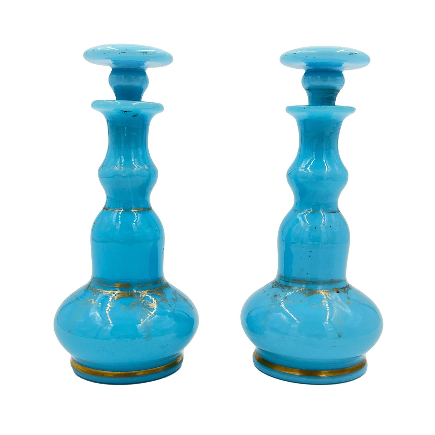 PAIR OF OPALINE ELEGANCE – SKY BLUE OPALINE BOTTLES A pair of sky blue opaline bottles, adding a touch of opulence to your collection. Height: 17cm.