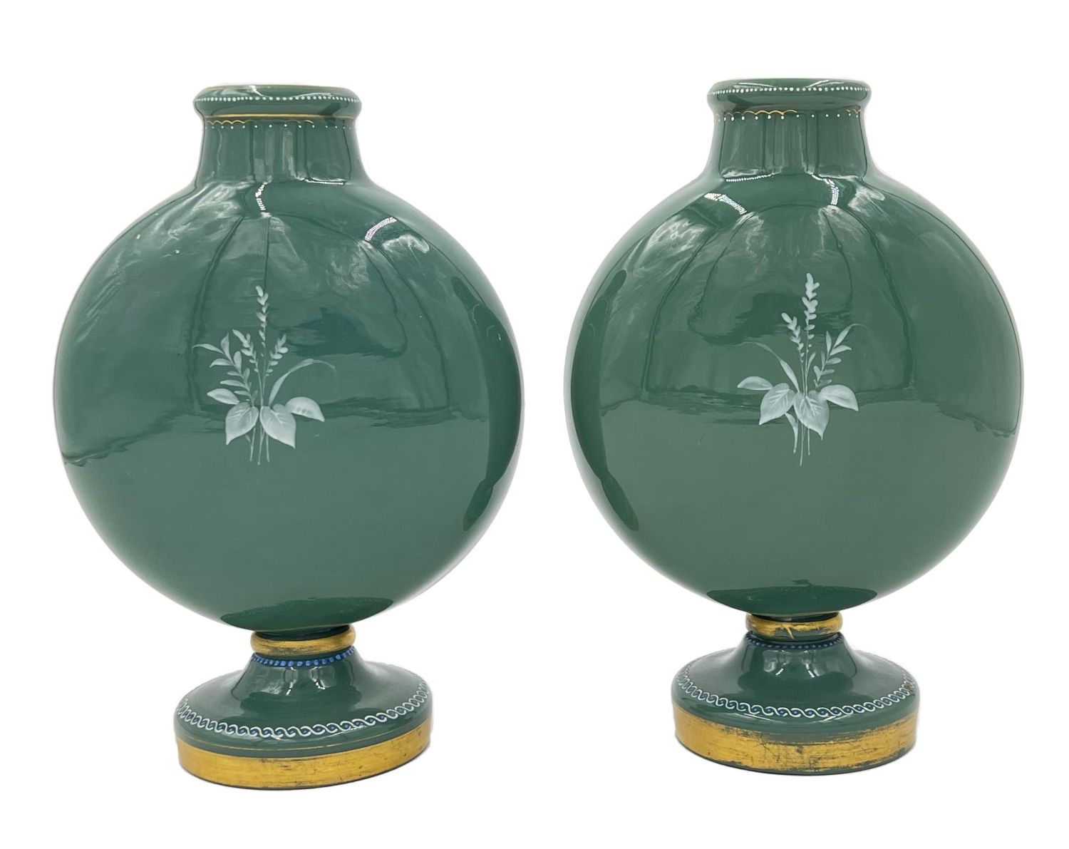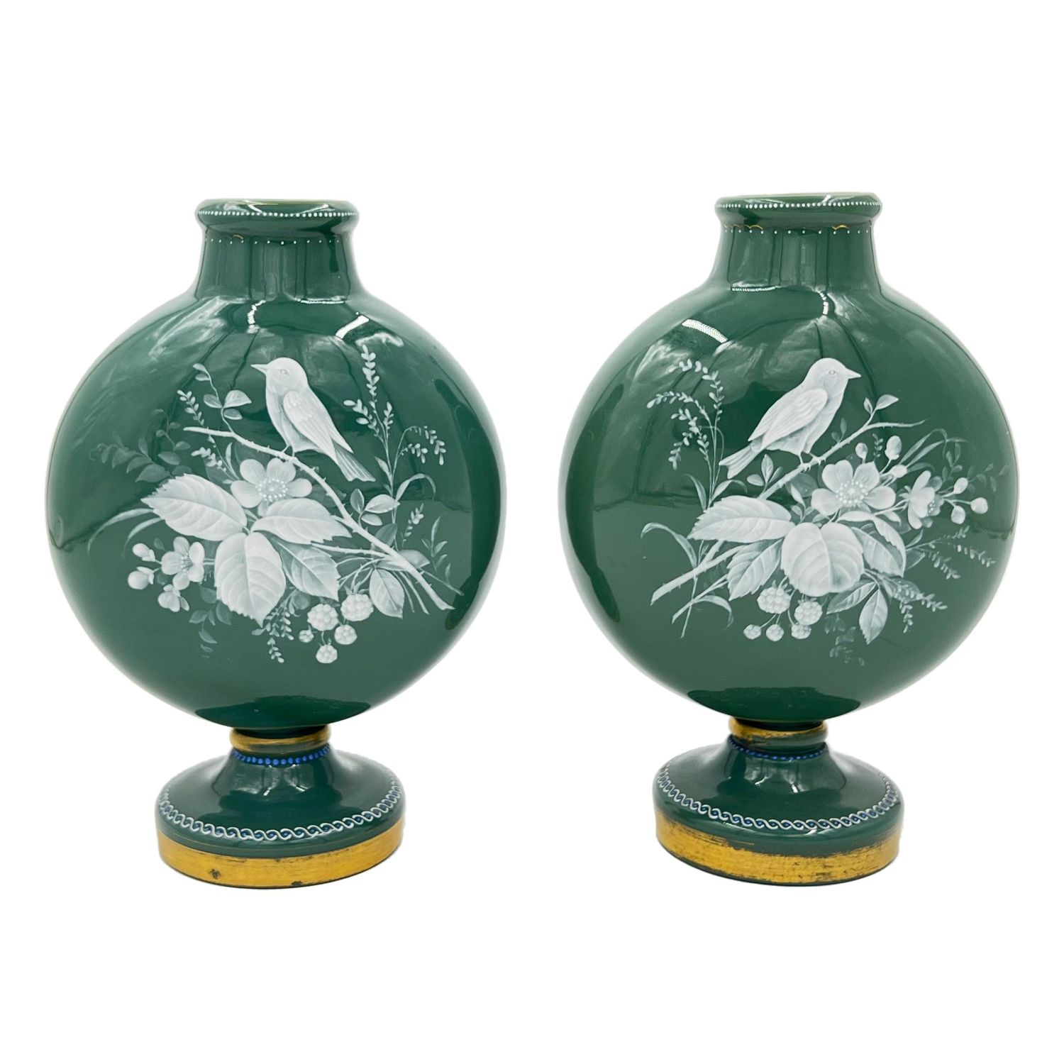 BIRDS AND LEAVES: PAIR OF OPALINE VASES Delight in the beauty of nature with this pair of opaline vases decorated with birds and leaves, each standing at 23cm.