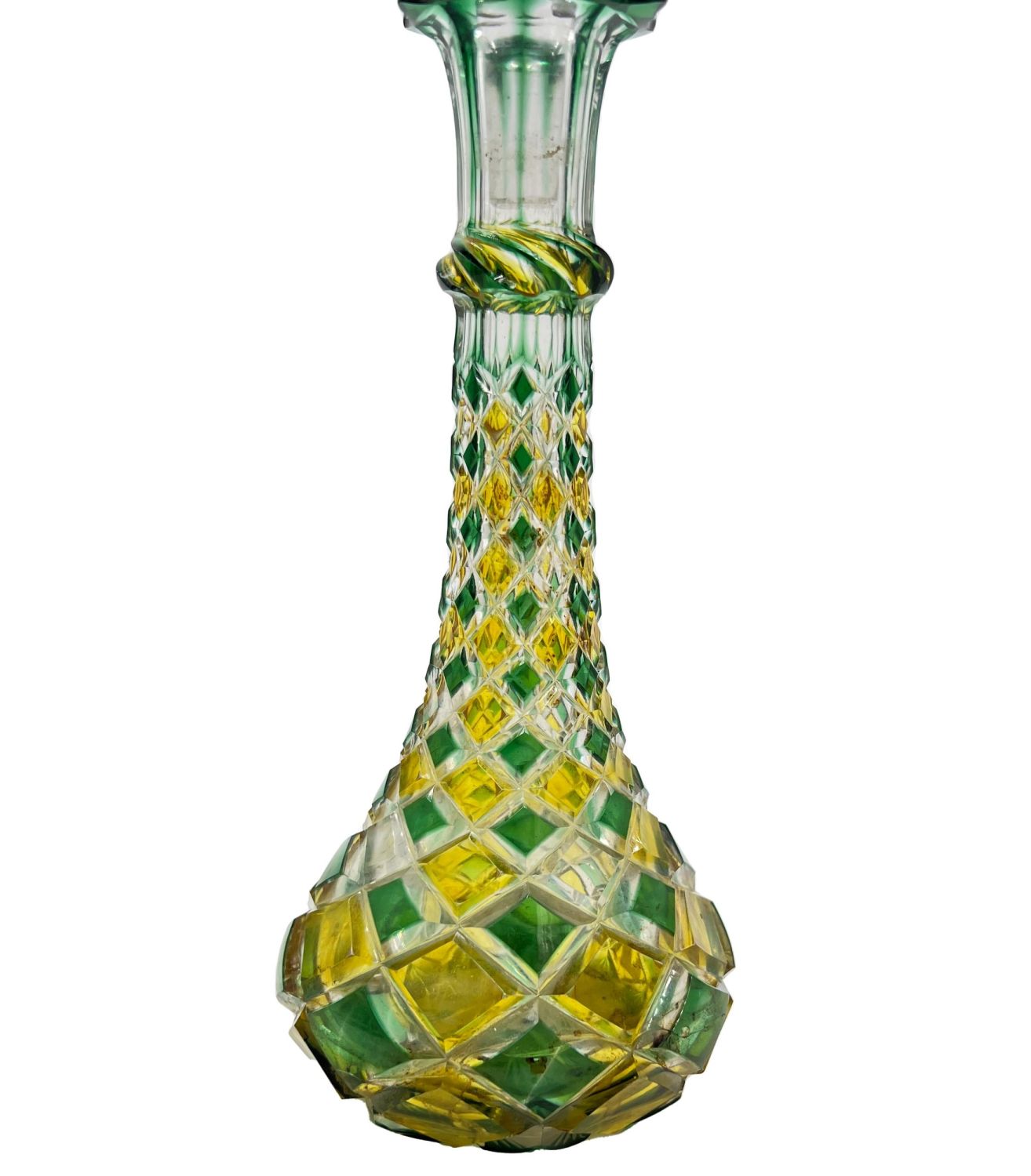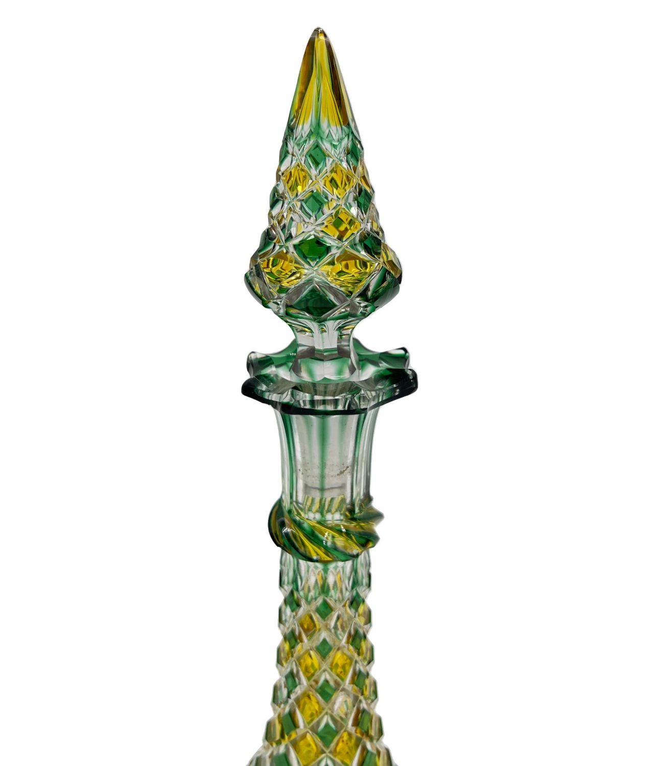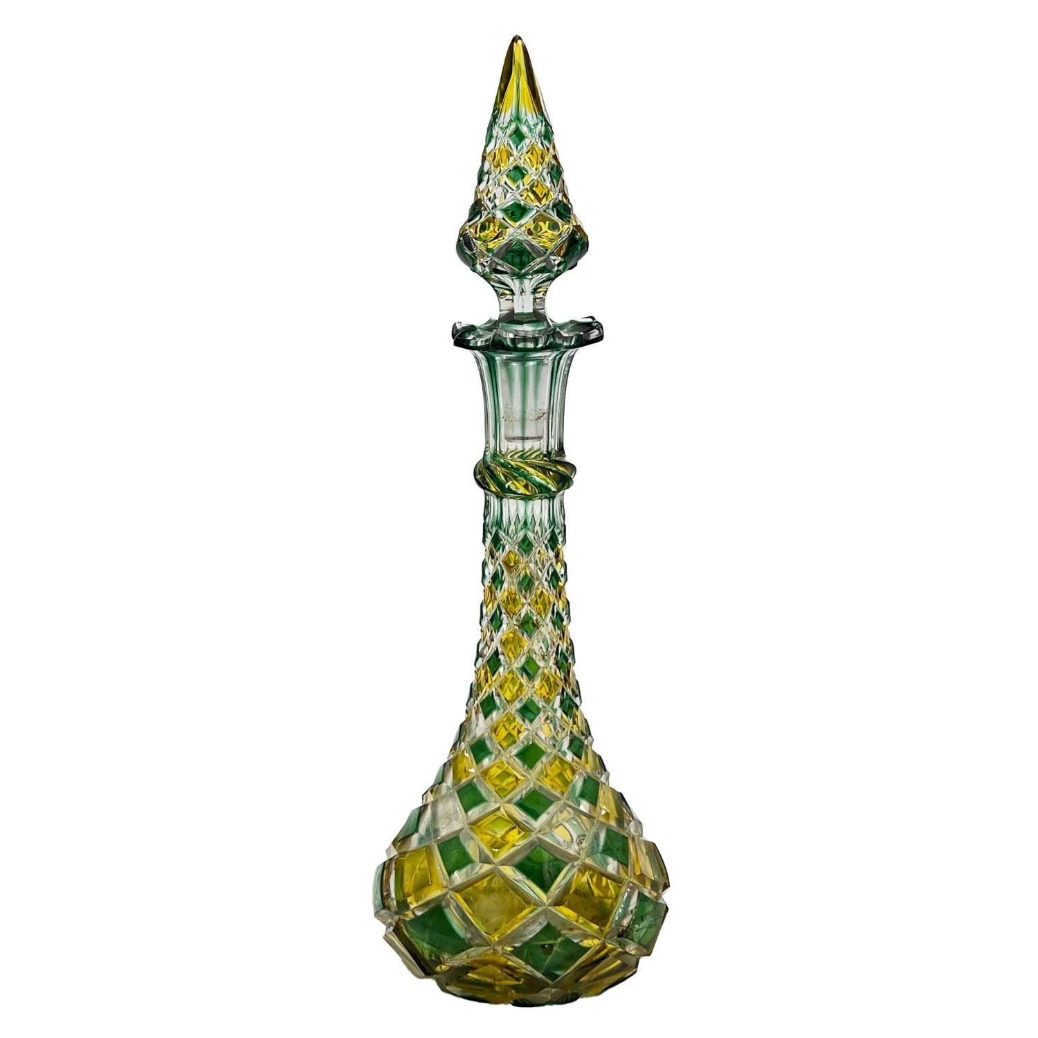 MULTI-COLOURED BOHEMIAN GLASS BOTTLE A vibrant Bohemian glass bottle boasting a mesmerizing array of colours, standing at 30cm tall.