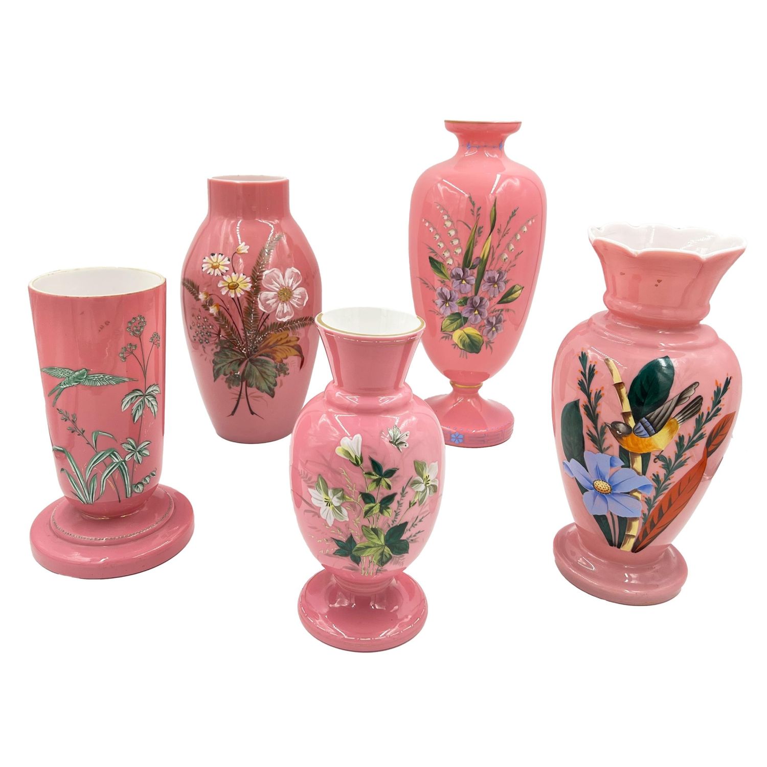 GROUP OF FIVE PINK OPALINE GLASS VASES Collection of five pink opaline glass vases, ranging in height 42cm, 34.5cm, 34cm, 28cm and 27.5cm.