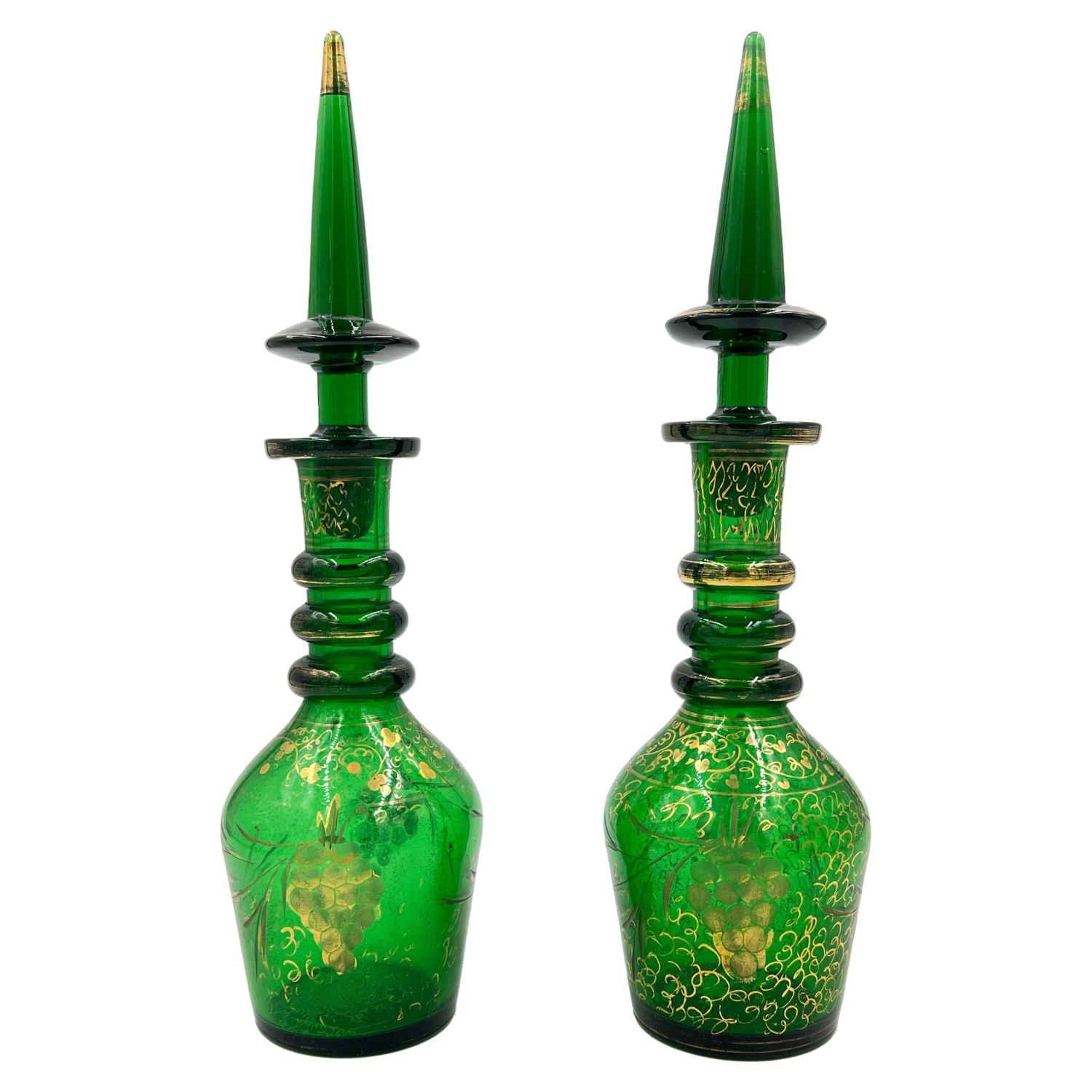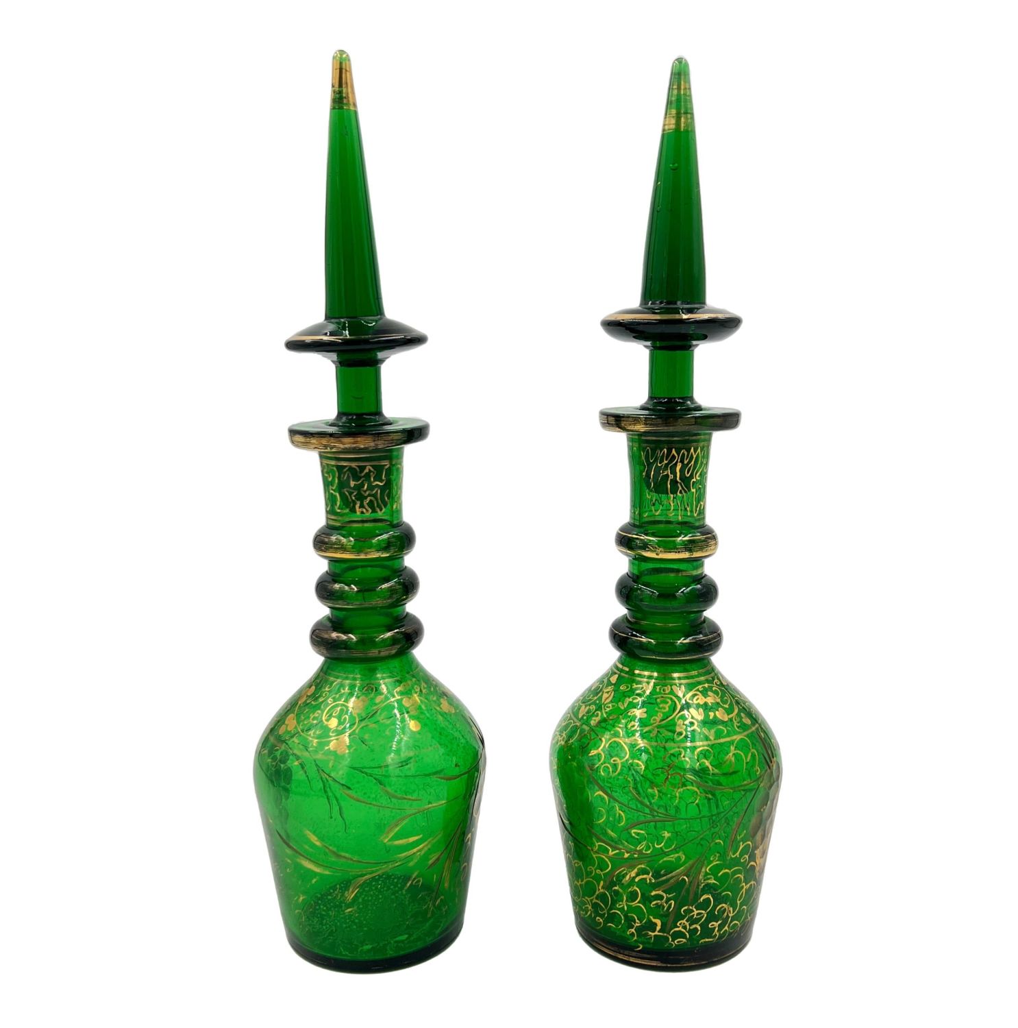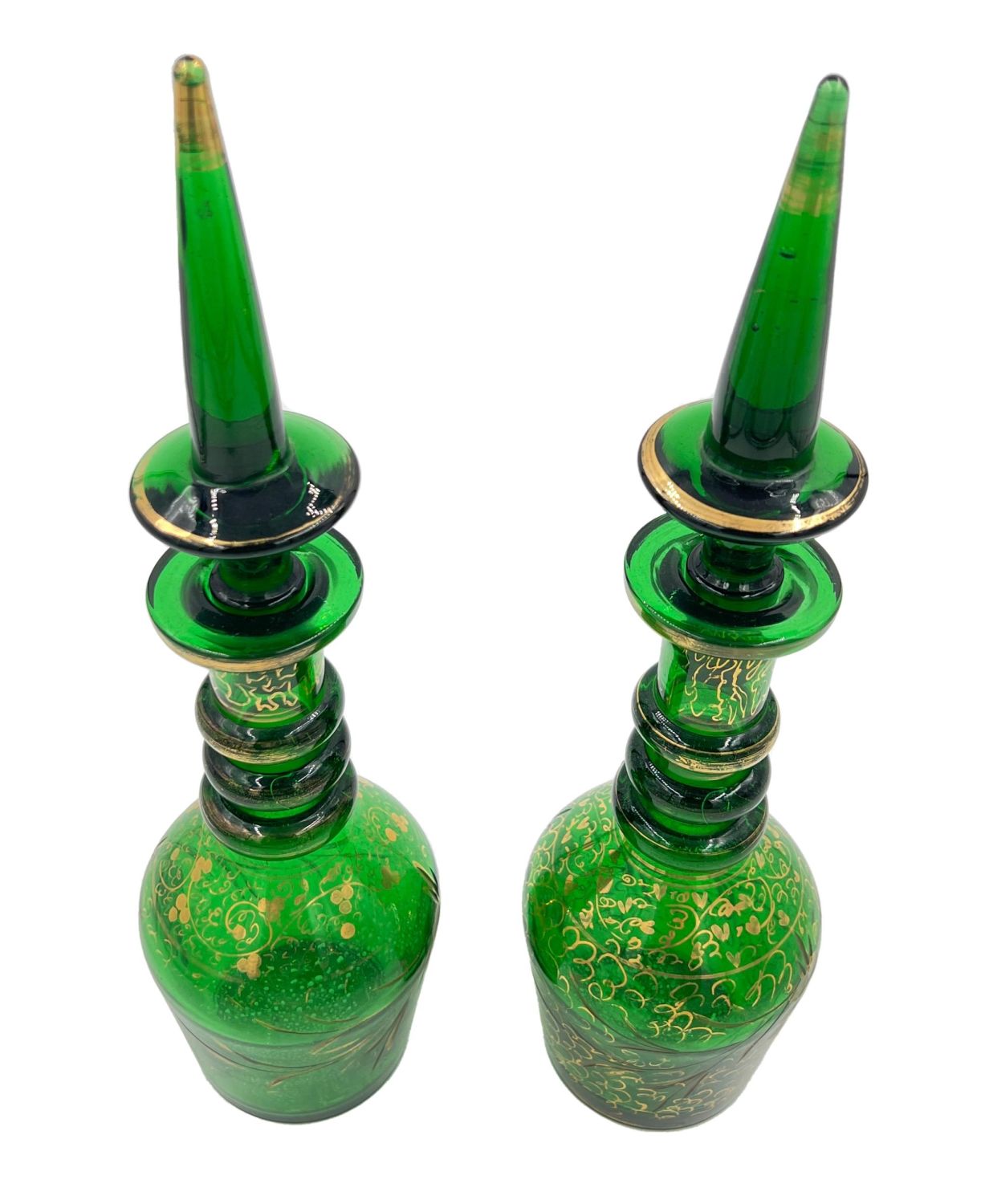 PAIR OF GREEN GLASS DECANTERS A pair of elegant green decanters, each standing 37cm height.