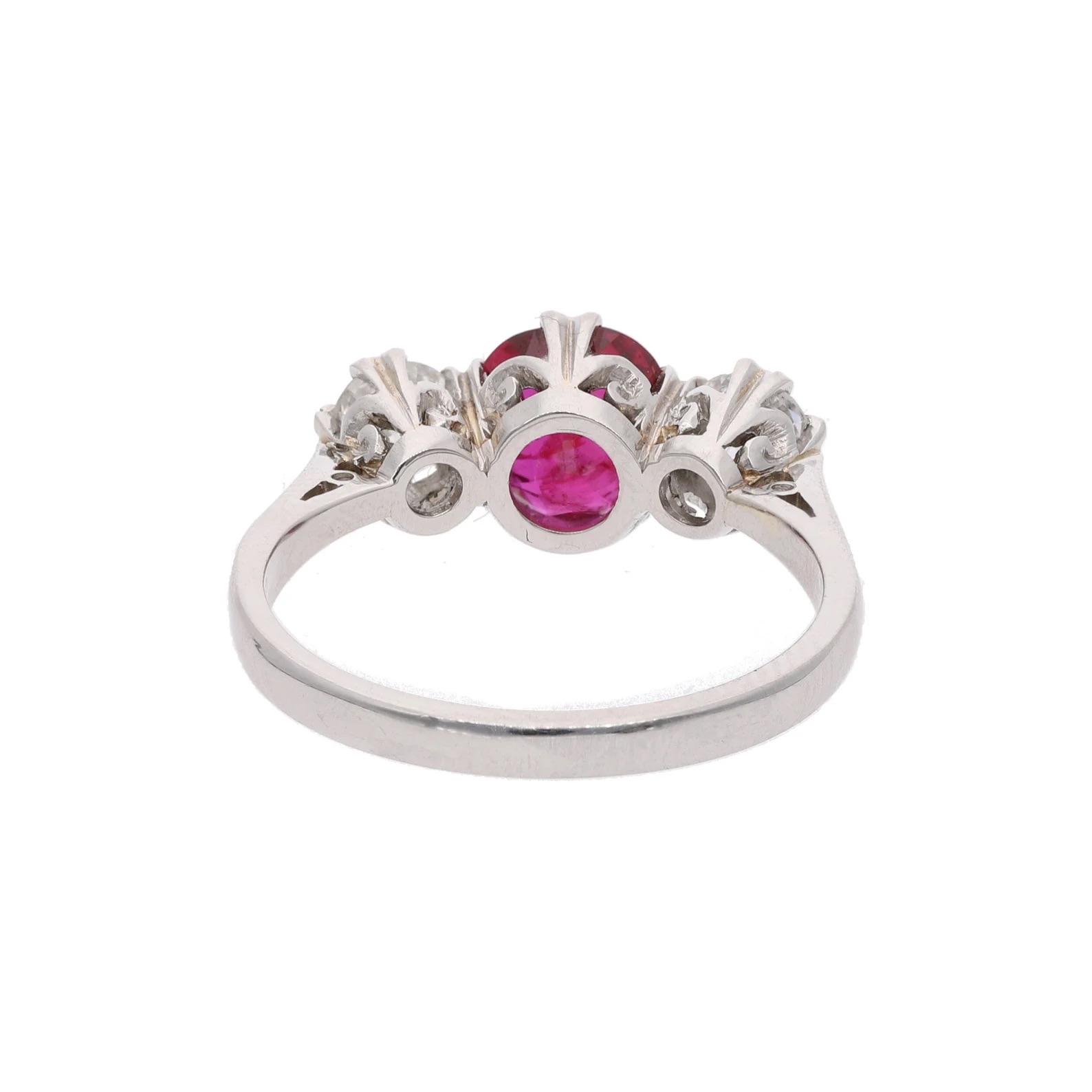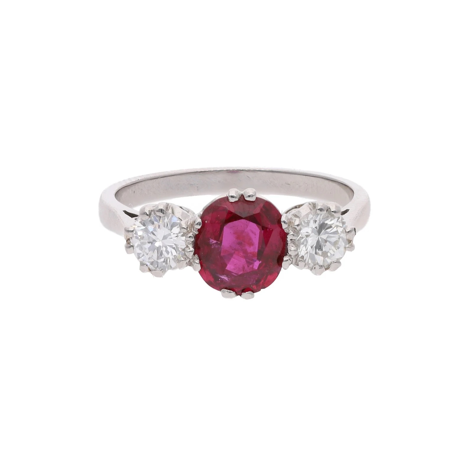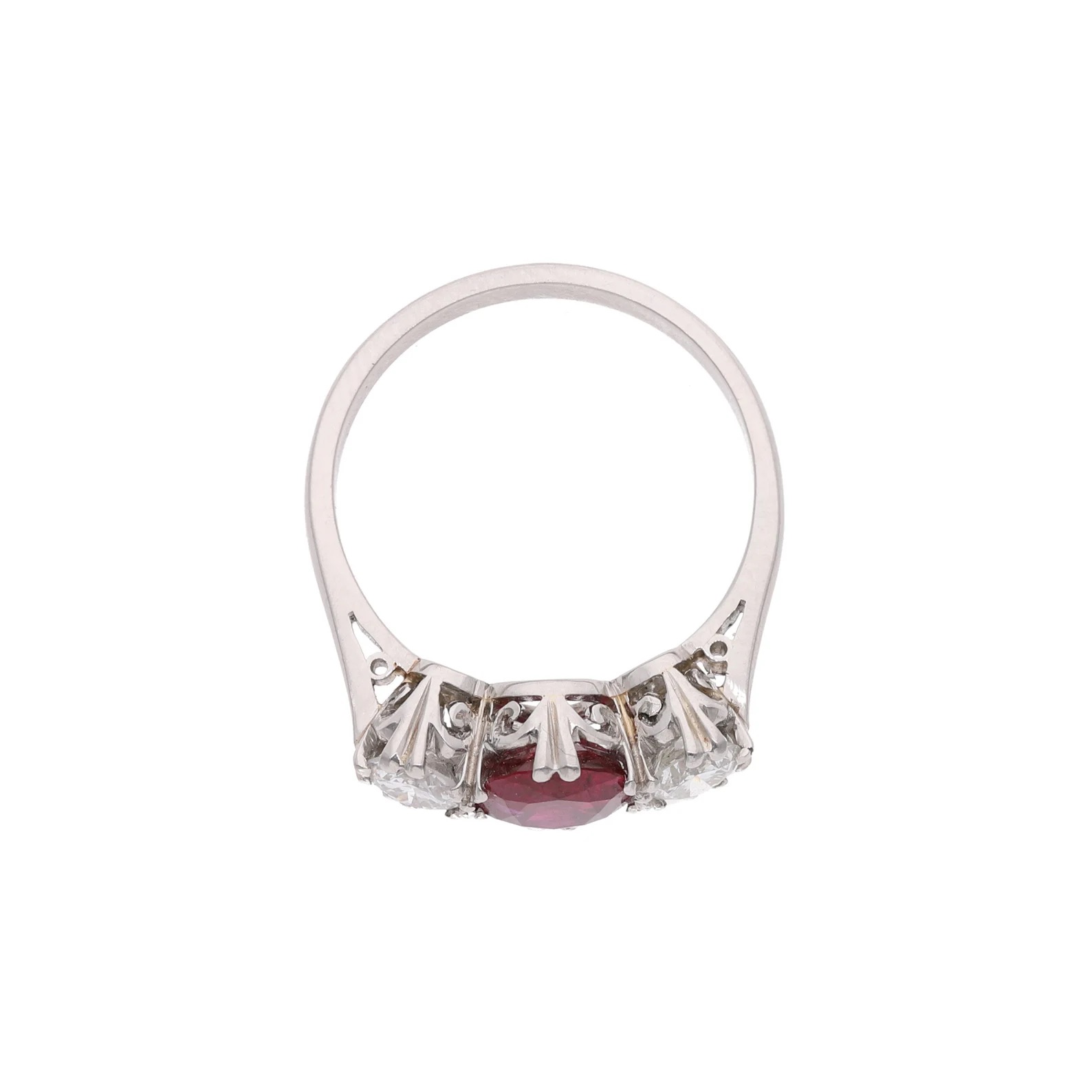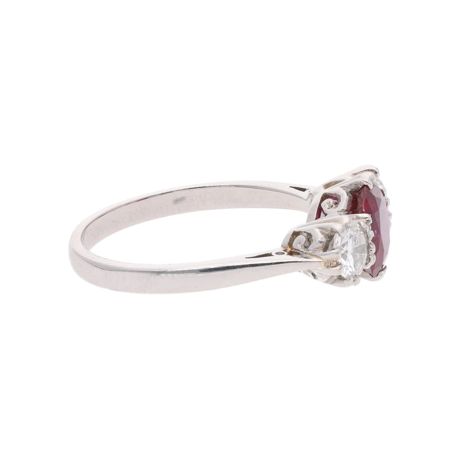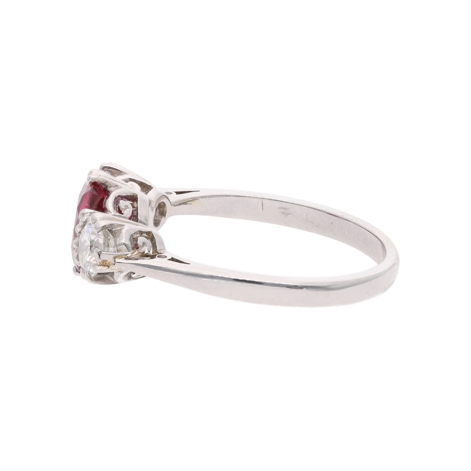 A platinum ring set with a central ruby weighing in at 1.15ct and two round cut diamonds weighing in at 0.54ct in total. (sh93/92)