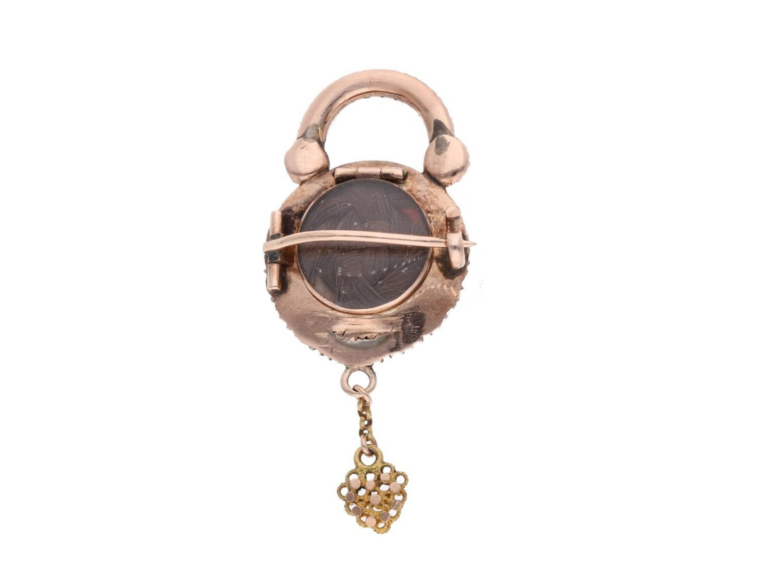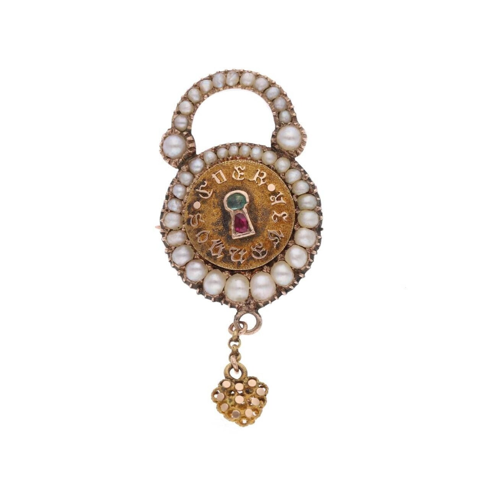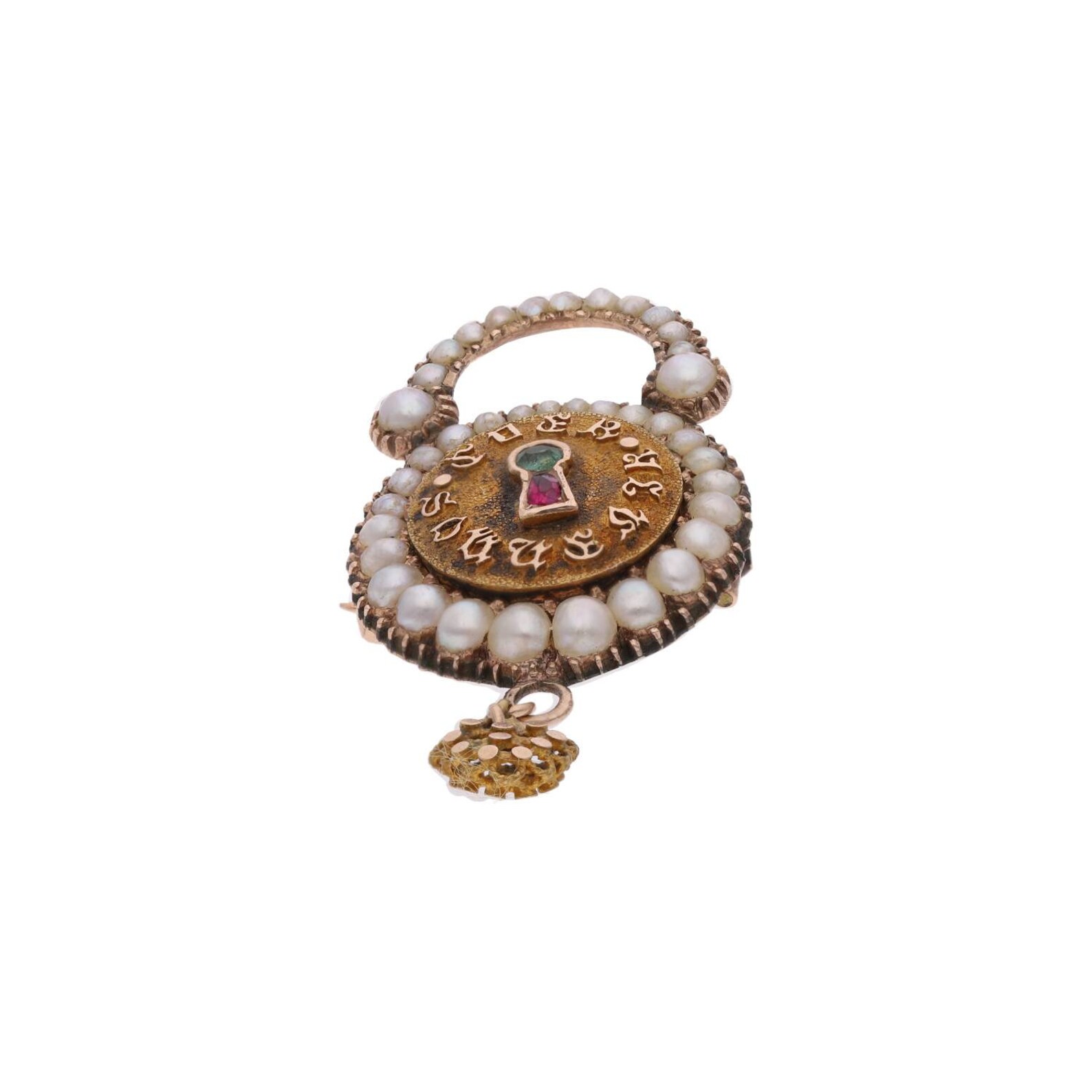 Antique 9ct Rose Gold Pearl, Emerald and Ruby Padlock Brooch.