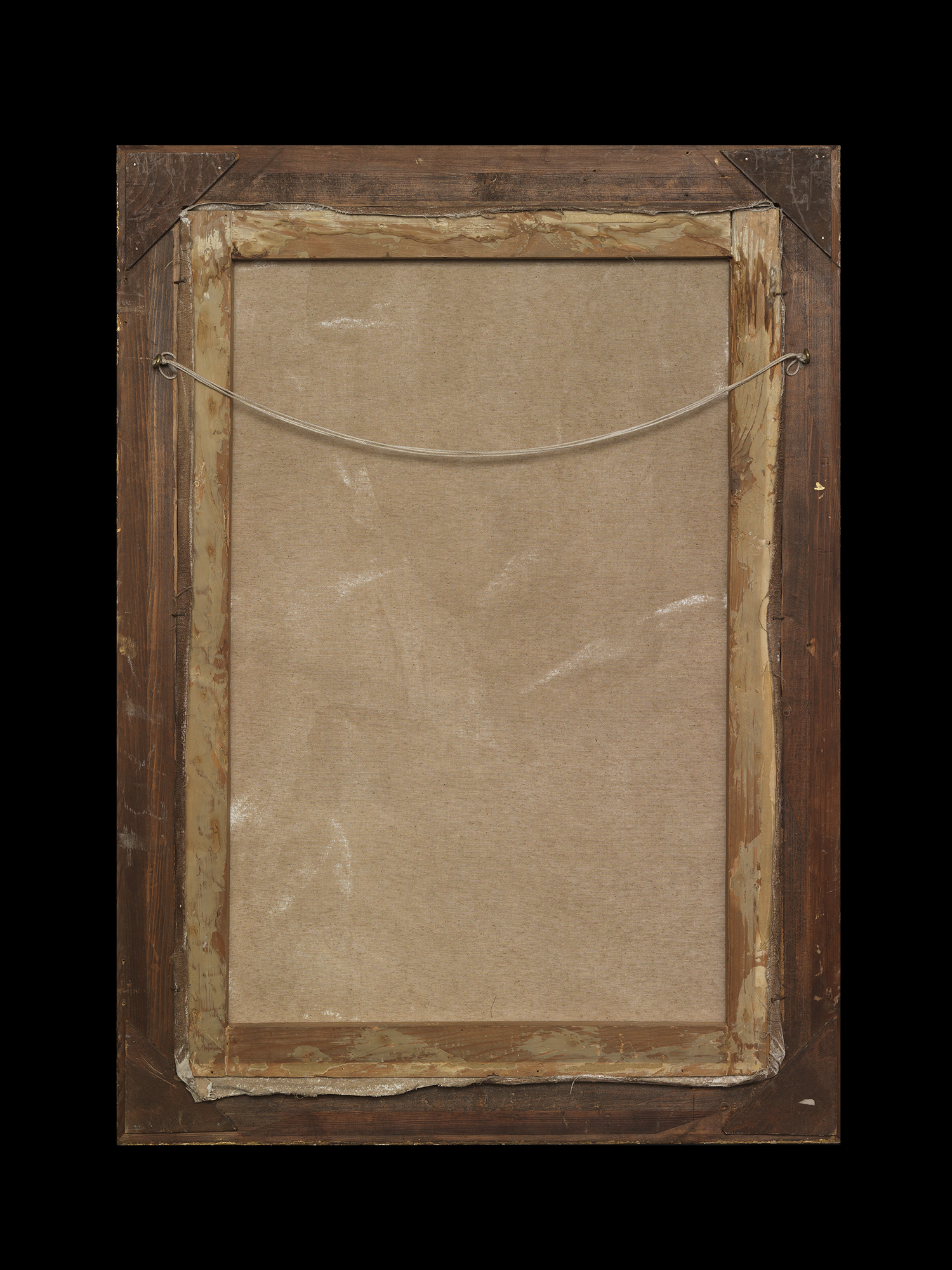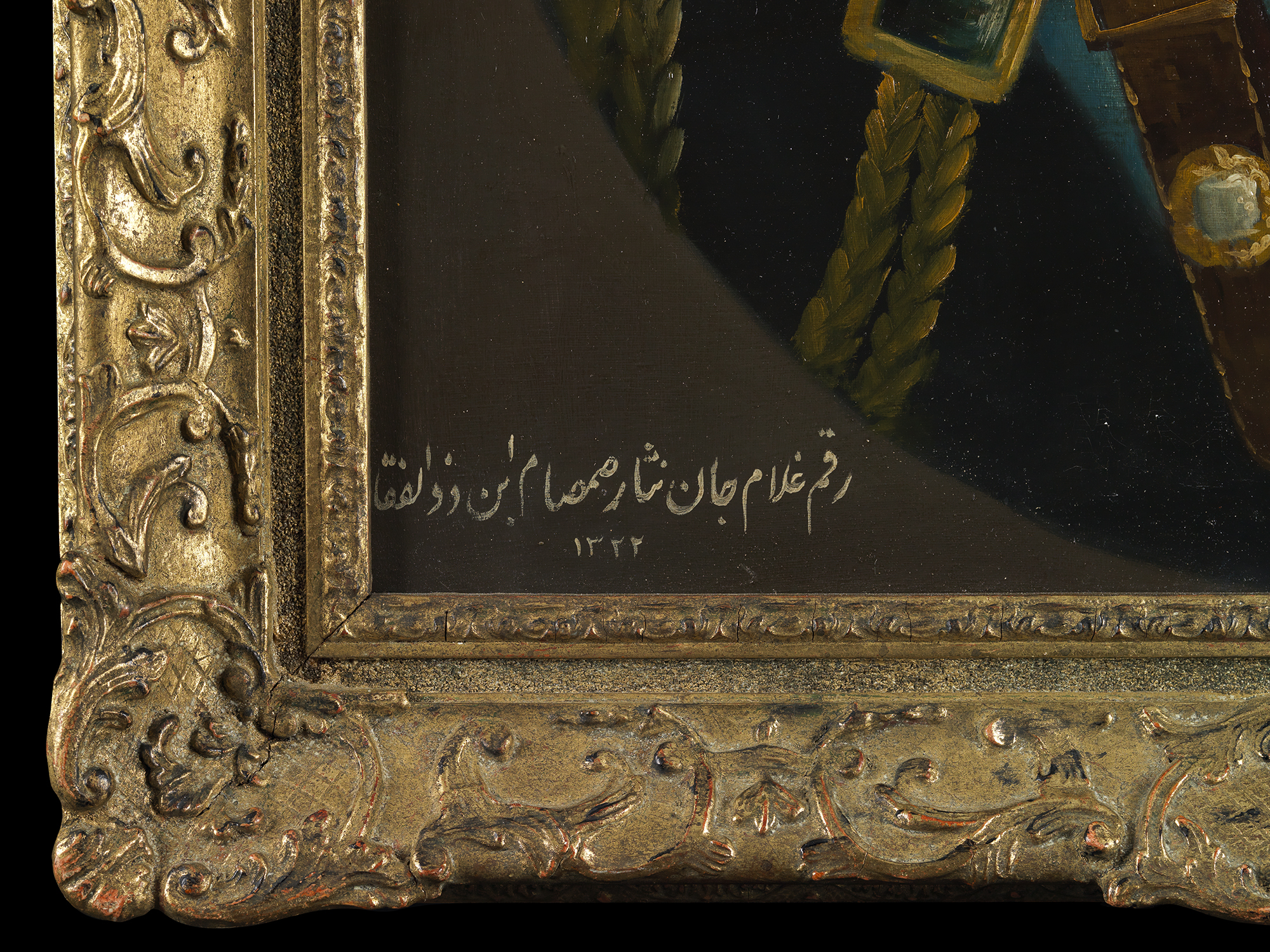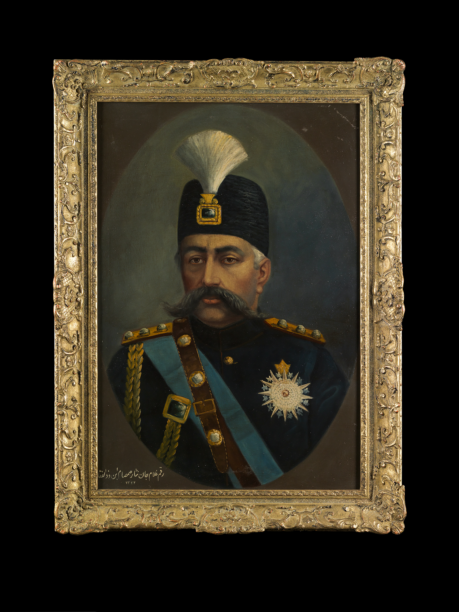 Oil on canvas painting in a gilded frame depicts Muzzafar Aldin, dated 1322 AH / 1904 AD, with an inscription in Nasta’liq lower left.