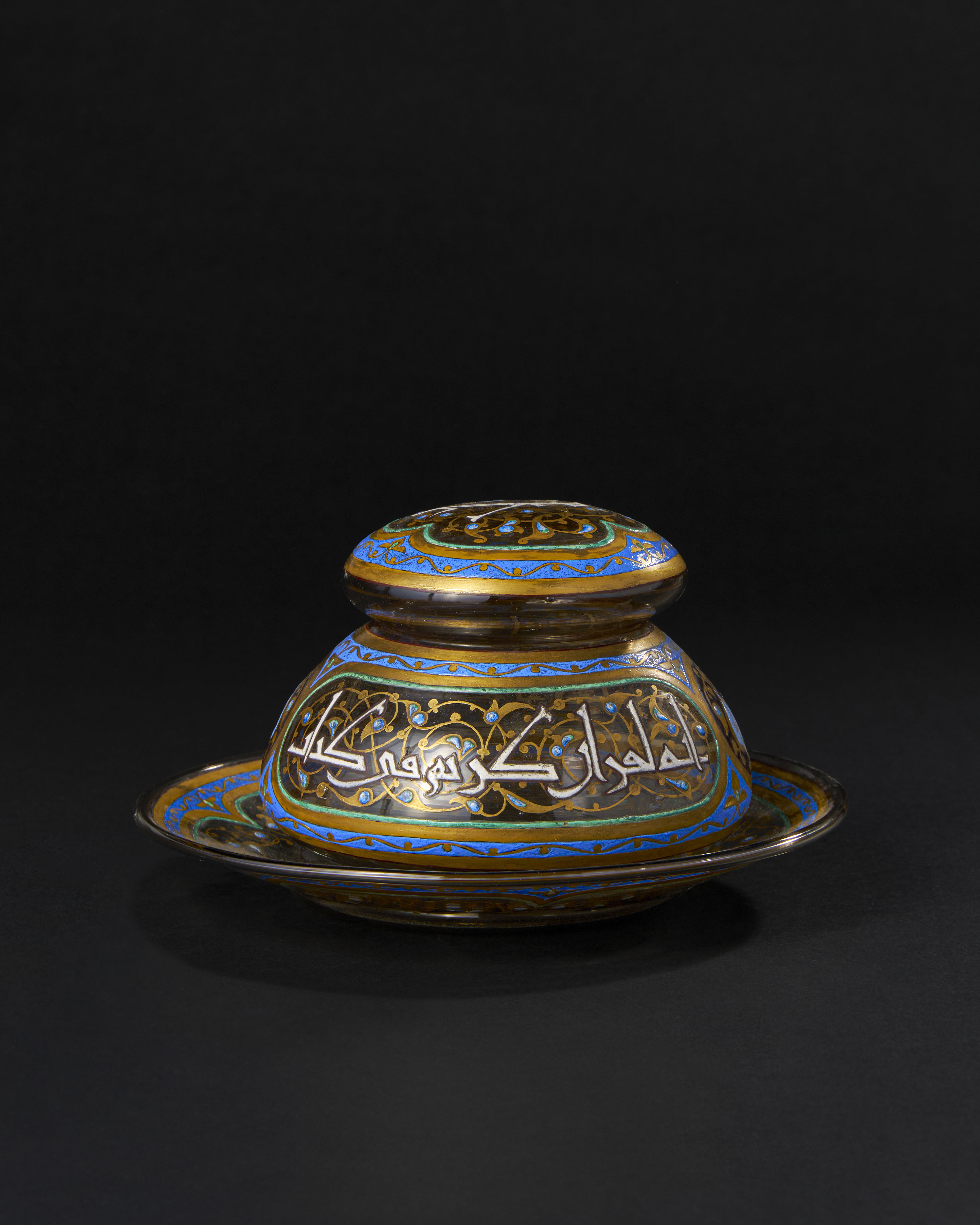 The jar is adorned with intricate enameled decorations, featuring vibrant blue and gold hues that form elegant arabesque patterns and calligraphic inscriptions.