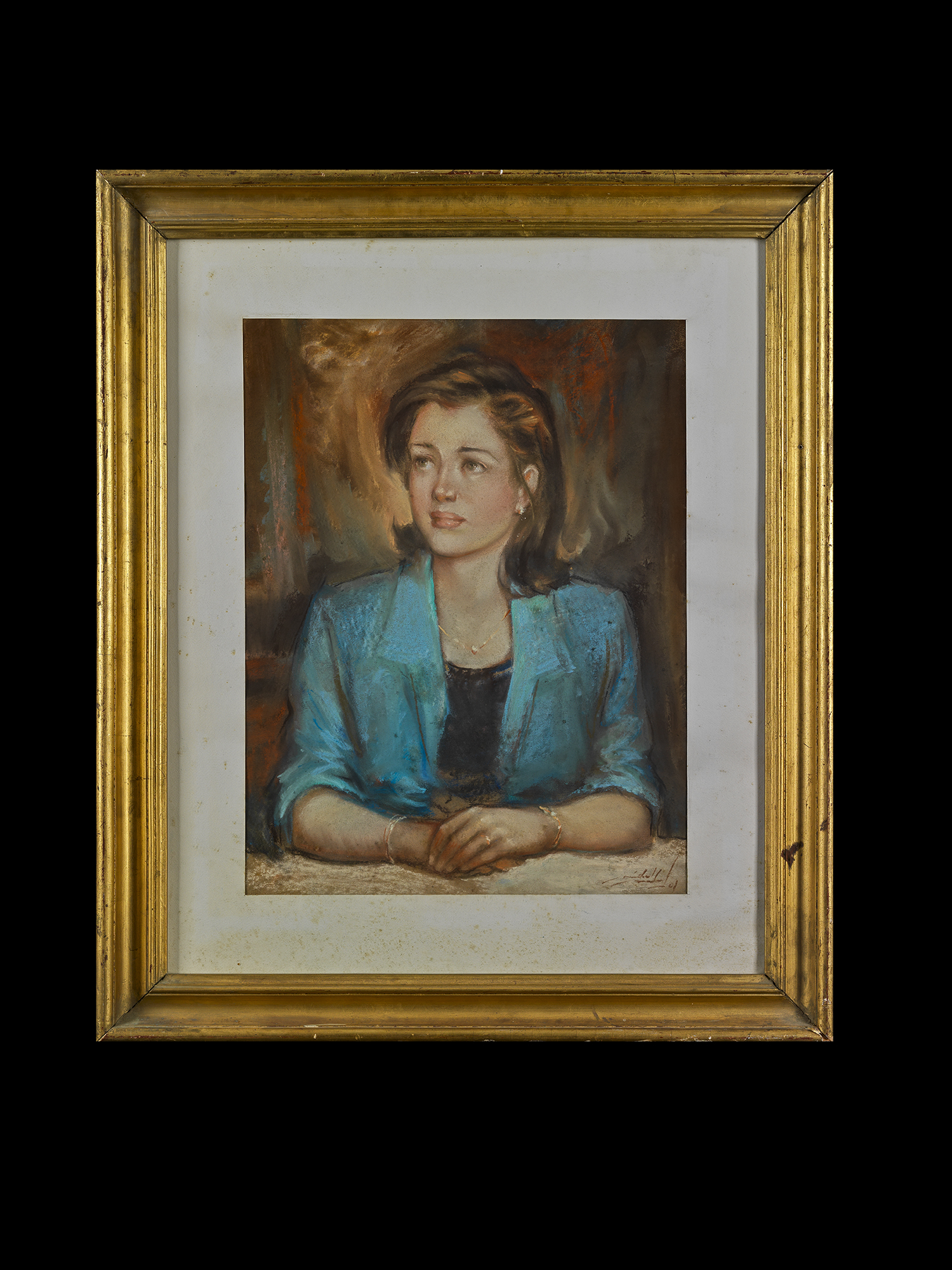 The painting depicting a women wearing a blue jacket sitting down at a table, signed lower right.