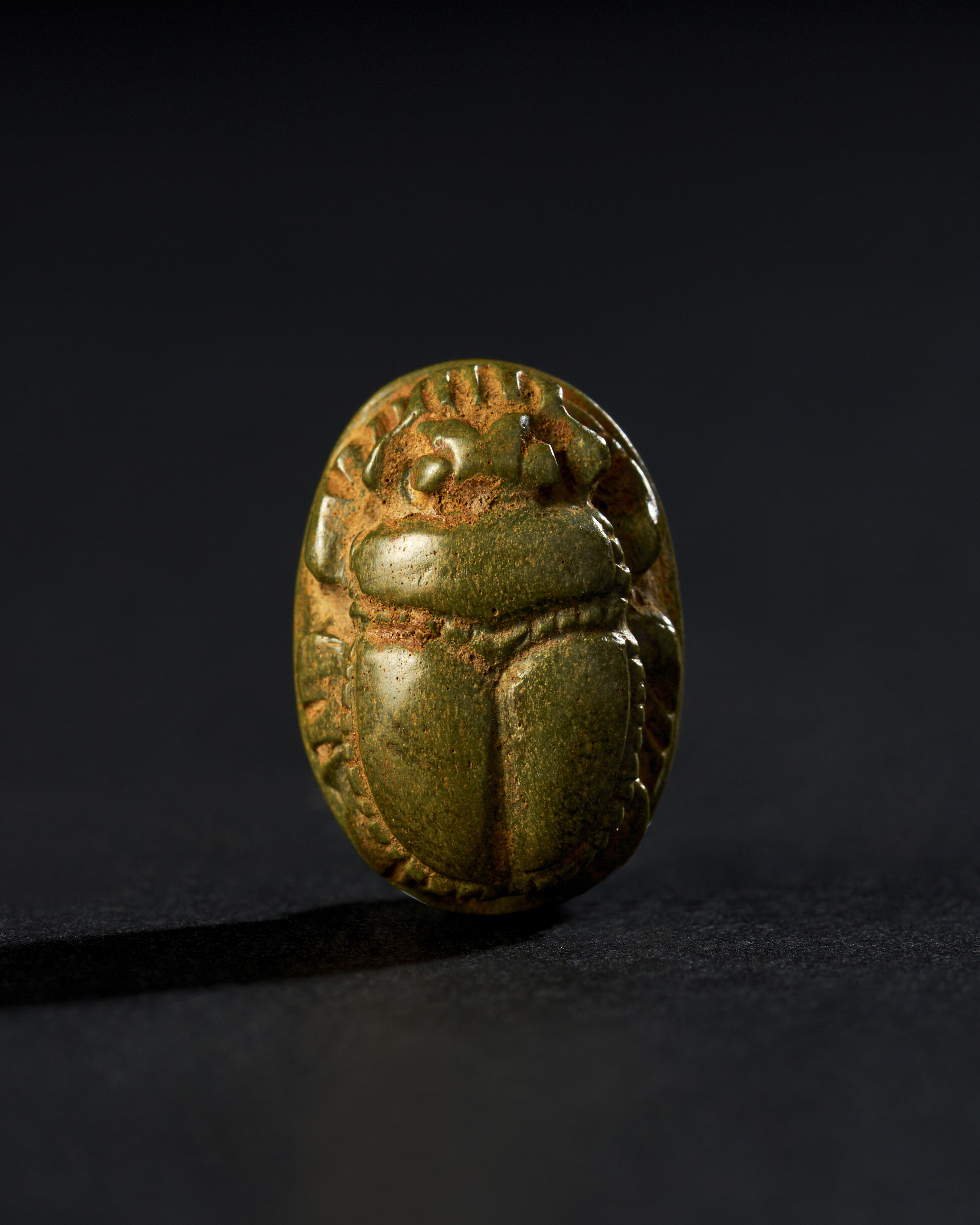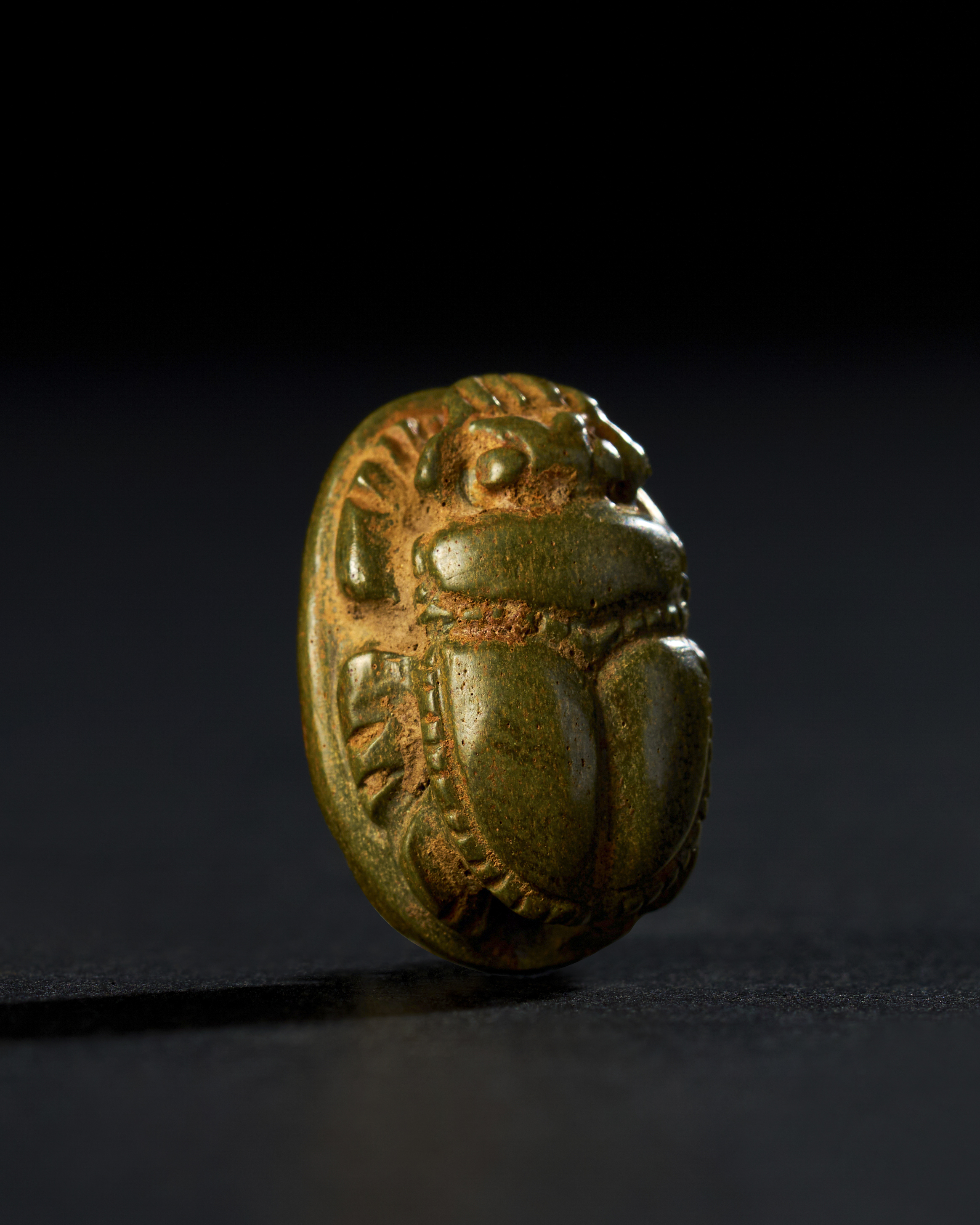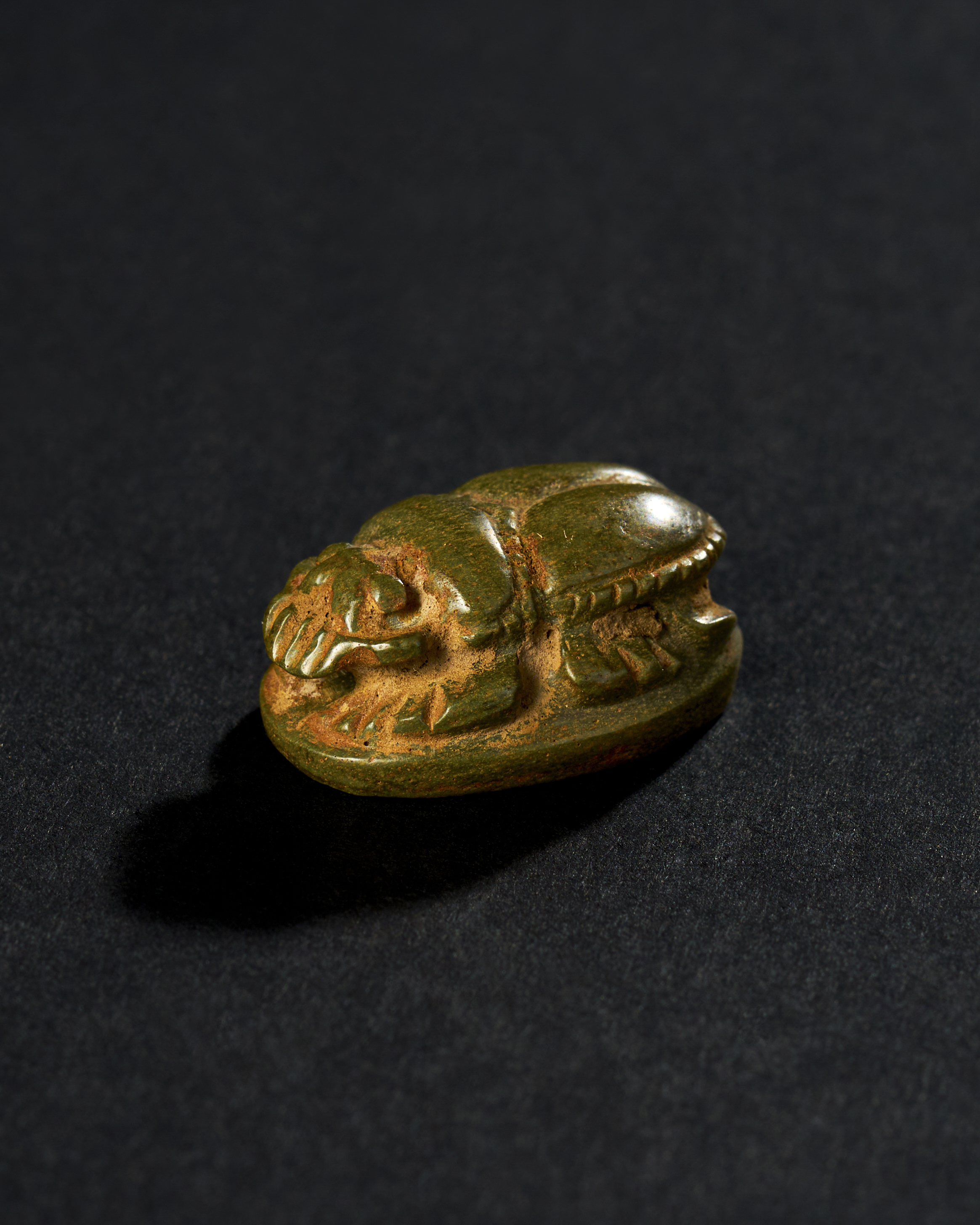 GREEN JASPER SCARAB WITH HOLOGRAPHIC ENGRAVING, EGYPTIAN PERIOD