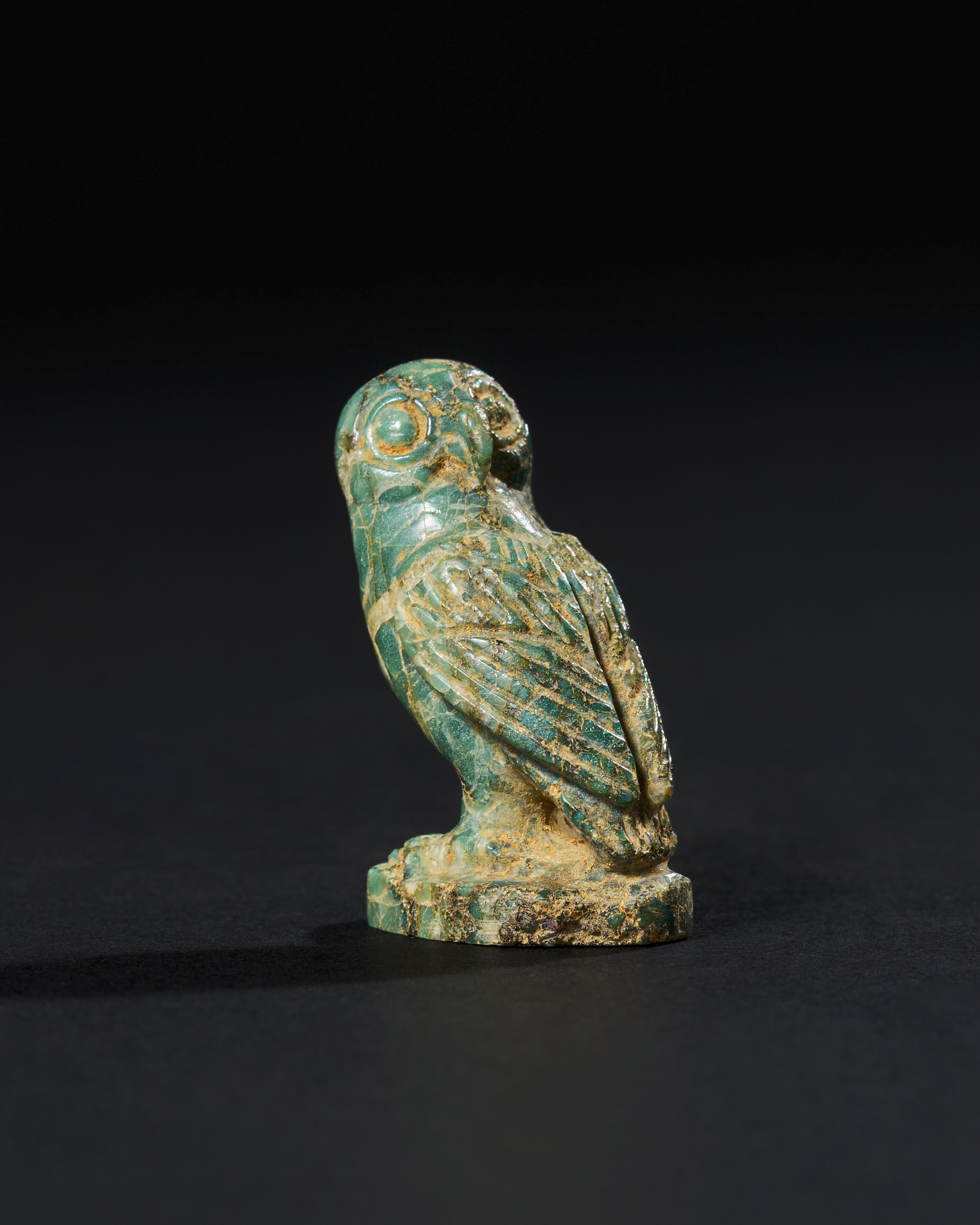 This beautifully carved green stone amulet depicts a seated owl, symbolising wisdom and protection. Dating to the 2nd-3rd century A.D., this amulet reflects a concept of guardianship commonly associated with owls in ancient cultures. The amulet exhibits fine detailing in the owl’s feathers and posture. Amulets like this were believed to provide spiritual protection.