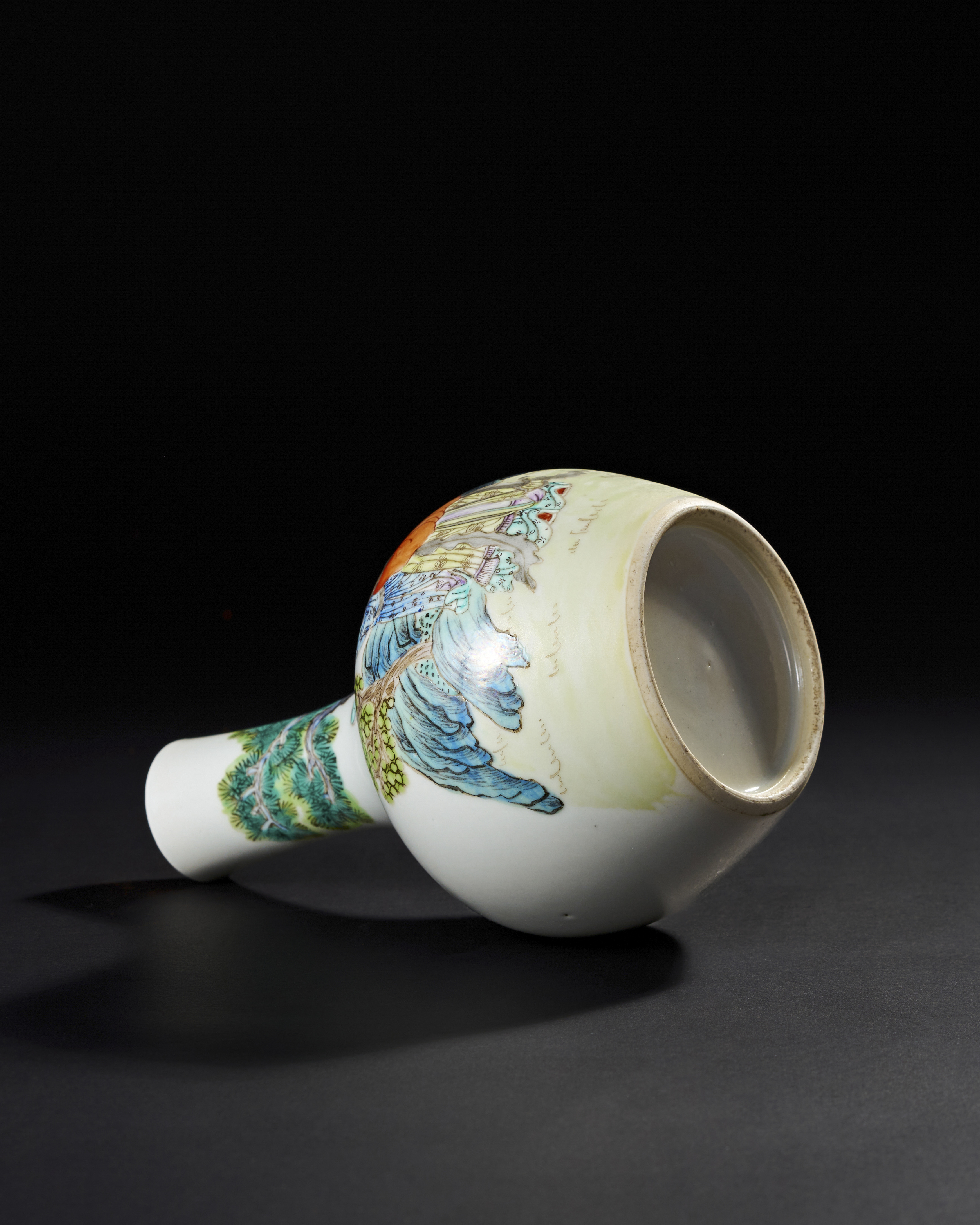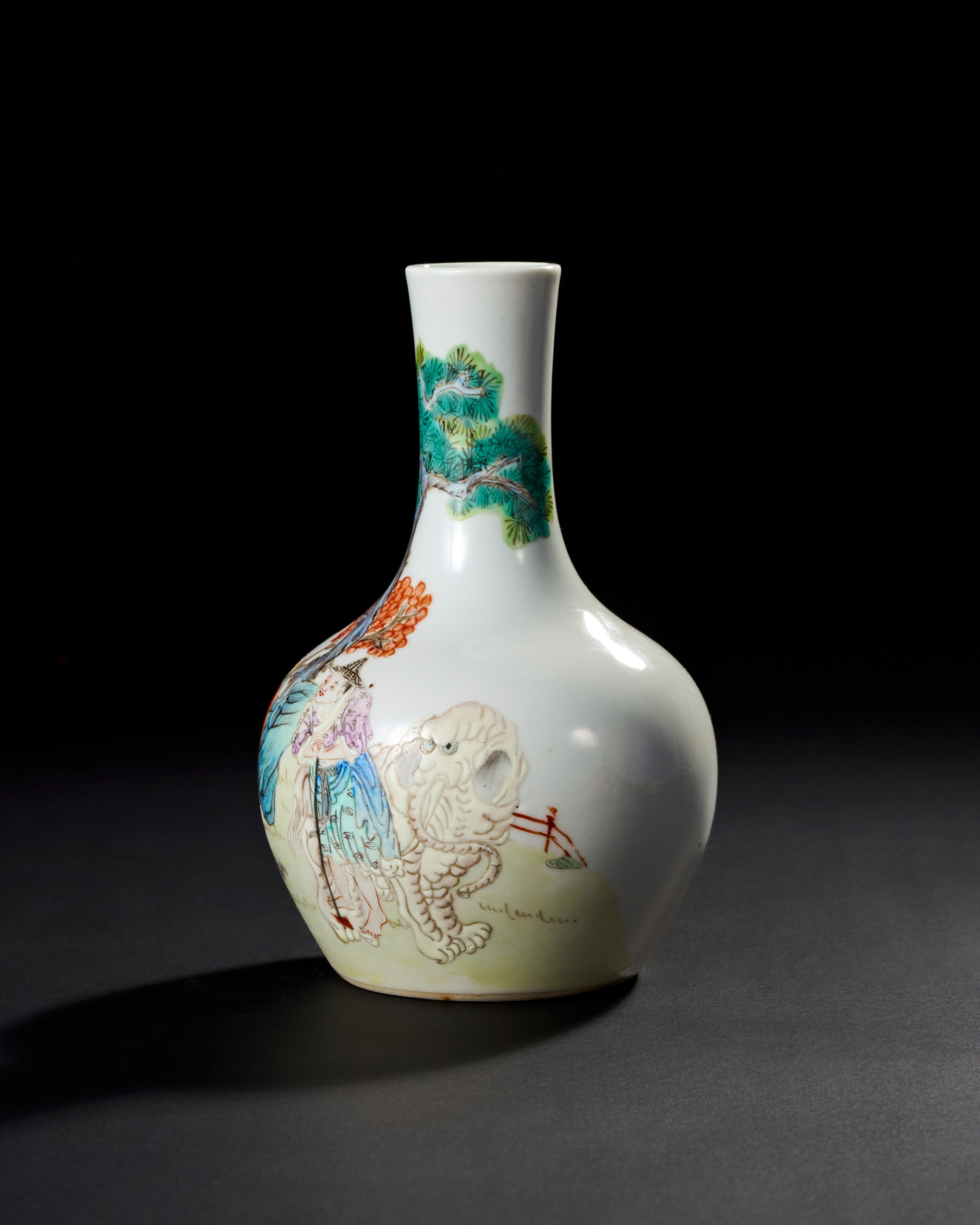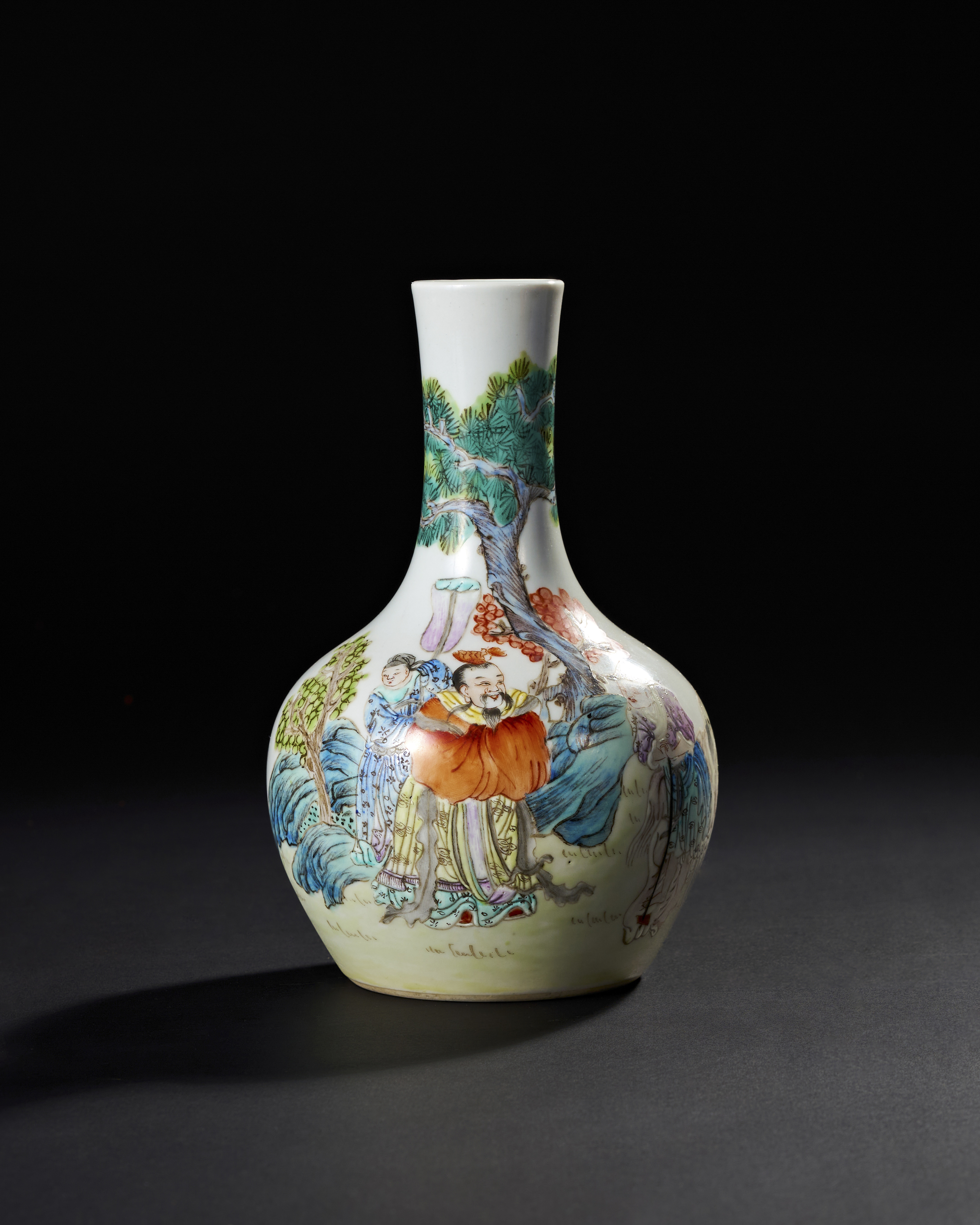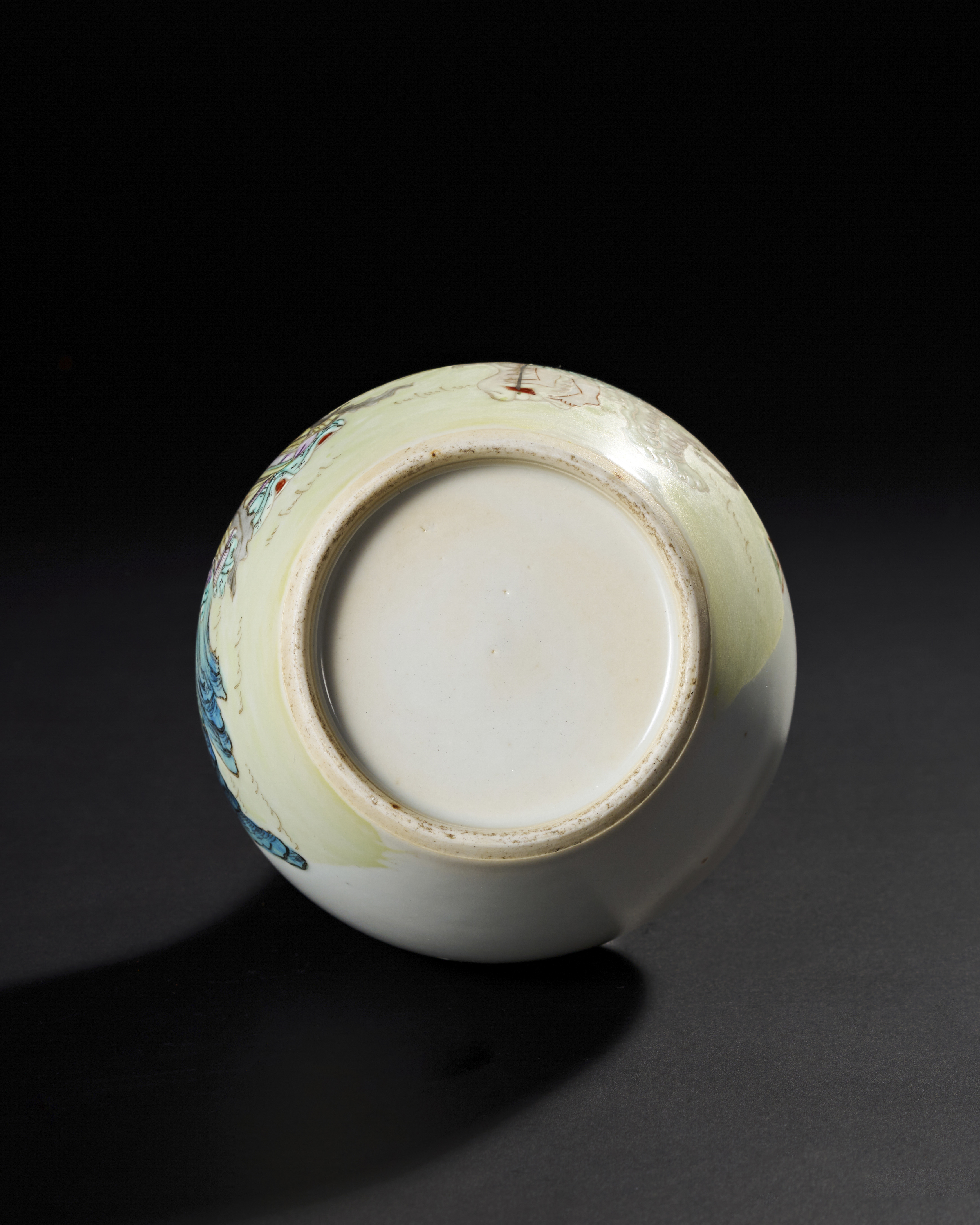 The body finely painted with Emperor Yao with assistants visiting a wise with a white elephant meeting in a garden setting.