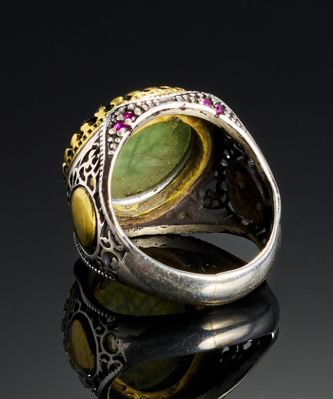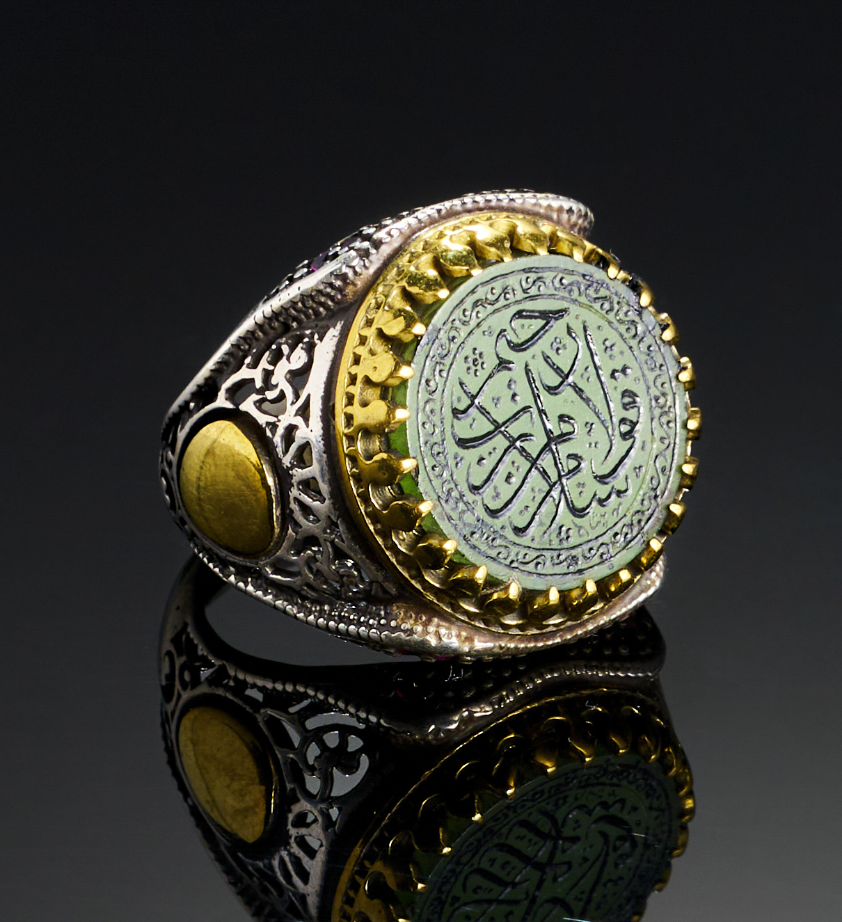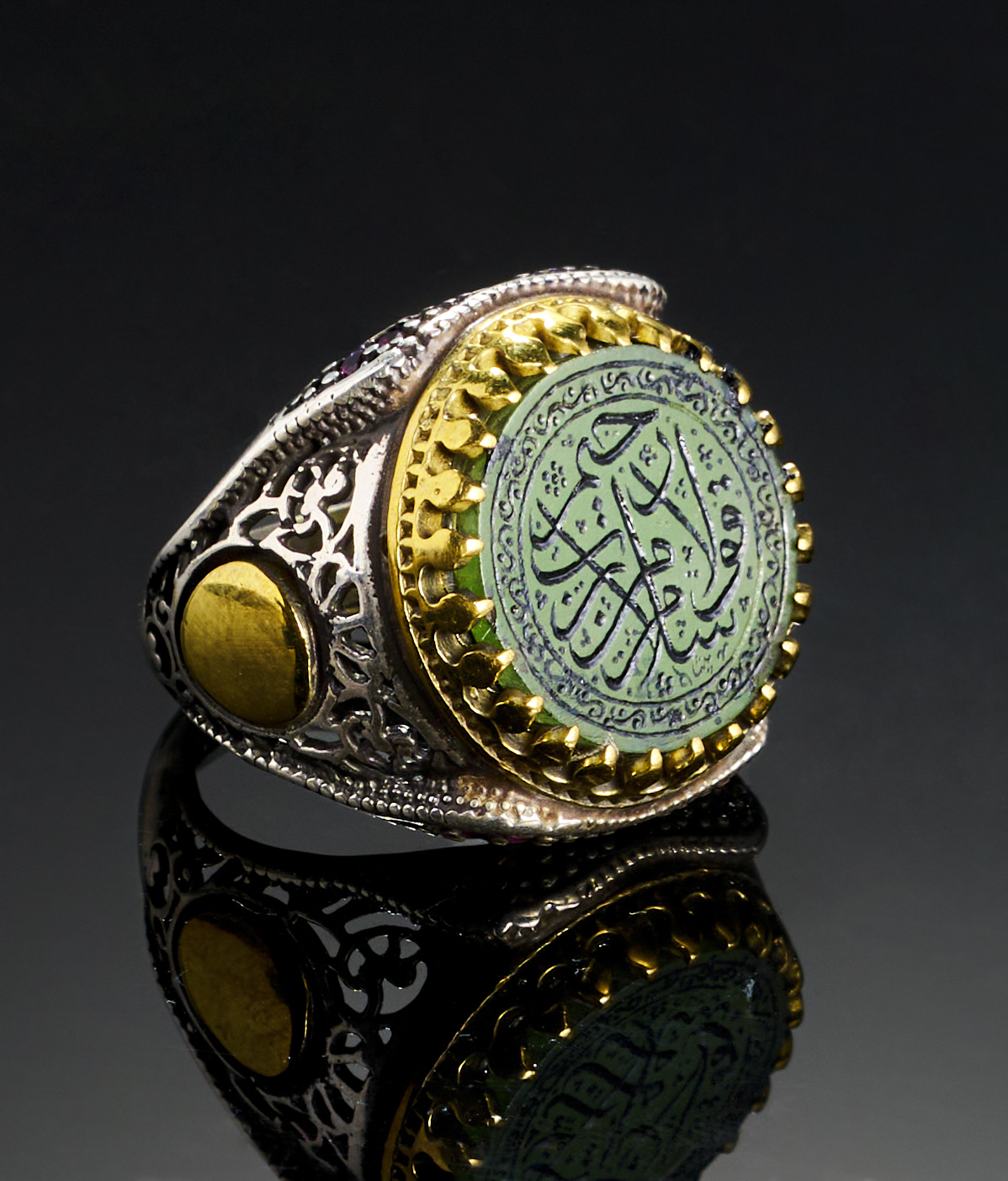 A GREEN AGATE WITH ISLAMIC CALLIGRAPHY IN A SILVER RING