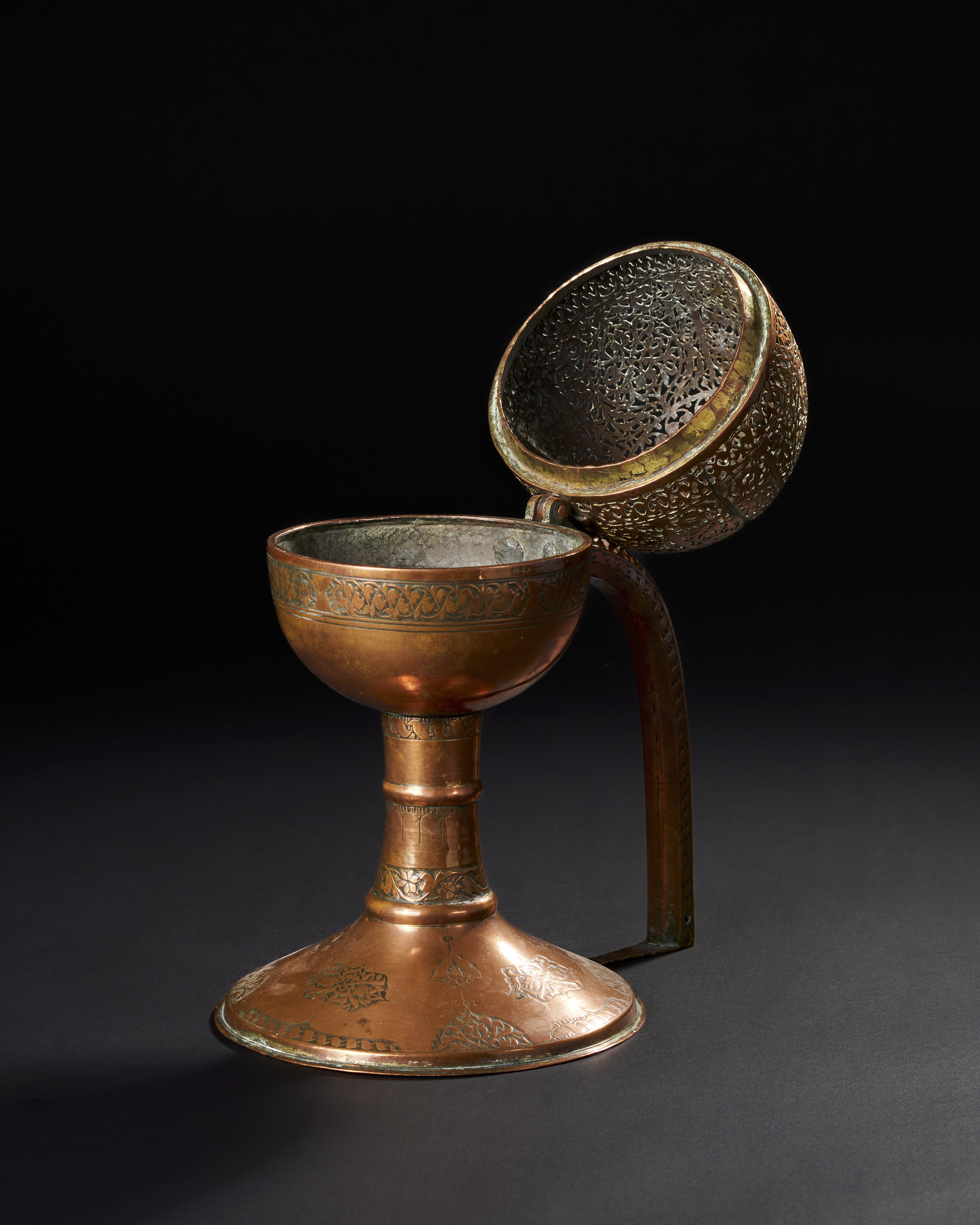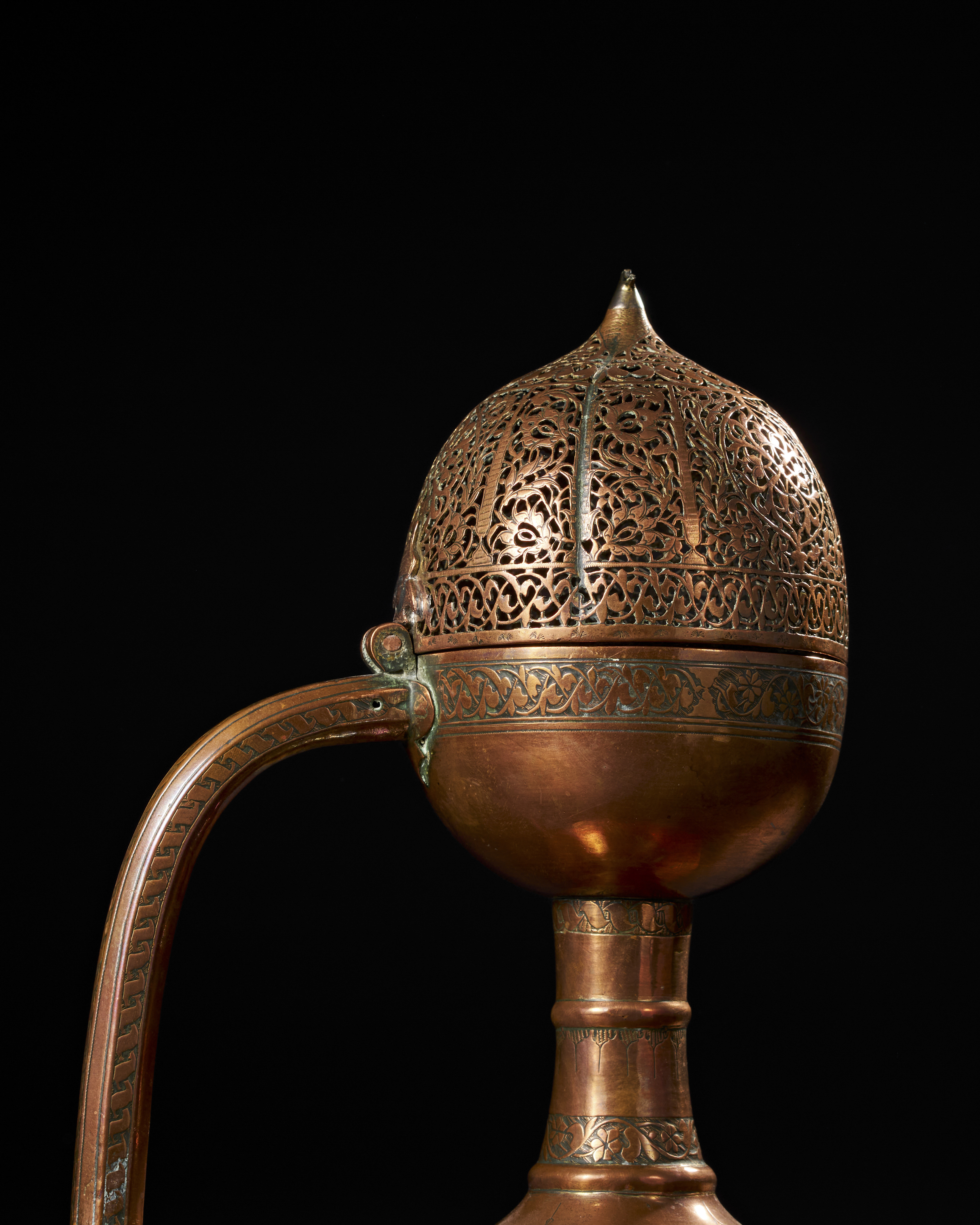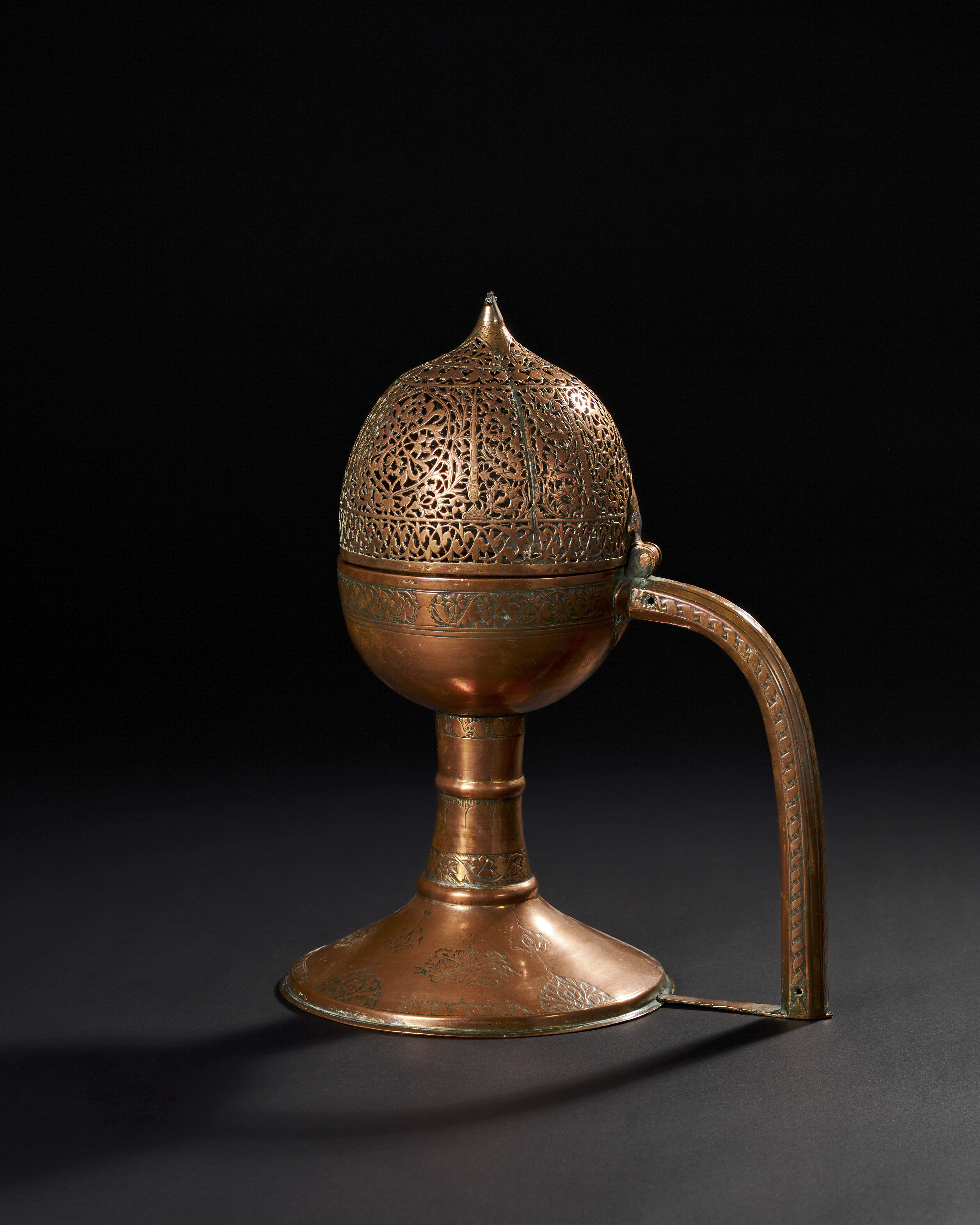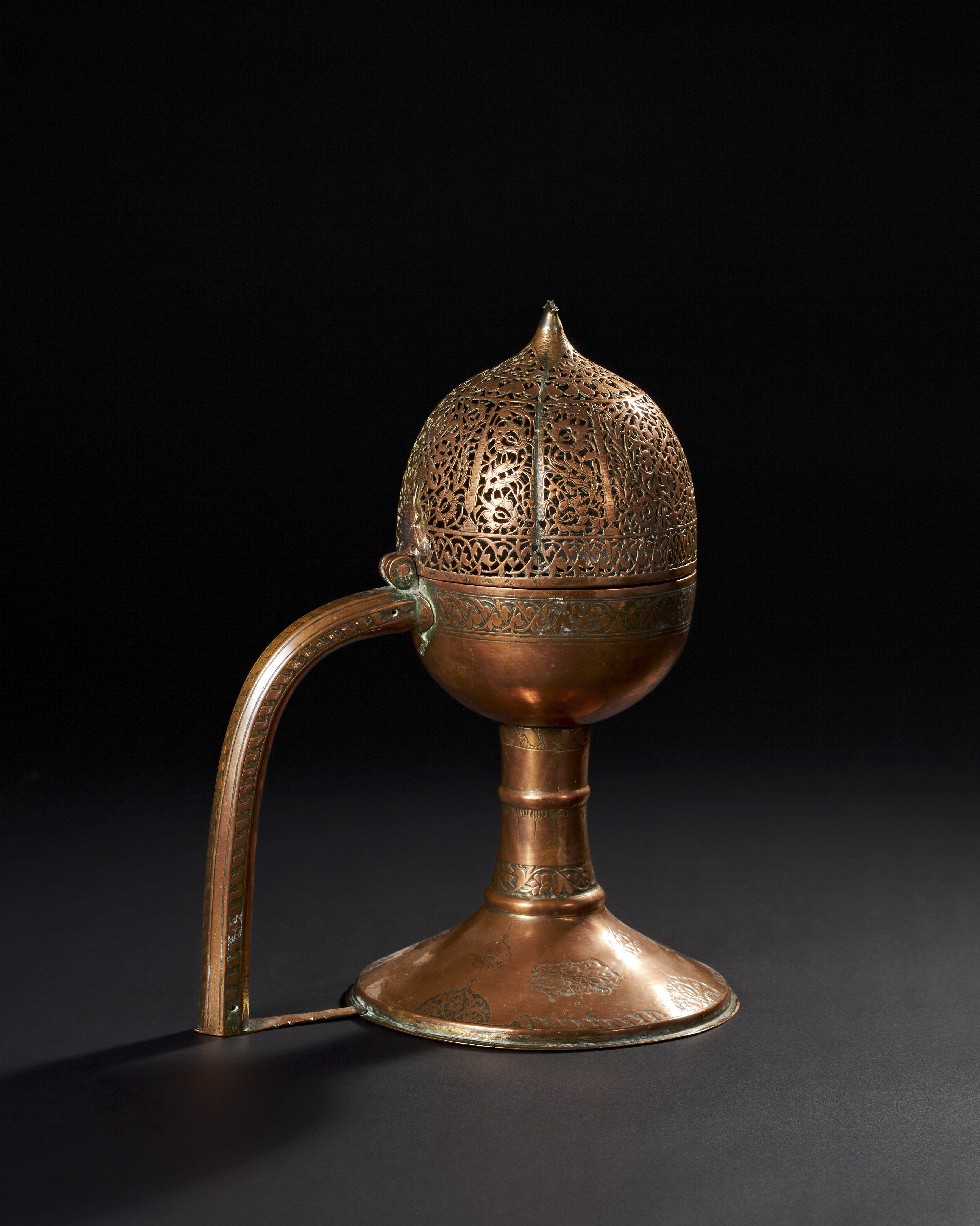 An exceptional 17th century Ottoman Turkish incense burner, crafted in tombak (gilded copper). The piece features intricate open-worked arabesque patterns on the dome-shaped lid, opening to reveal the inner incense chamber. The burner stands on a flared pedestal base, with engraved details throughout, and an arched handle for ease of use.