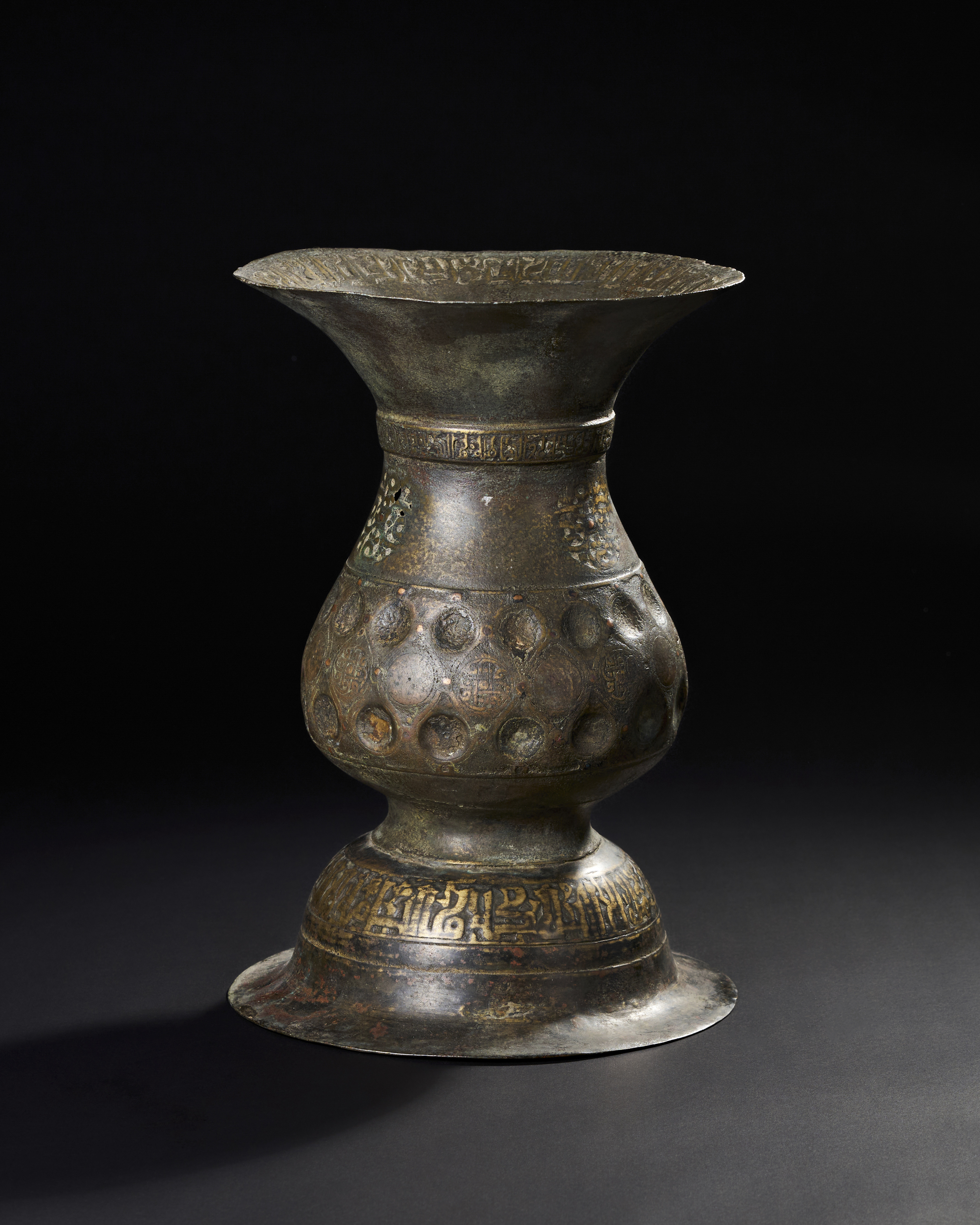 A large 12th-13th century Persian Seljuk vase, crafted in bronze and inlaid with copper. This elegant vessel features intricate Kufic calligraphy encircling the top, neck, and base. The vase is further adorned with embossed circular motifs around the body.