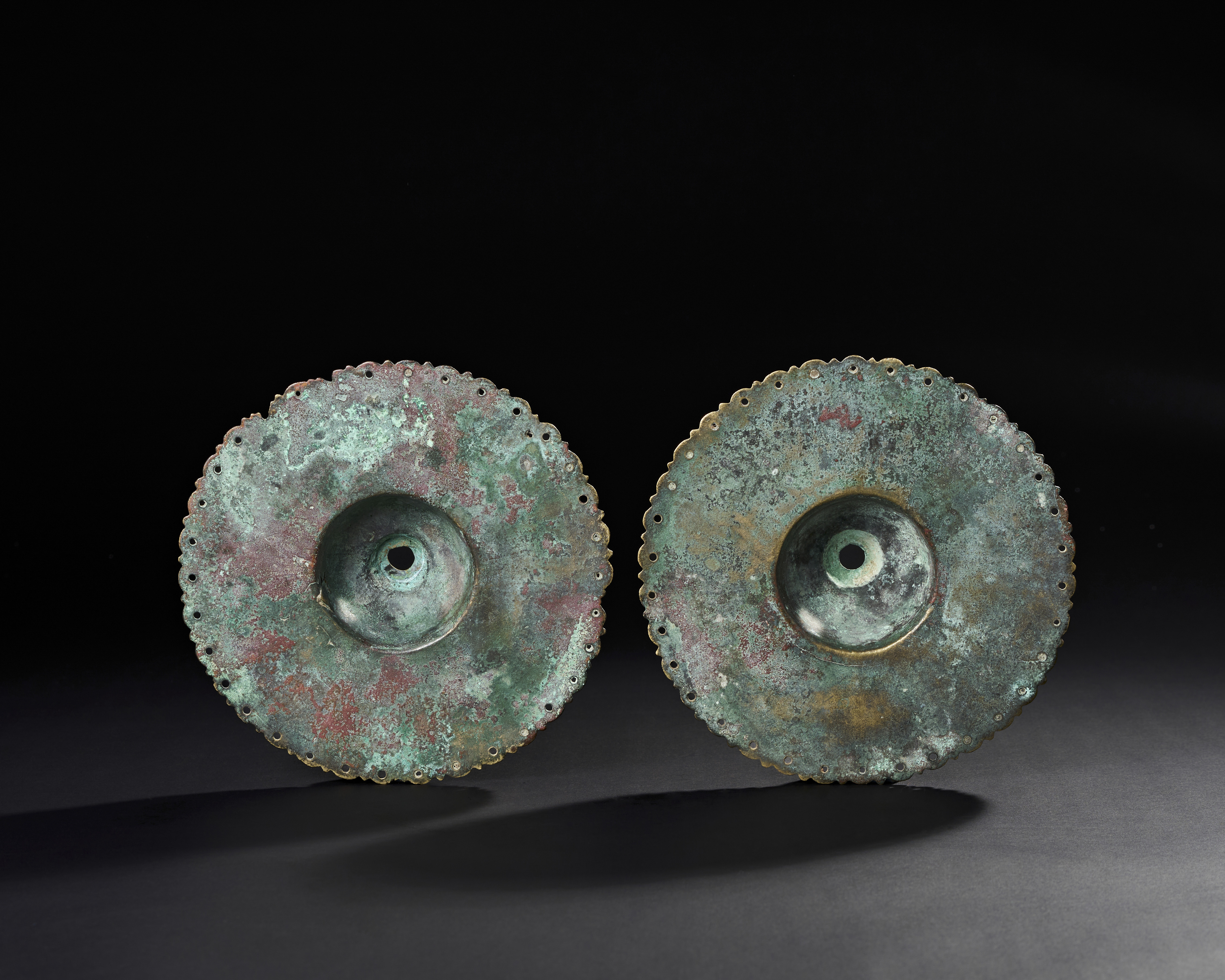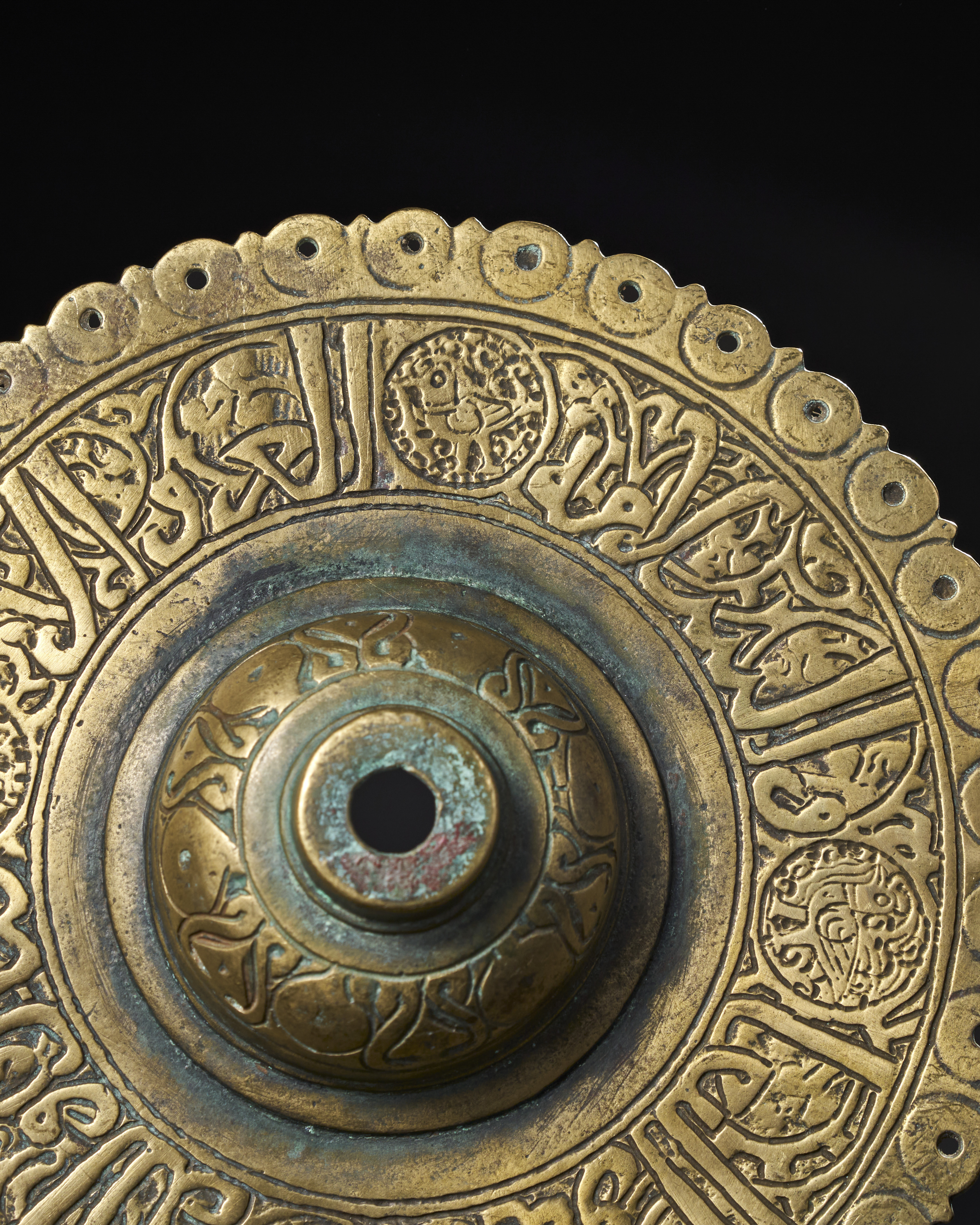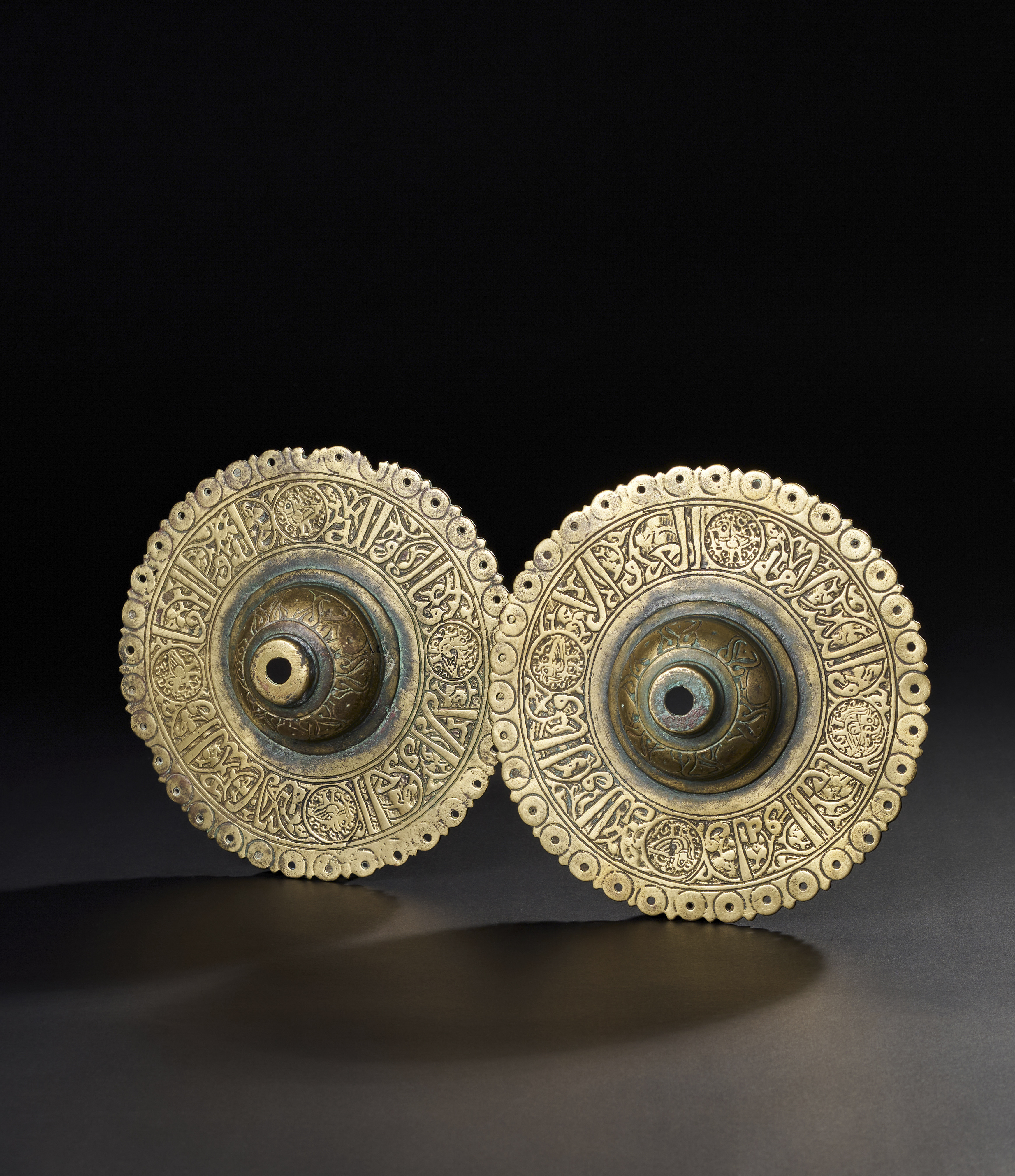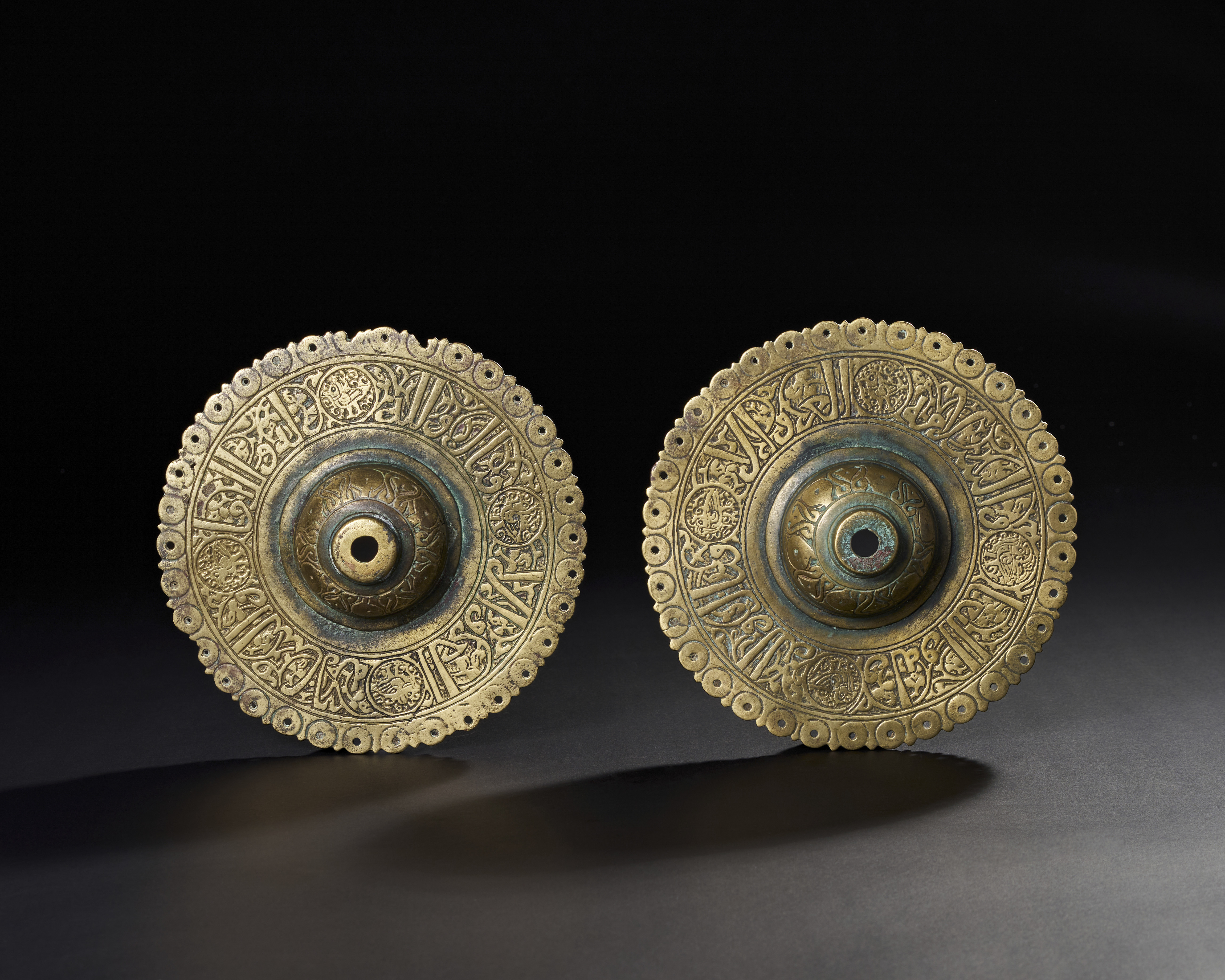 A PAIR OF 13TH CENTURY PERSIAN SELJUK BRONZE DOOR BOSSES WITH KUFIC CALLIGRAPHY