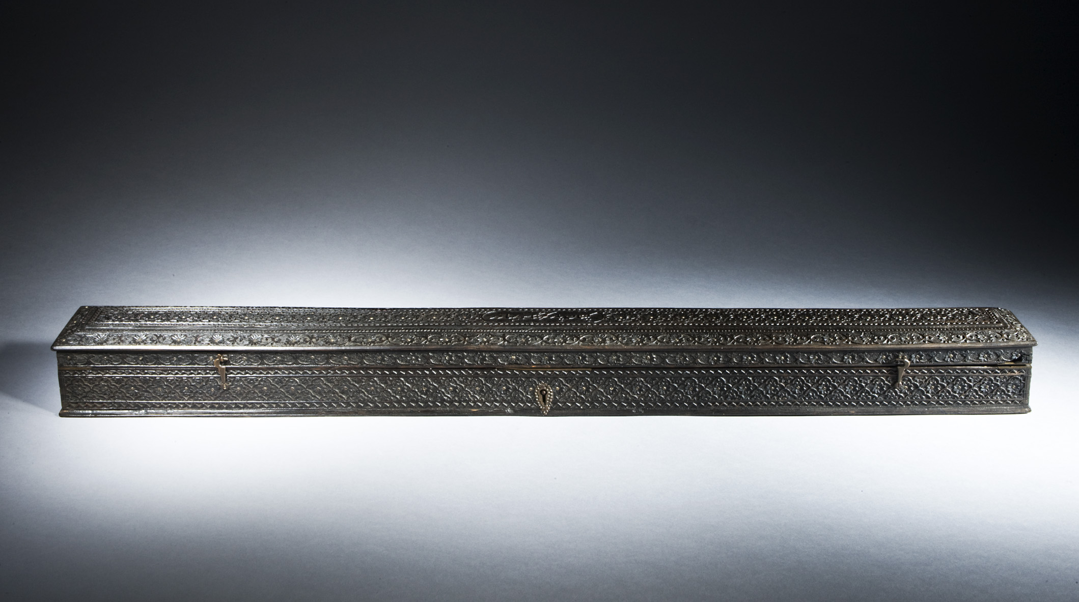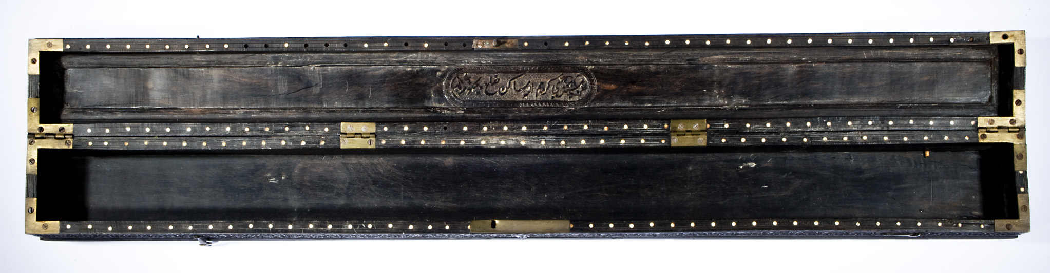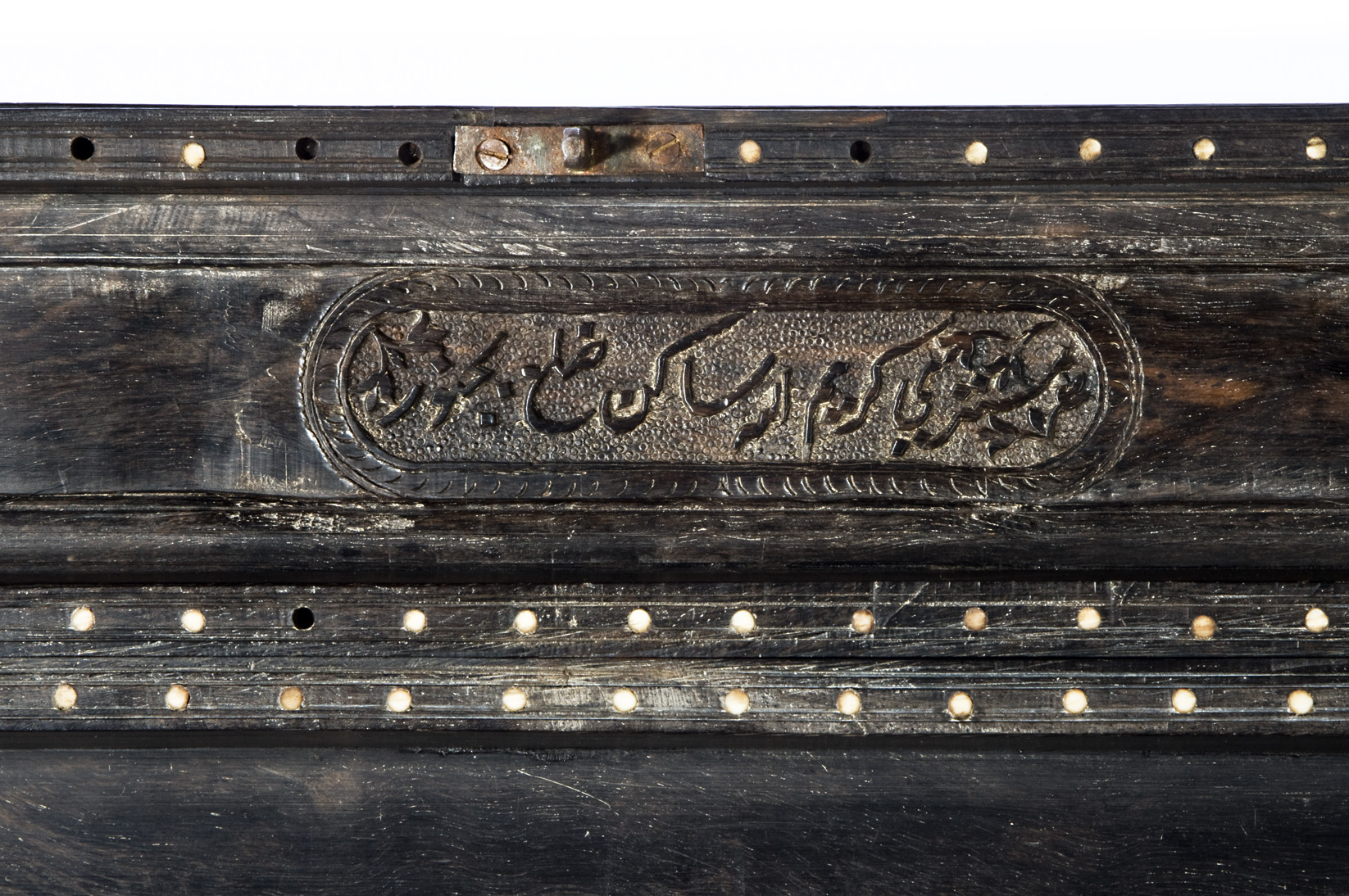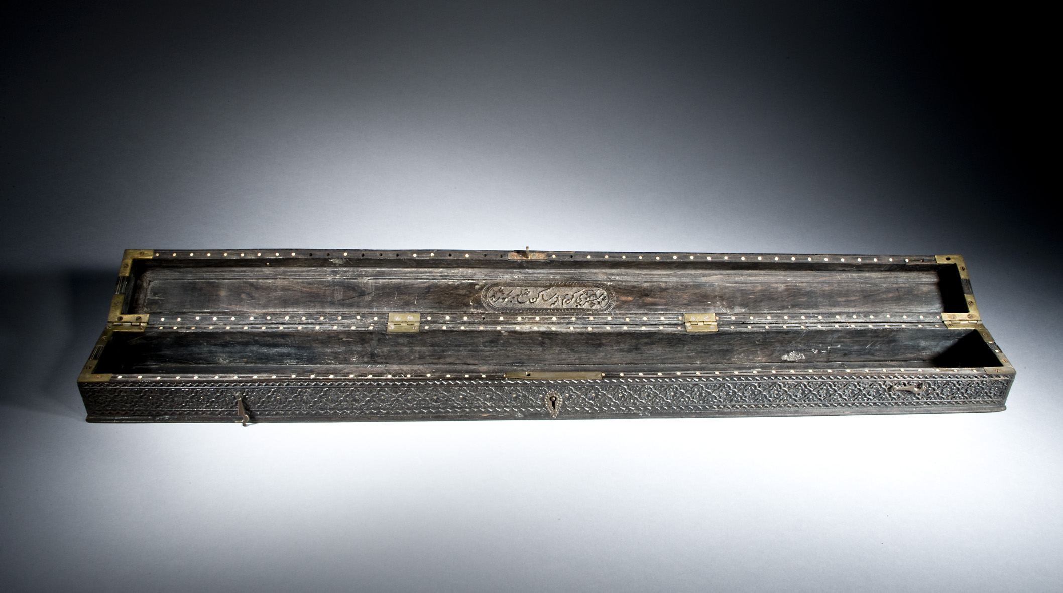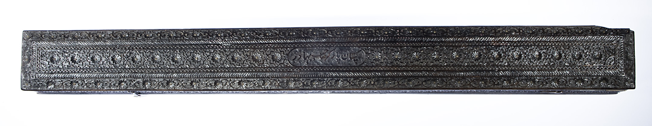 This exquisite 19th-century Mughal ebony box showcases masterful craftsmanship with its intricate floral and geometric carvings. Made from high-quality ebony, the box features brass hinges and a secure lock, inscription add to the inside and outside.