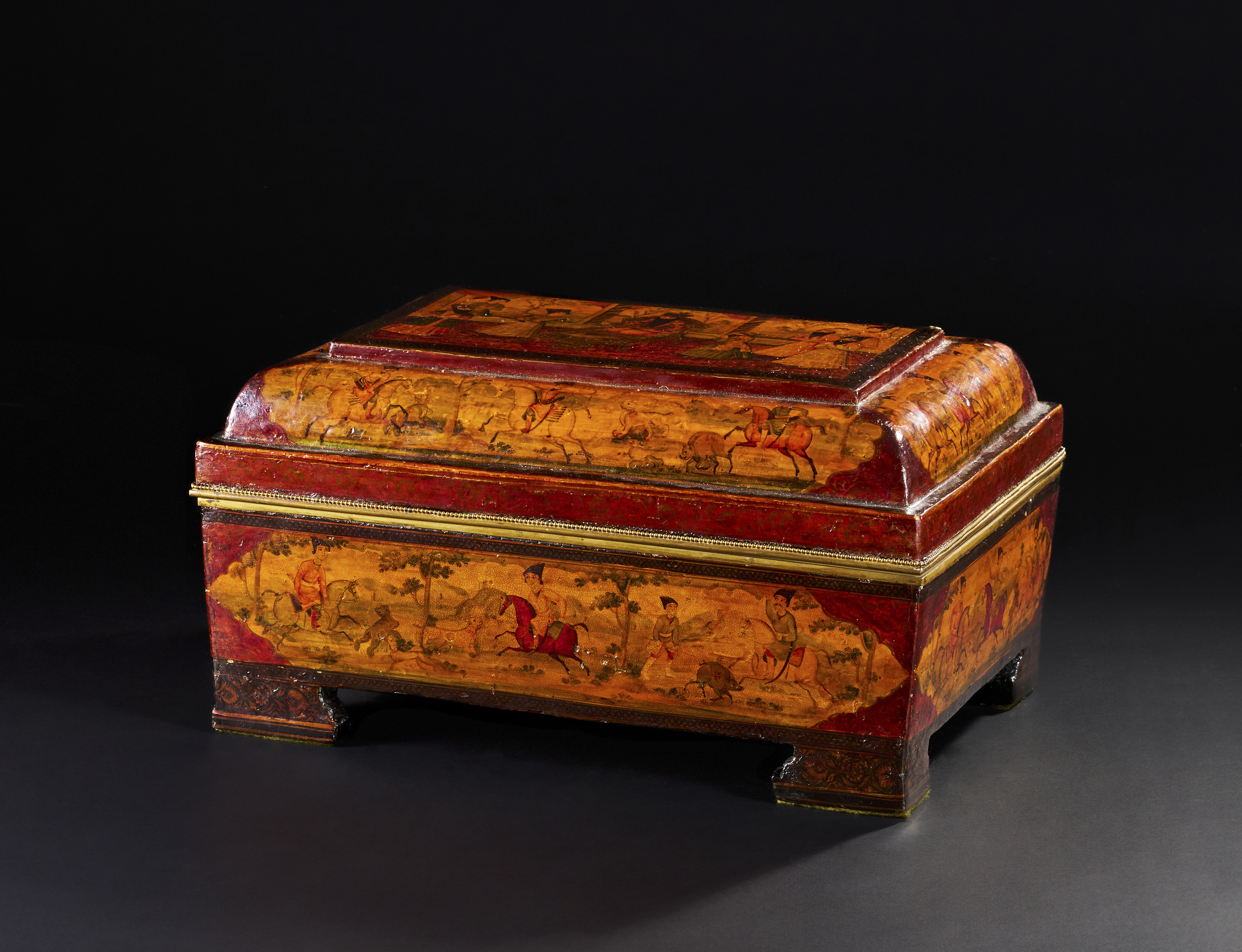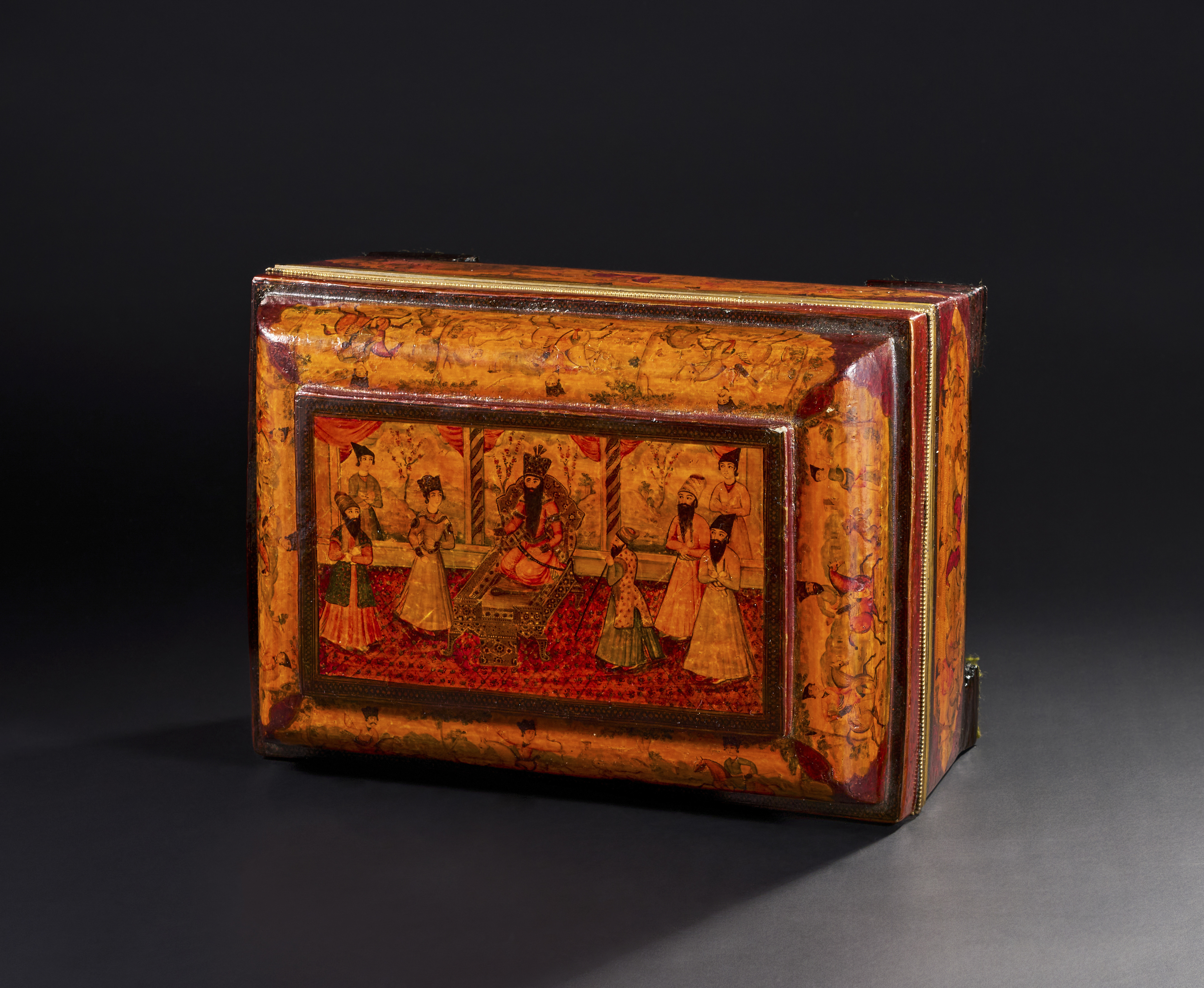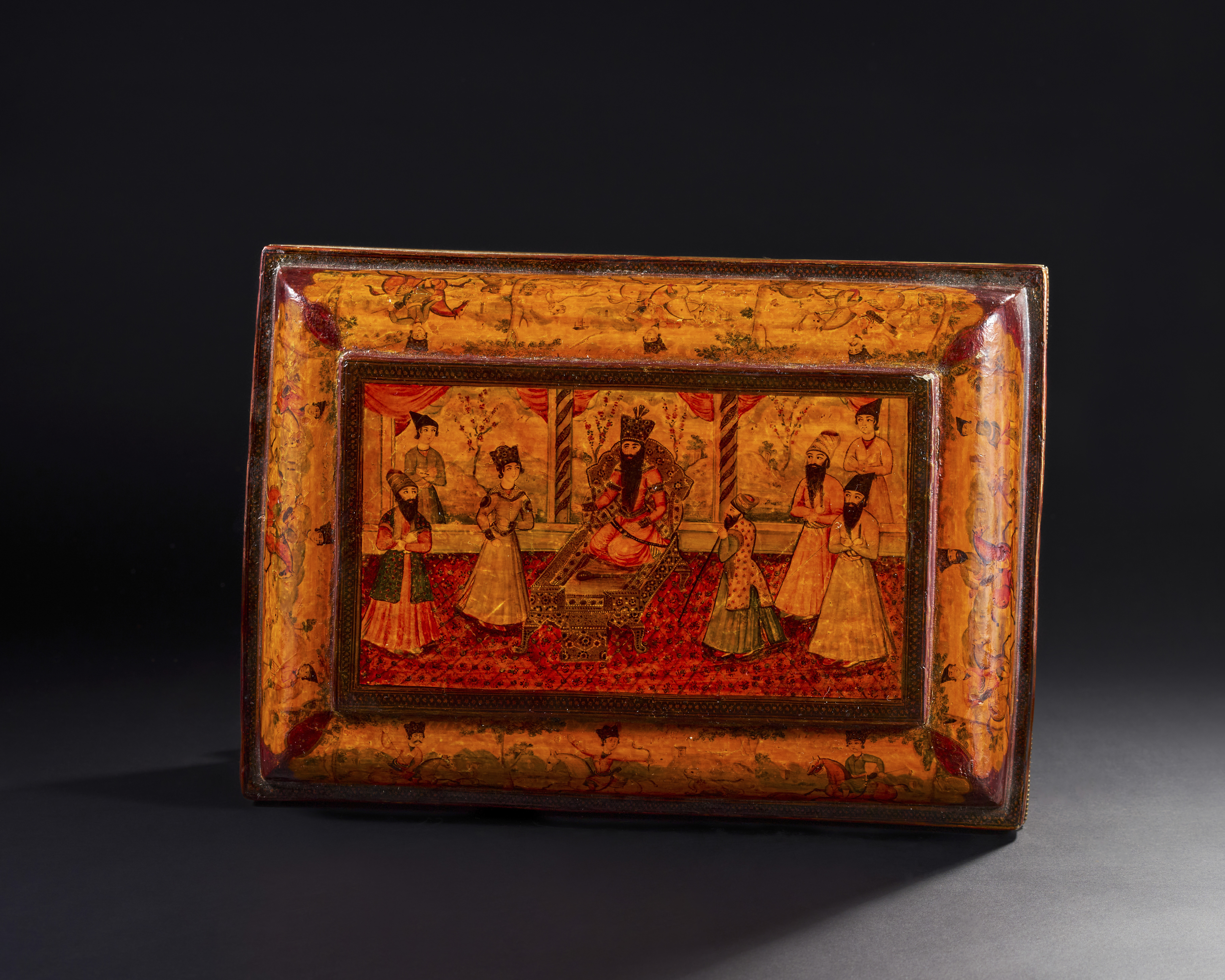 A LARGE 19TH CENTURY QAJAR LACQUERED PAPIER-MACHE CASKET DEPICTING FATH’ALI SHAH AND HUNTING SCENES