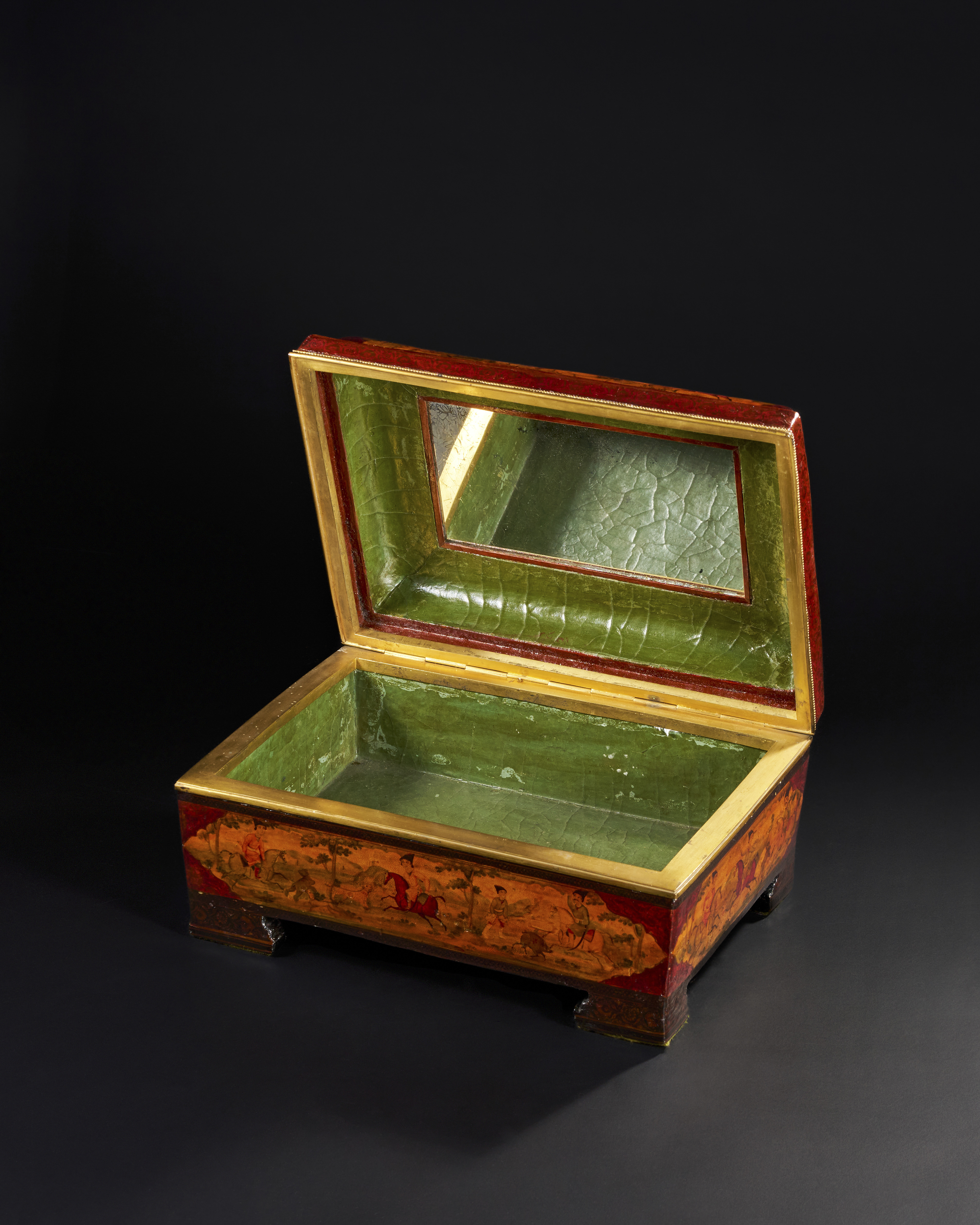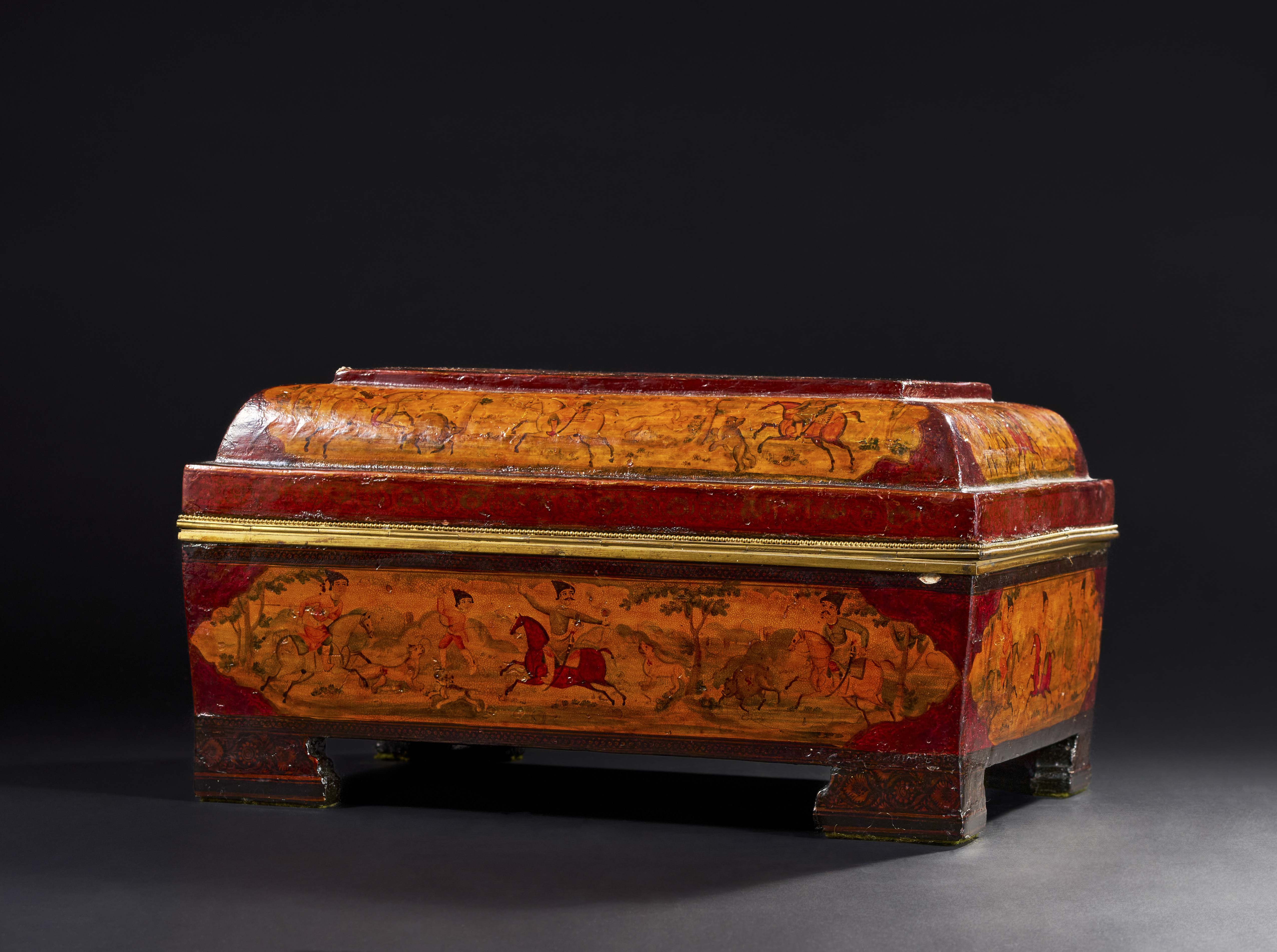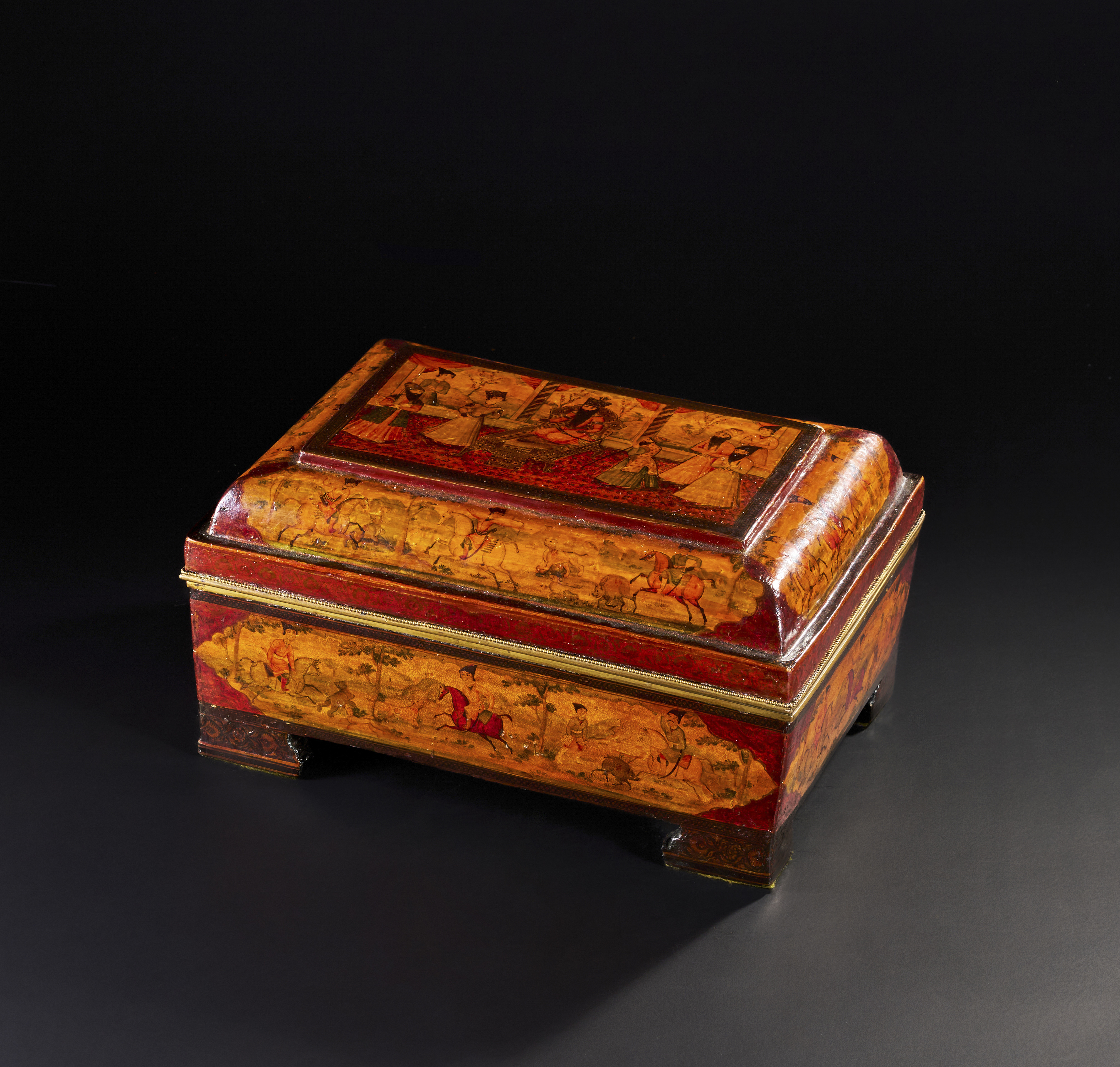 A LARGE 19TH CENTURY QAJAR LACQUERED PAPIER-MACHE CASKET DEPICTING FATH’ALI SHAH AND HUNTING SCENES