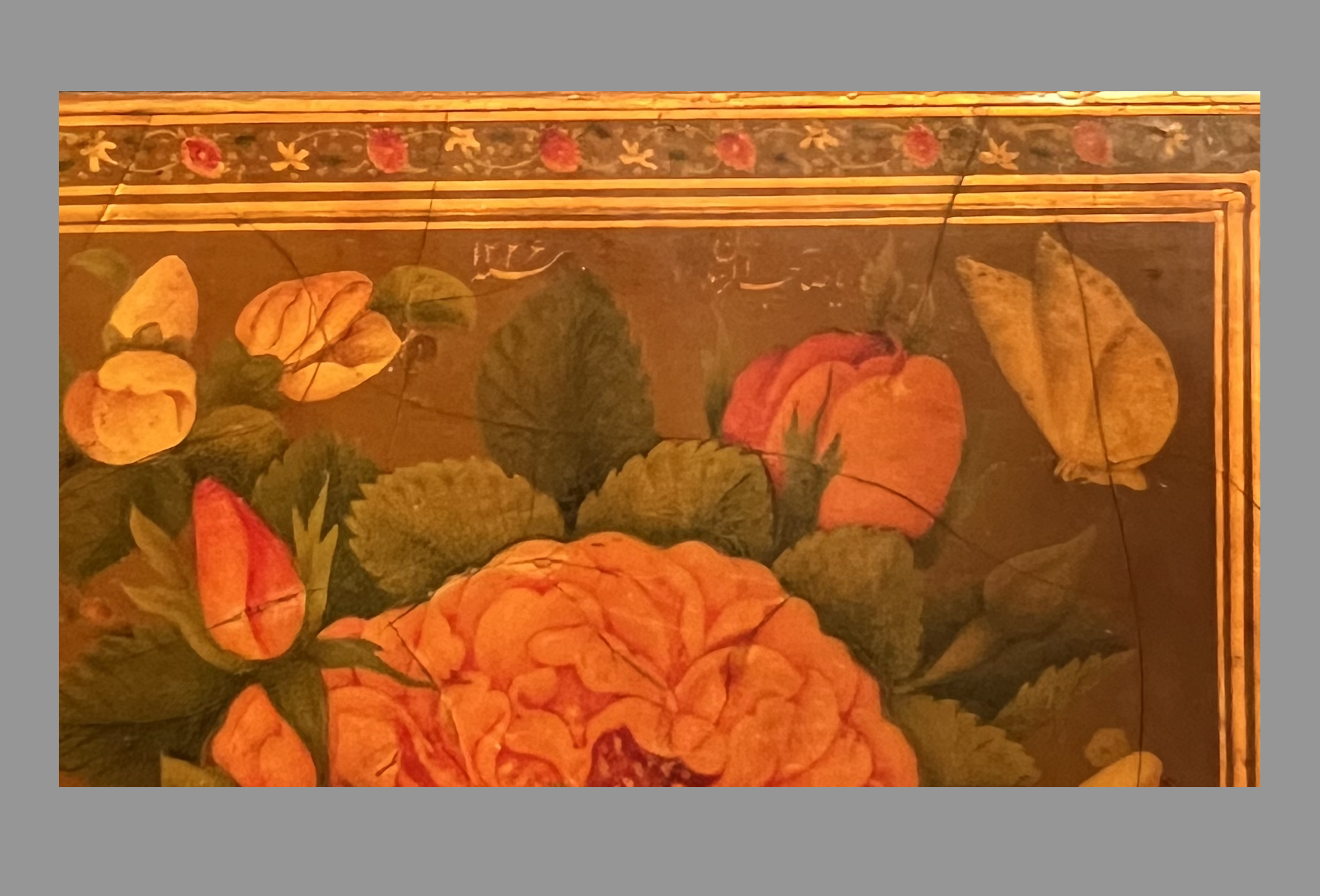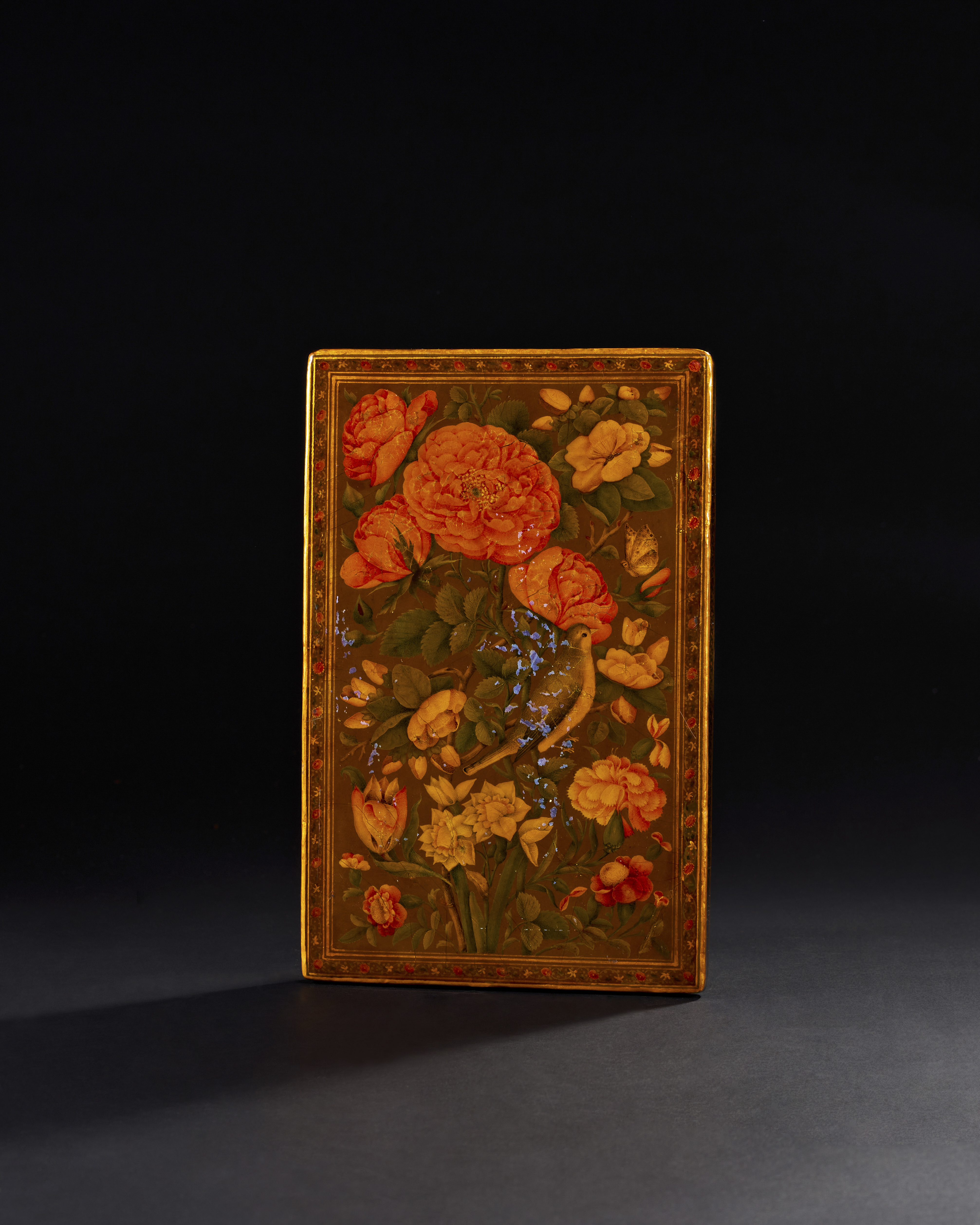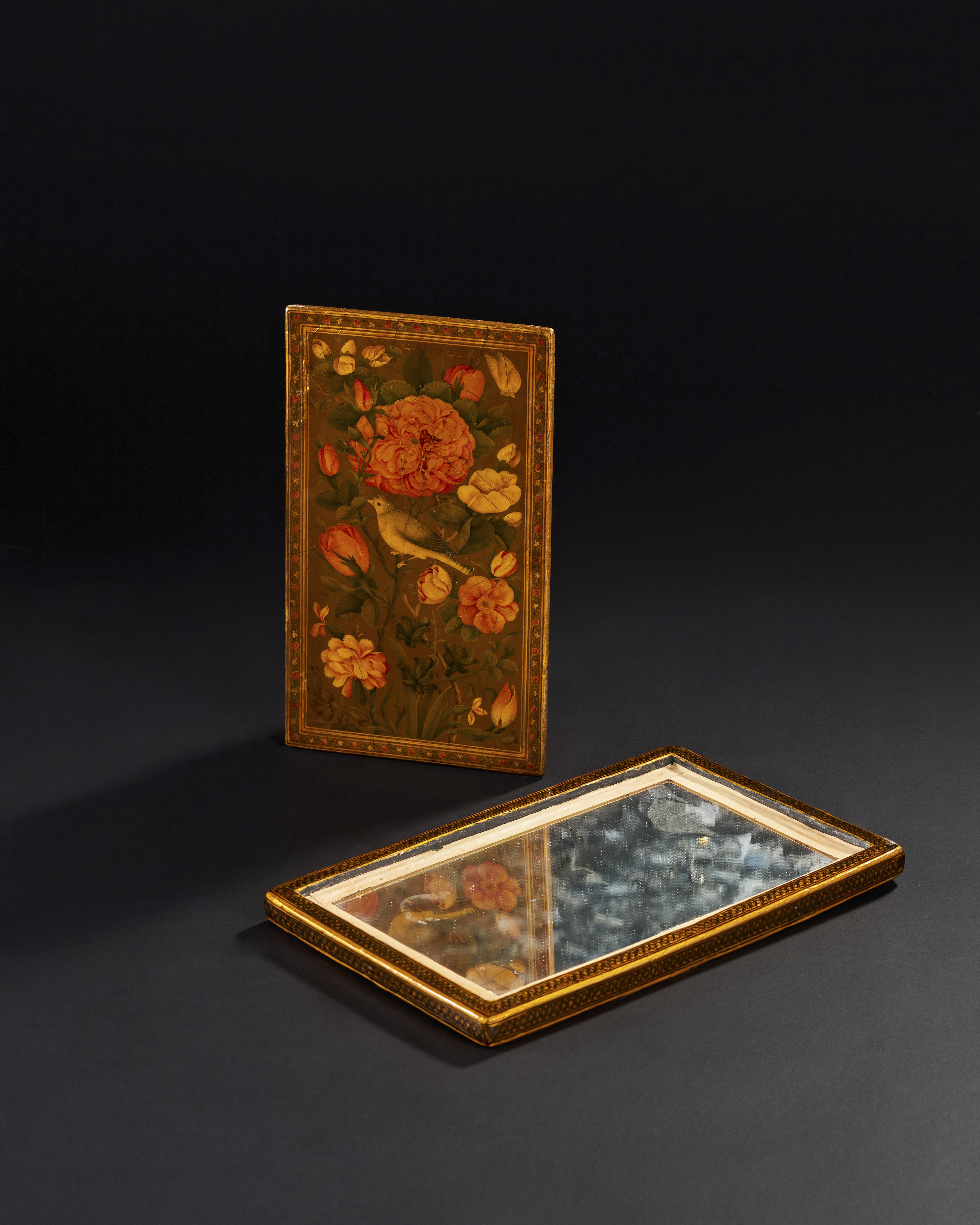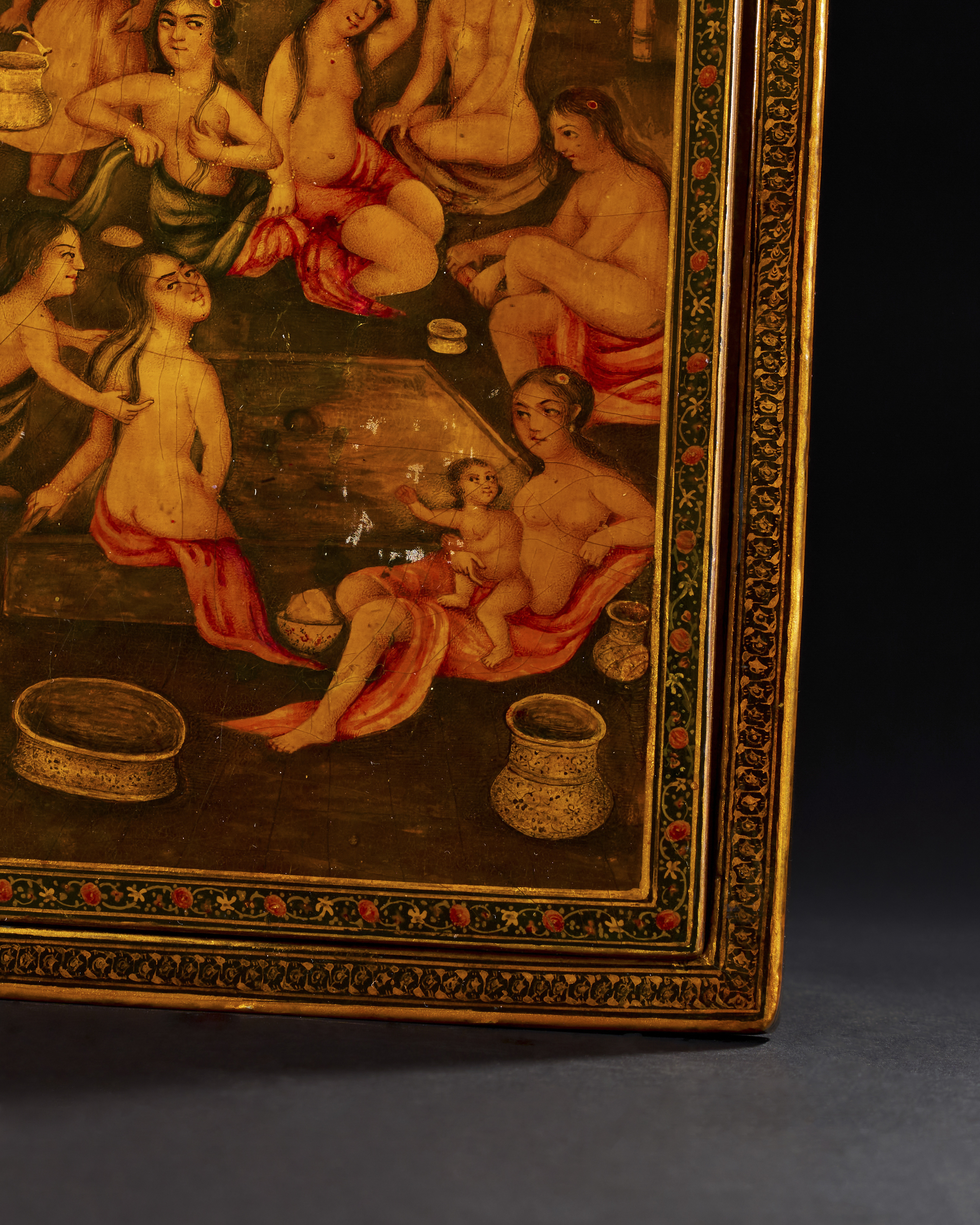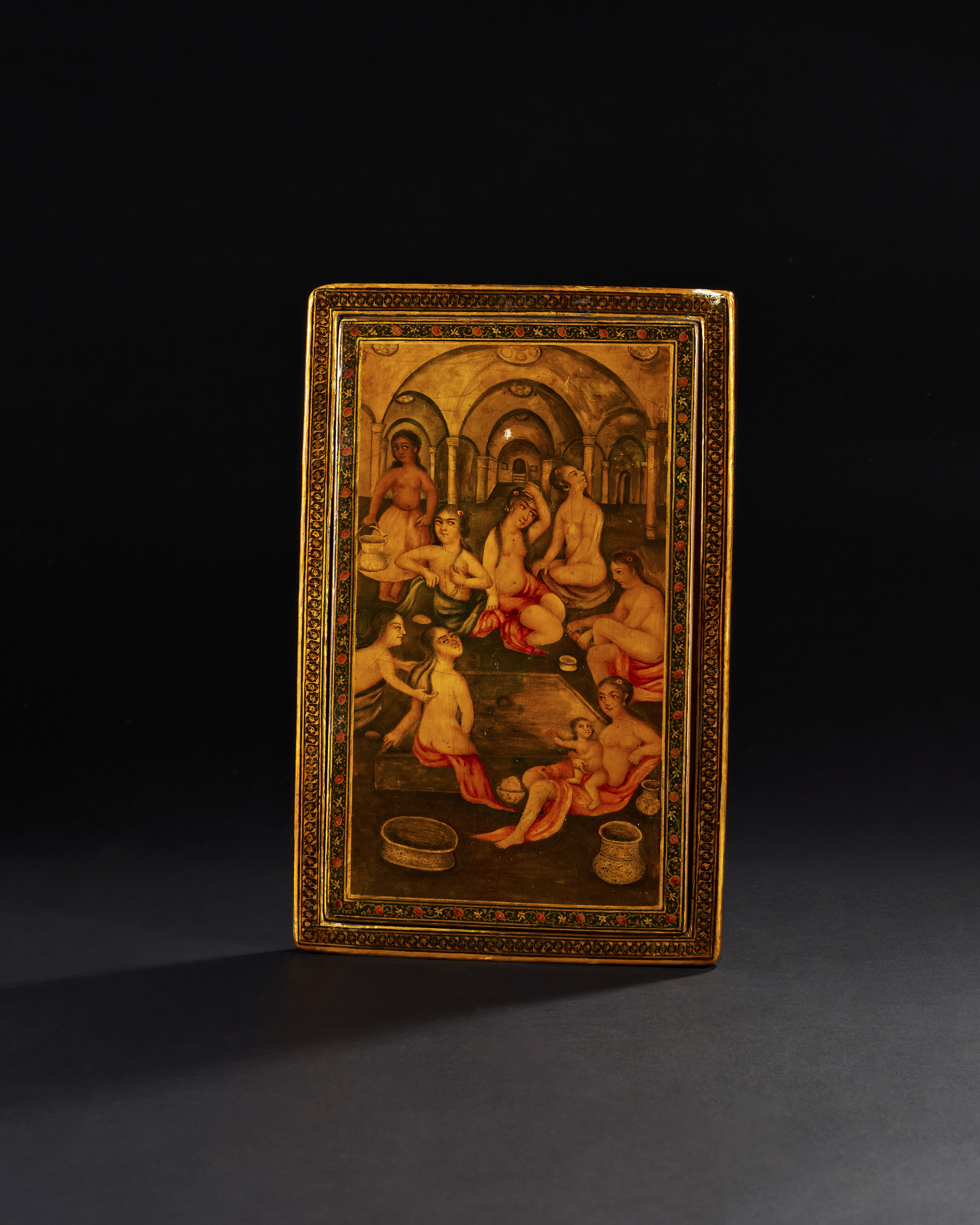 A 19th century Qajar lacquered mirror case portrays a vibrant and detailed scene of a ladies’ hammam (bathhouse). The front panel is adorned with an intricate painting of several women, elegantly draped in red and orange robes, attending to one another in an ornate, vaulted interior, characteristic of Persian bathhouses of the period. The reverse panel displays an exquisite floral design featuring lush red and orange roses, a hallmark of Qajar lacquer artistry. The edges of the case are framed with intricate geometric and floral borders, The case bears the signature “Ya Sahib Al-Zaman” and dated.