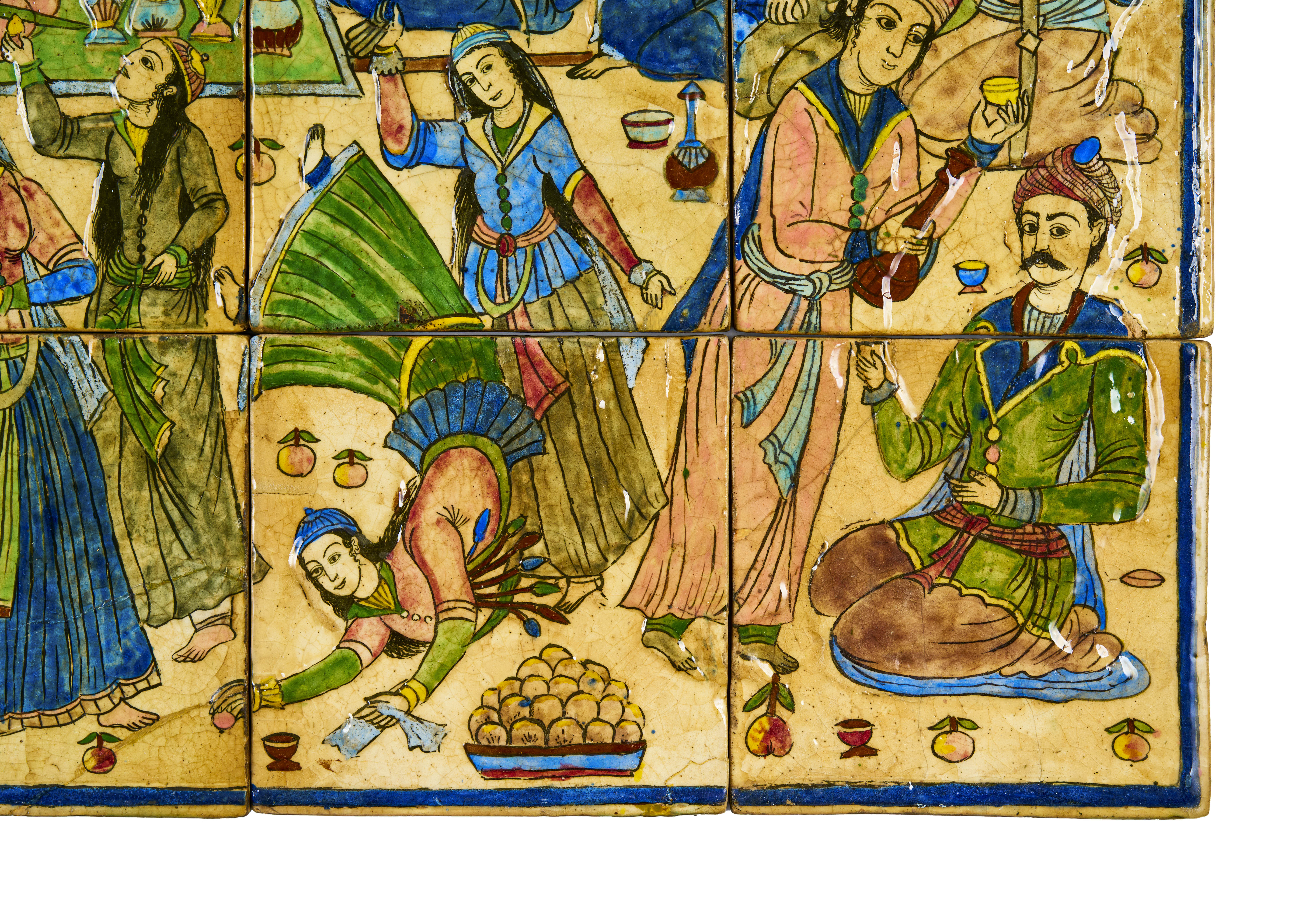 The tiles depicts a majestic courtly banquet scene, rich in colour and intricate detailing. The composition showcases Persian nobles and courtiers, dressed in vibrant traditional garments, engaged in festivities that include music, dance, and feasting.