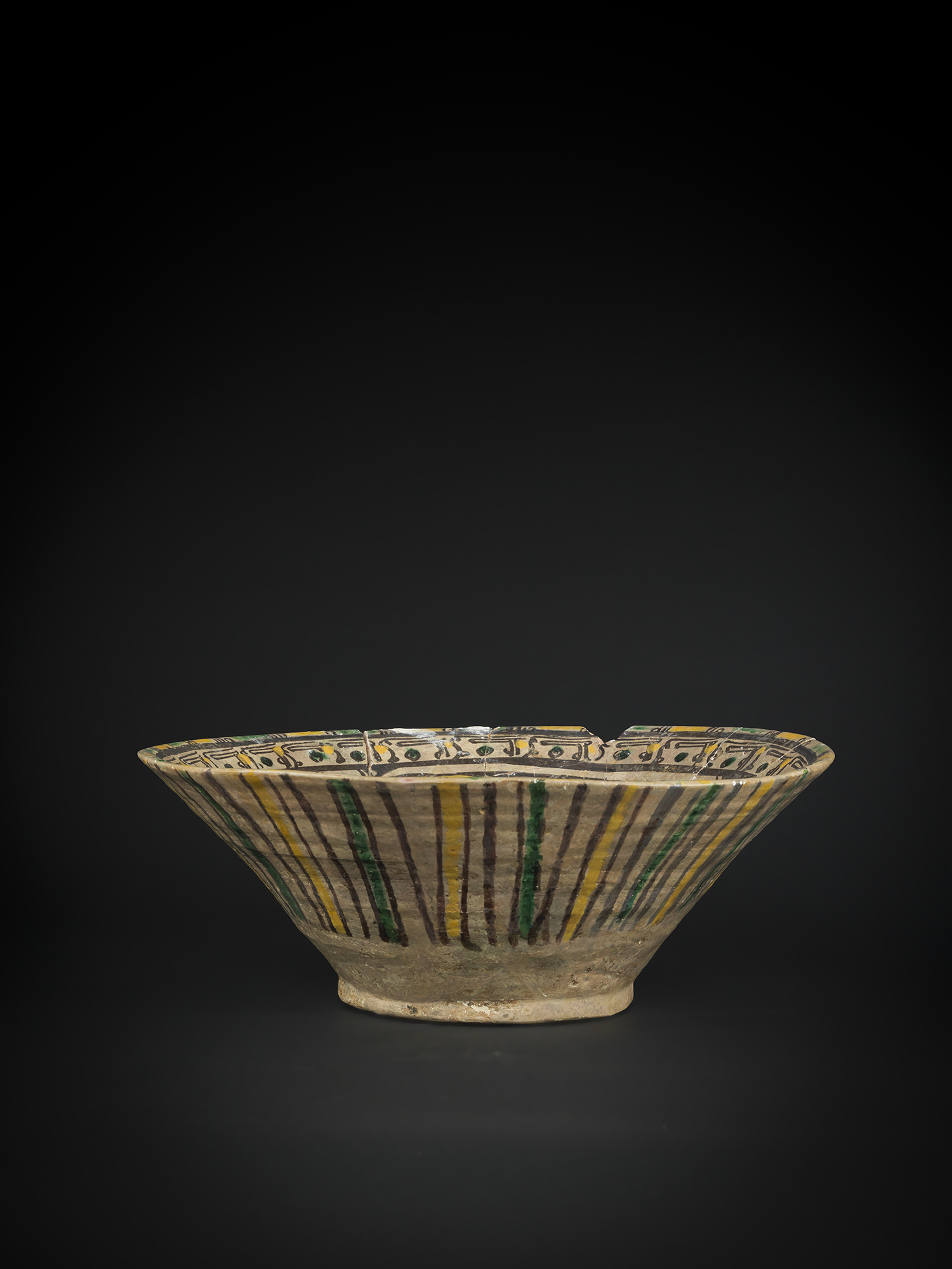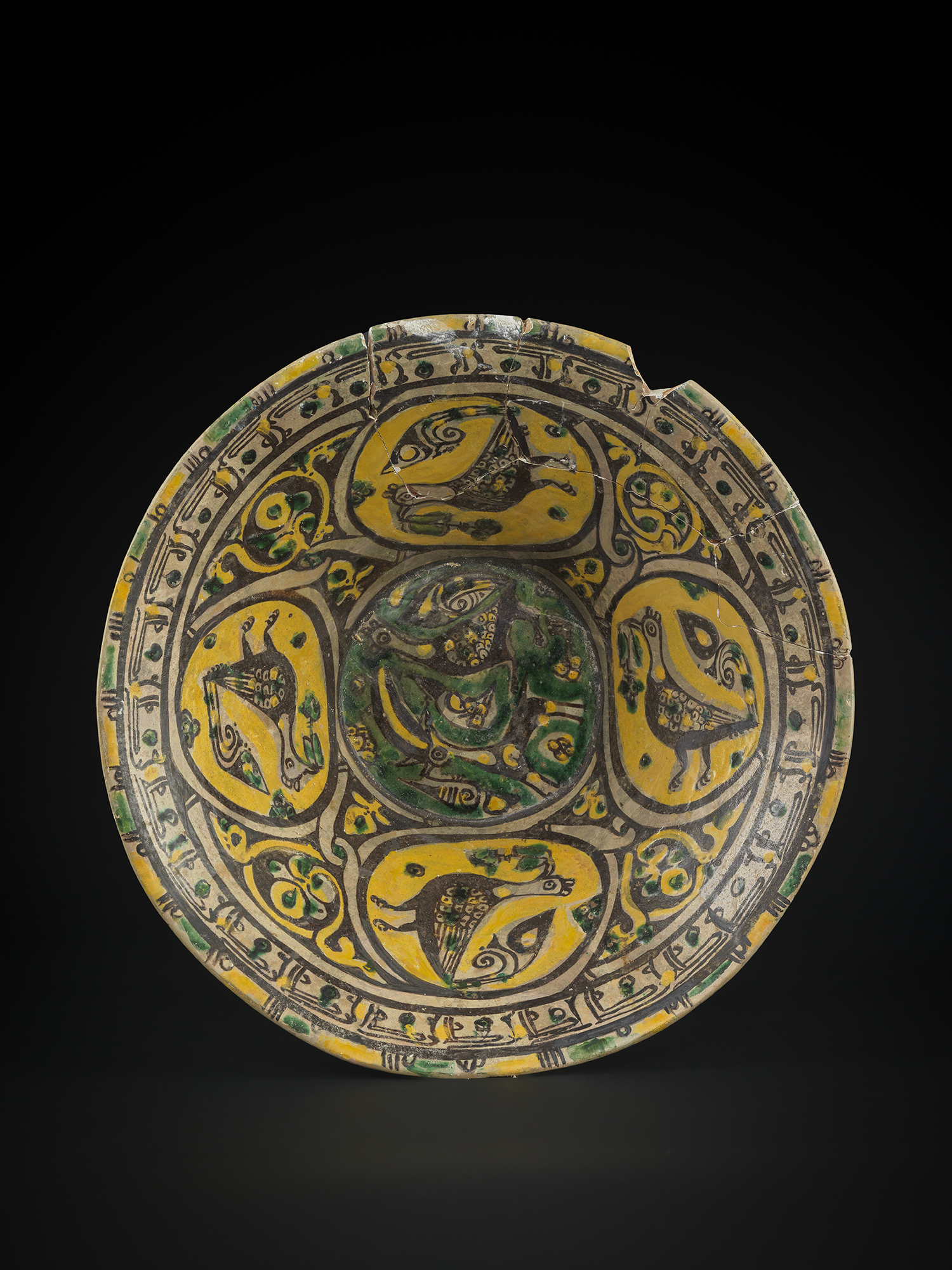 The interior of the bowl is adorned with vividly coloured motifs, including stylized birds and geometric patterns in shades of yellow, green, and black. These designs are framed within a well-organized composition that is typical of Seljuk ceramics, the exterior is decorated with vertical stripes in matching colour, creating a harmonious visual balance.