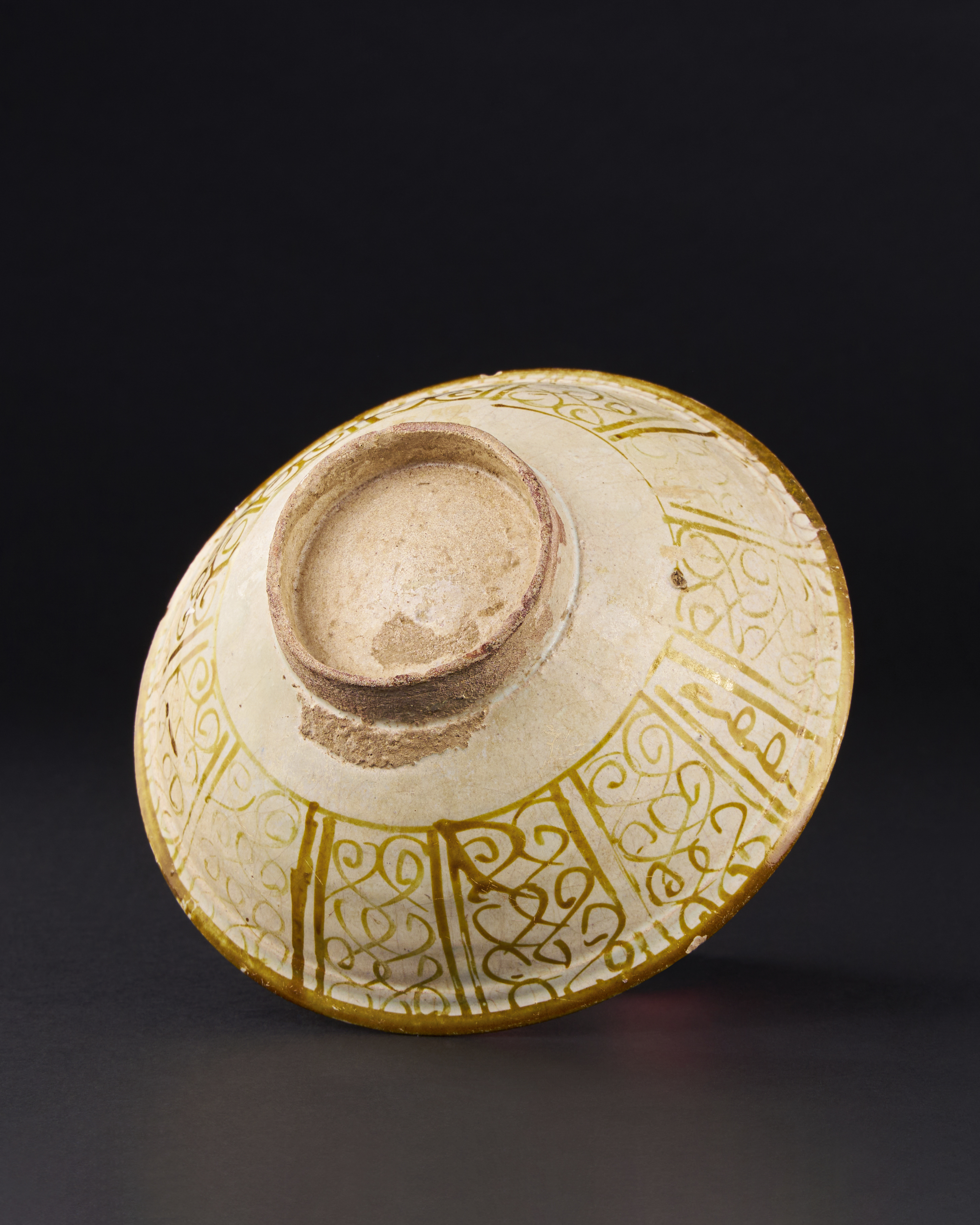 of shallow round form with a flaring rim on a short vertical foot, the fritware body painted in a golden-brown lustre with an opaque tin glaze, decorated with a stellar arabesque to the centre, the rim with a Kufic inscription reserved in lustre with stylised scrolls in the background, the exterior with section decorated with roundels