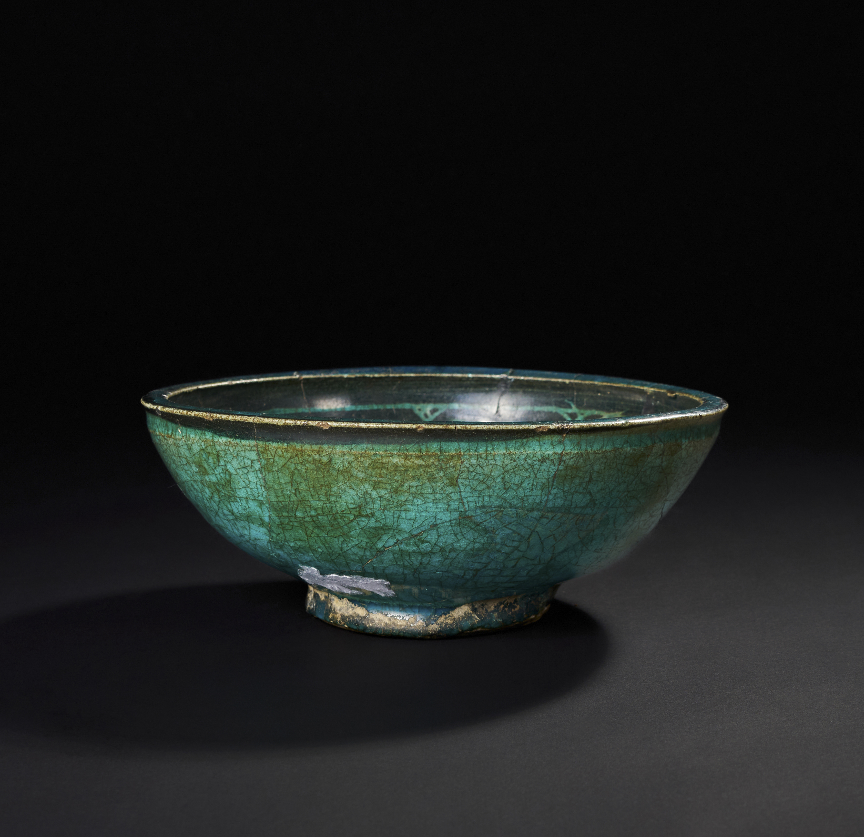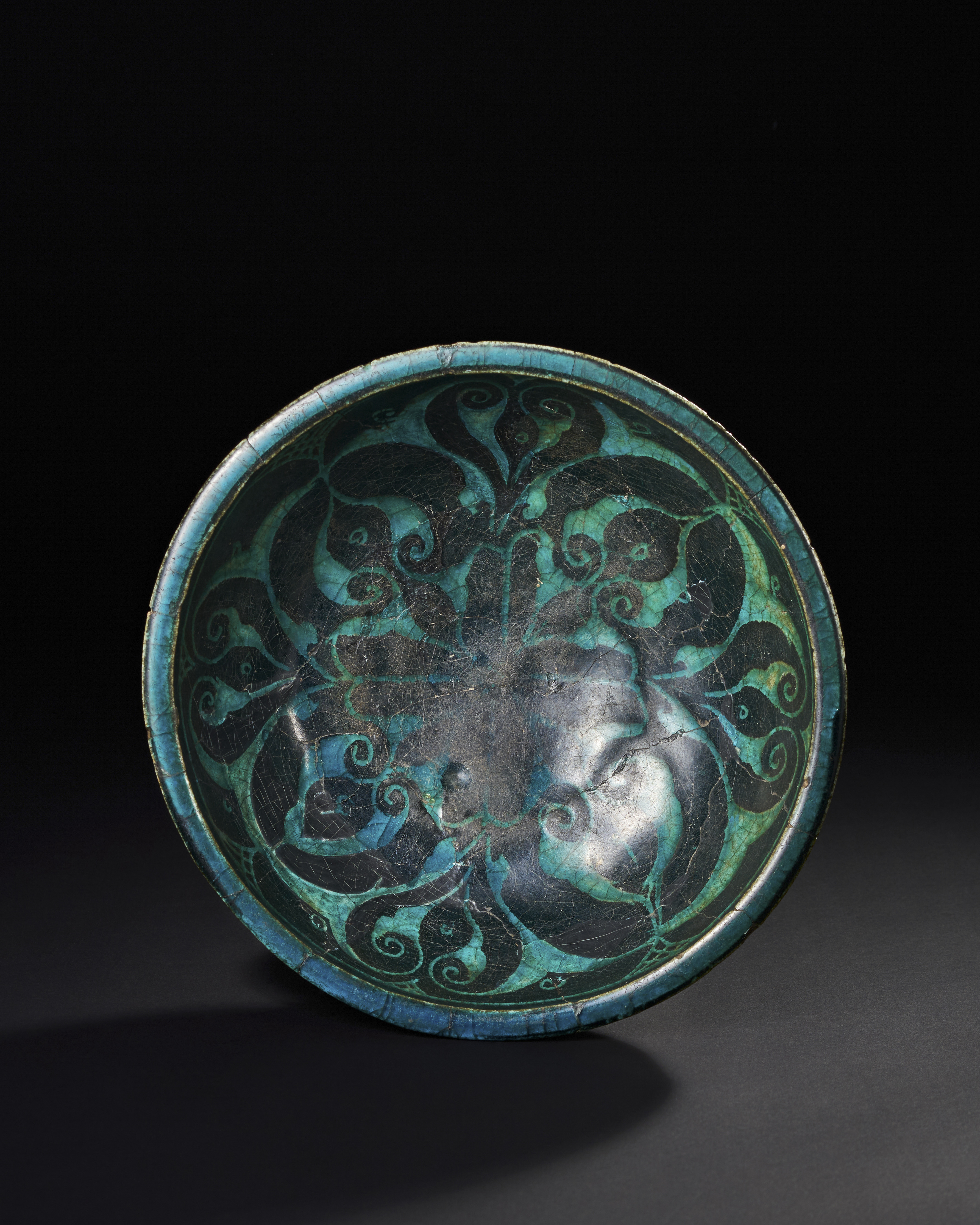 A 12th-13th century Persian Seljuk glazed pottery bowl, featuring the characteristic silhouette ware design. The bowl showcases a vibrant turquoise glaze with intricate black decoration in a stylised floral and vegetal motif, rendered in negative space. The contrast between the deep turquoise and the black creates a striking visual effect. The bowl’s shape is elegant, with a gently flared rim and a shallow base.