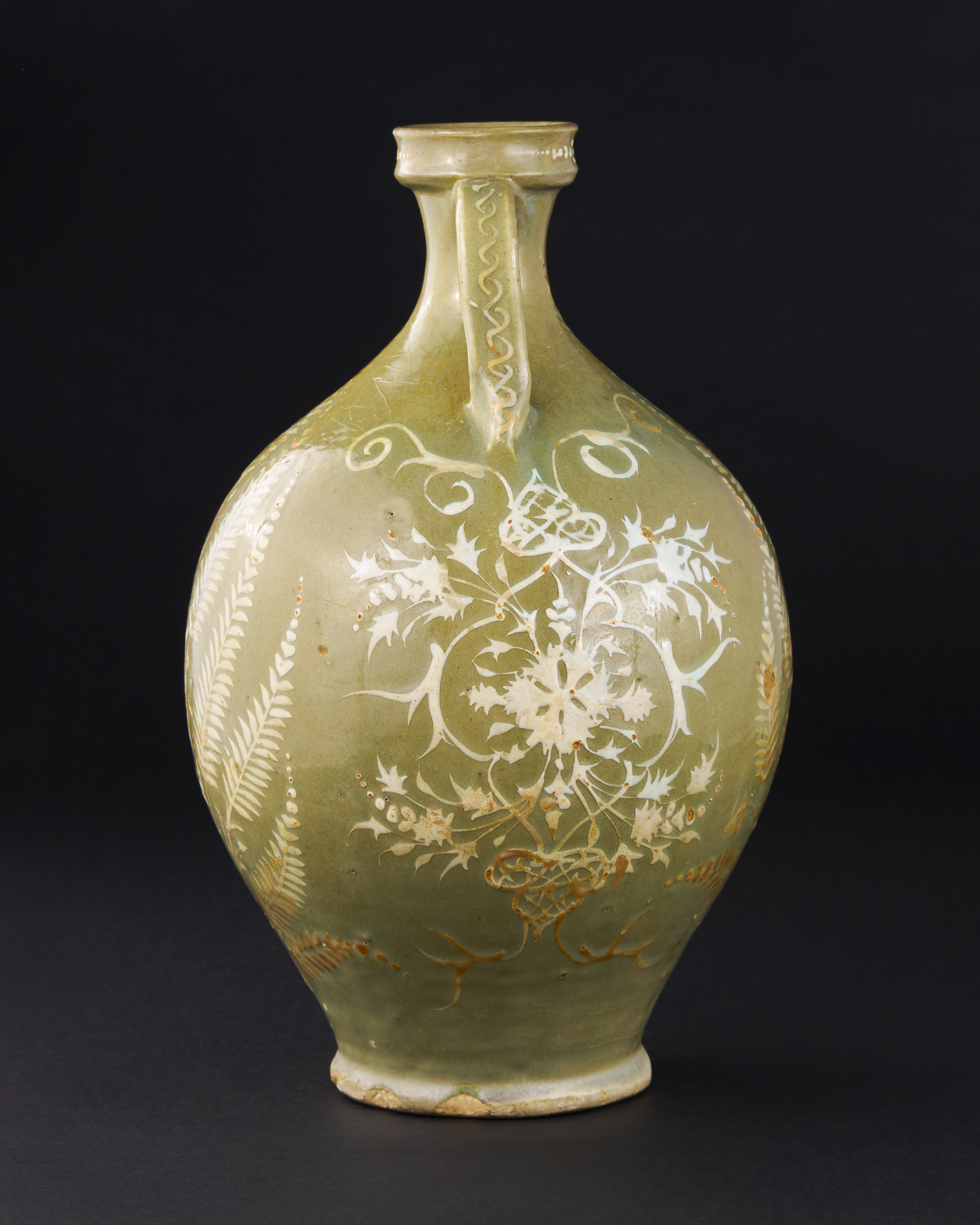 of bulbous form on a short splayed foot with waisted neck and strap handles, the rim of waisted form, decorated in a cream slip on a celadon ground with large sprays of leafy fronds to the front and back, the sides with interlaces of flower and split palmettes forming medallions terminating in palmettes