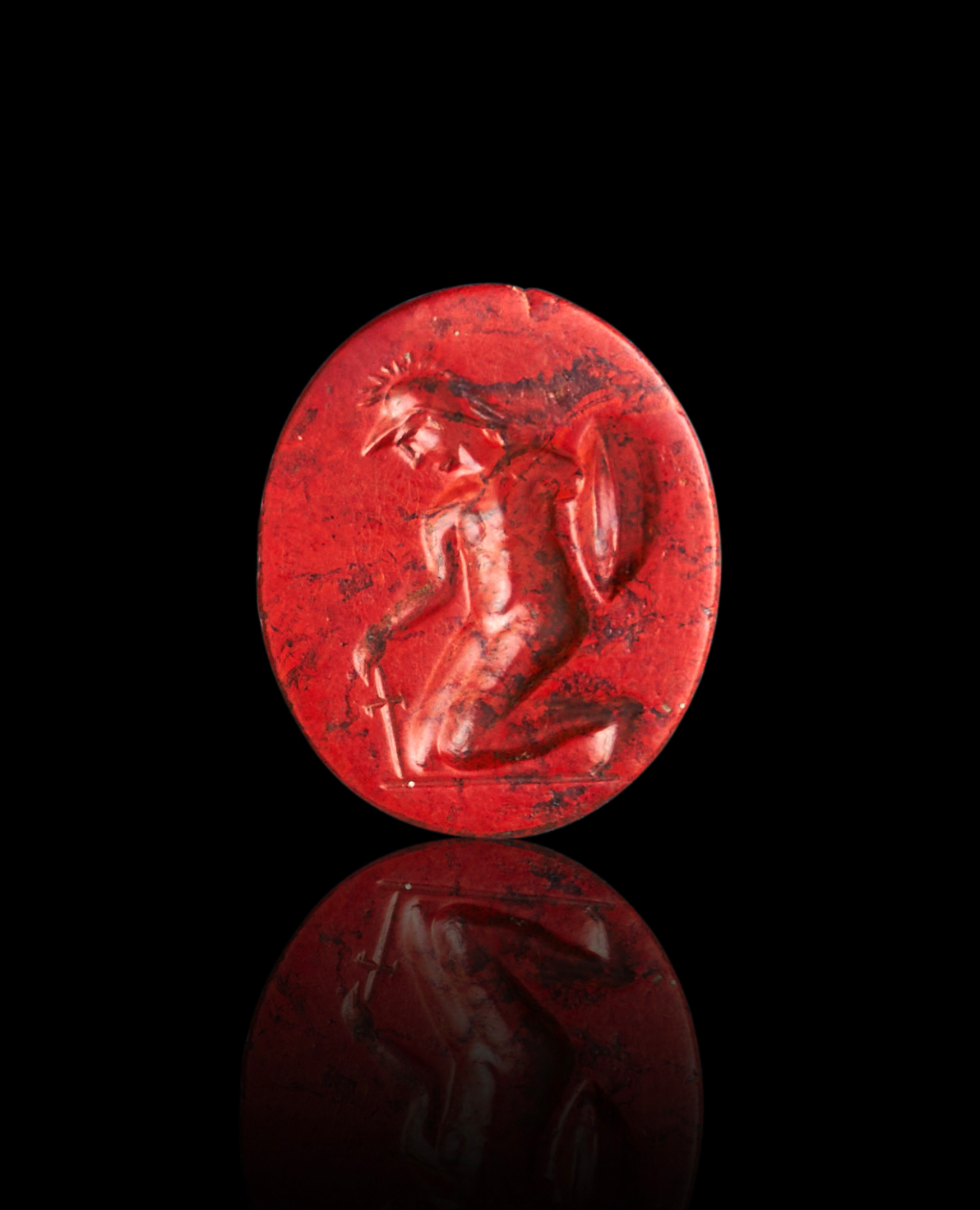 A RED JASPER ROMAN INTAGLIO OF A KNEELING WARRIOR, 1-2ND CENTURY A.D