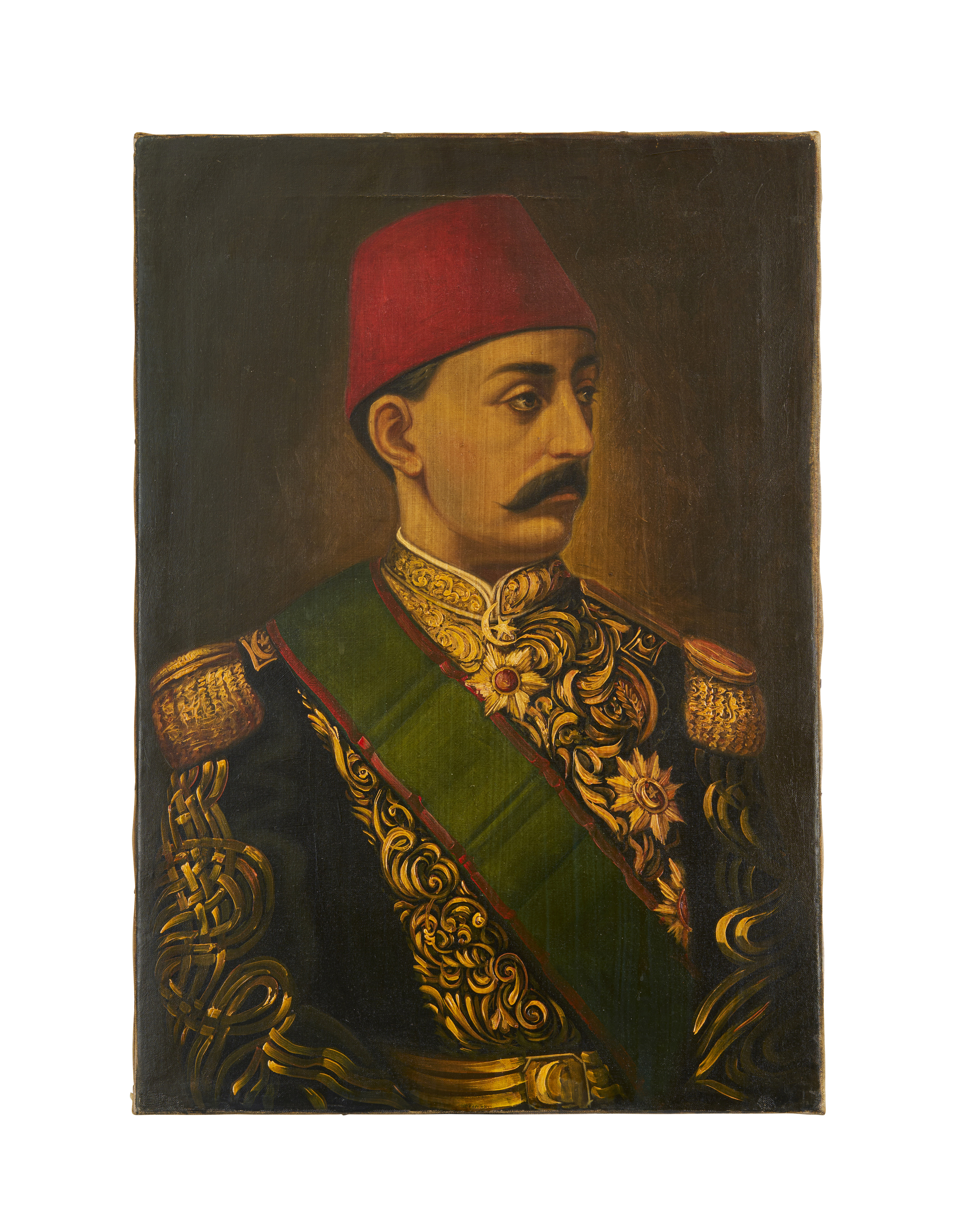Murad V is shown wearing a richly embroidered military uniform adorned with intricate gold patterns and epaulettes. A green sash crosses his chest, likely representing an honor or order of distinction. His red fez, a symbol of Ottoman modernization, sits atop his head. His face has a dignified yet solemn expression, with neatly groomed facial hair, emphasizing his noble status.