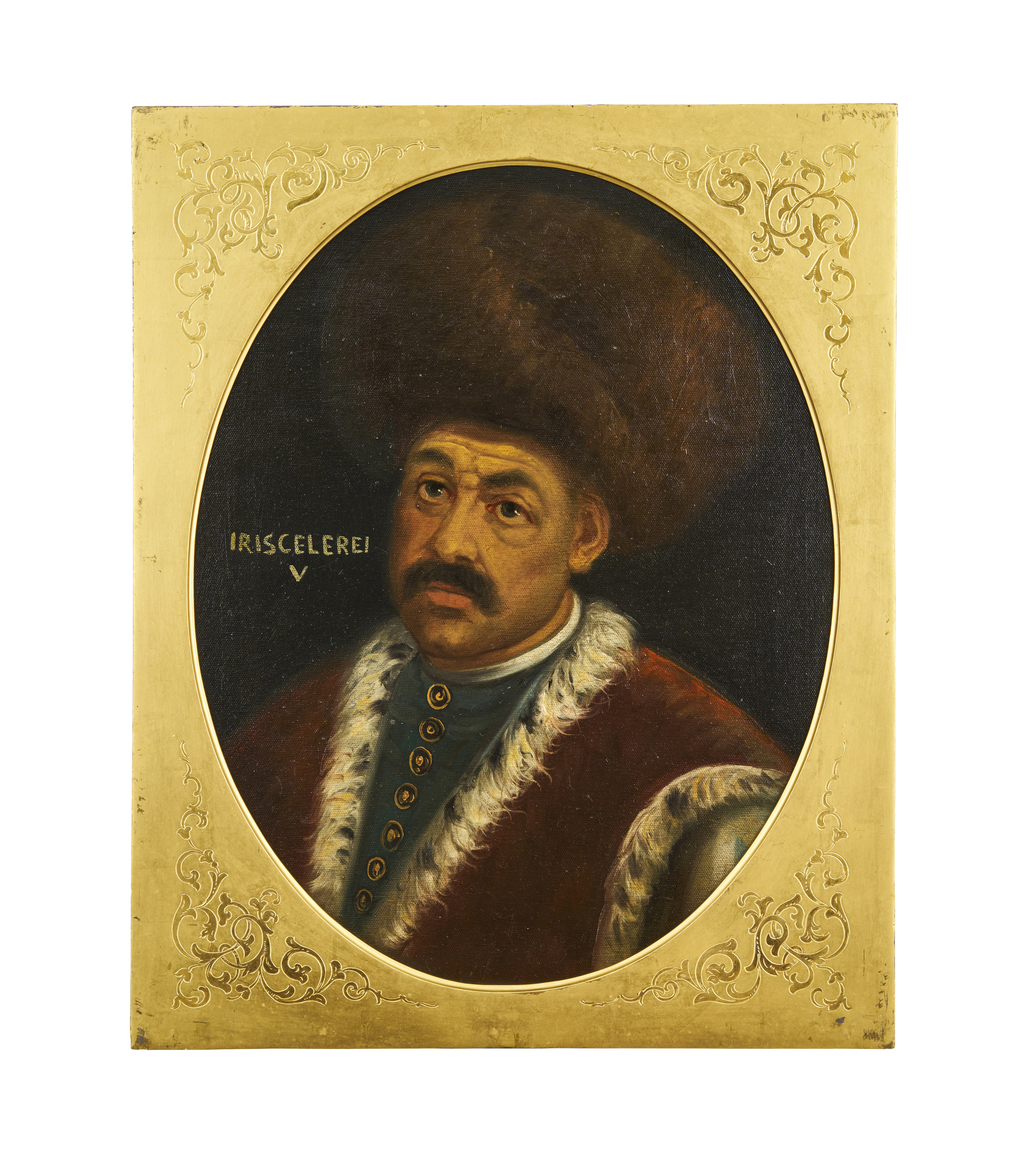 An oil painting on canvas depicts Isa Çelebi, an Ottoman prince and co-ruler during the tumultuous period of the Ottoman Interregnum. Dressed in luxurious attire befitting his status, the subject is portrayed with a fur-trimmed coat, a row of ornate buttons, and an imposing fur hat, characteristic of Ottoman noble fashion. The portrait is set within an oval frame with an elegant gold-painted border featuring intricate floral designs. The name “IRISCELEBI V” is inscribed beside the figure, further identifying him.