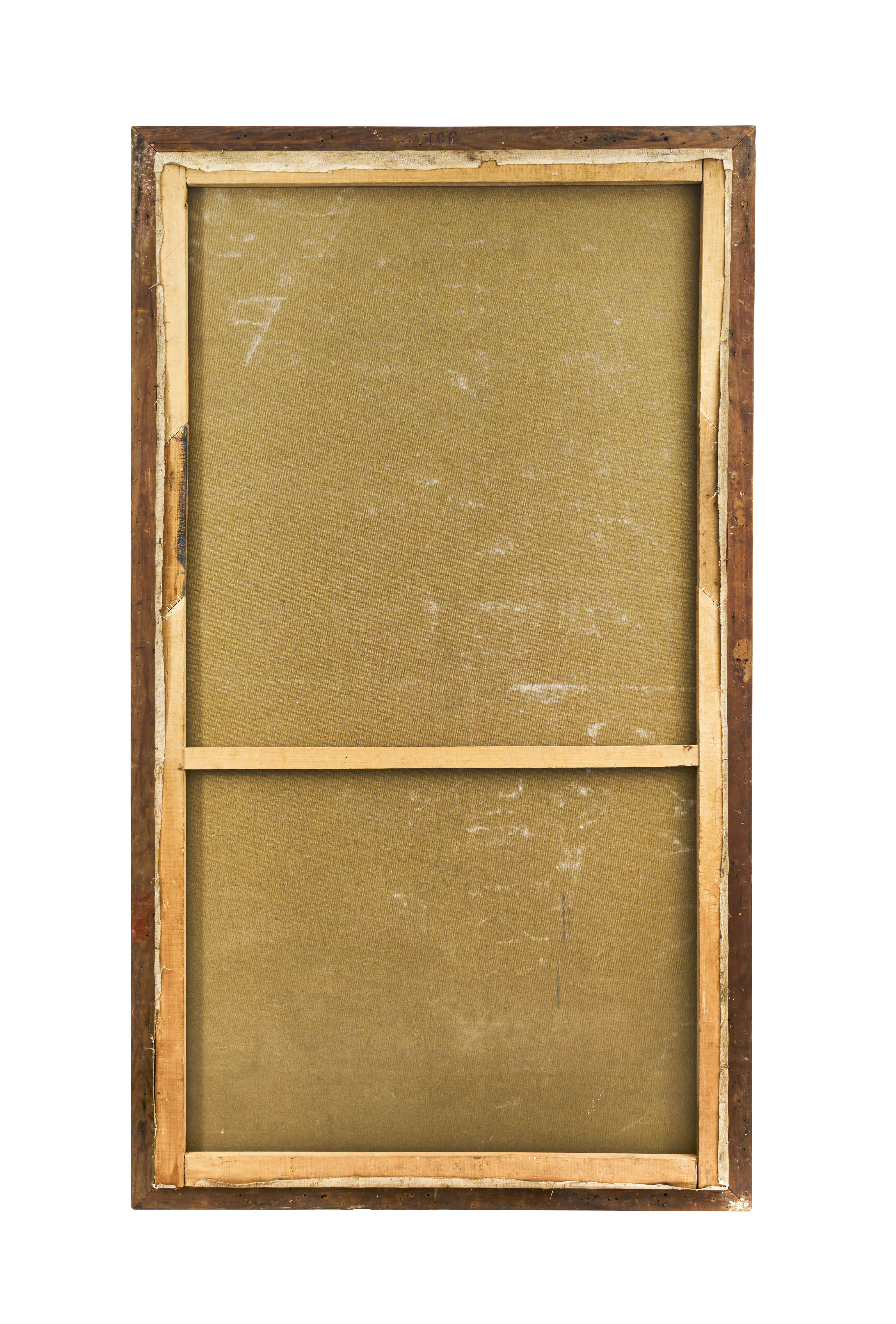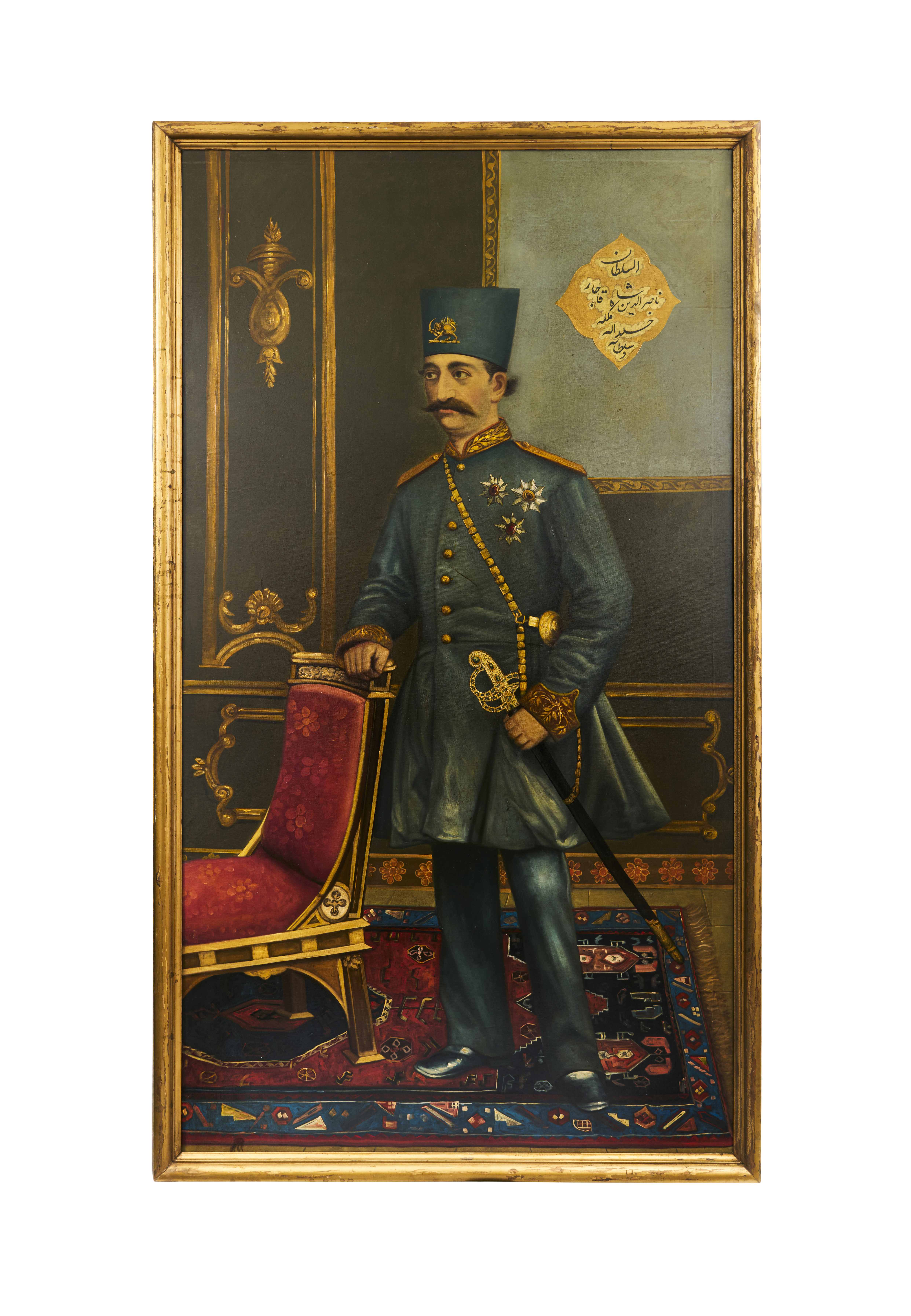 A grand, life-size oil painting on canvas portrays Nasser al-Din Shah Qajar (1831–1896), the fourth Shah of Persia from the Qajar dynasty. Standing in an opulent interior, he is elegantly dressed in an imperial military uniform, adorned with golden embroidery, medals, and a distinguished sash. His regal presence is further emphasised by his tall Qajar-style hat, featuring the royal emblem.