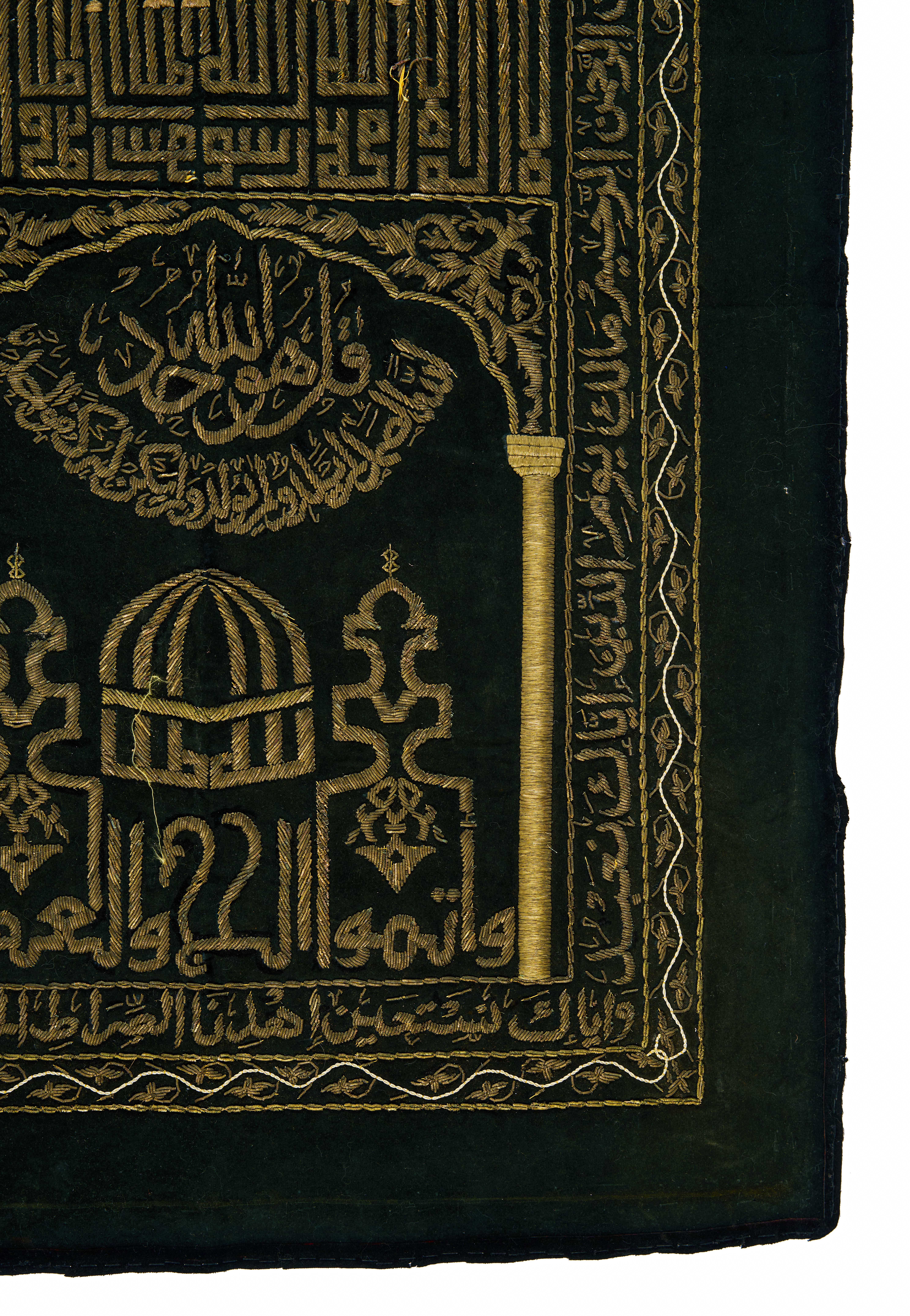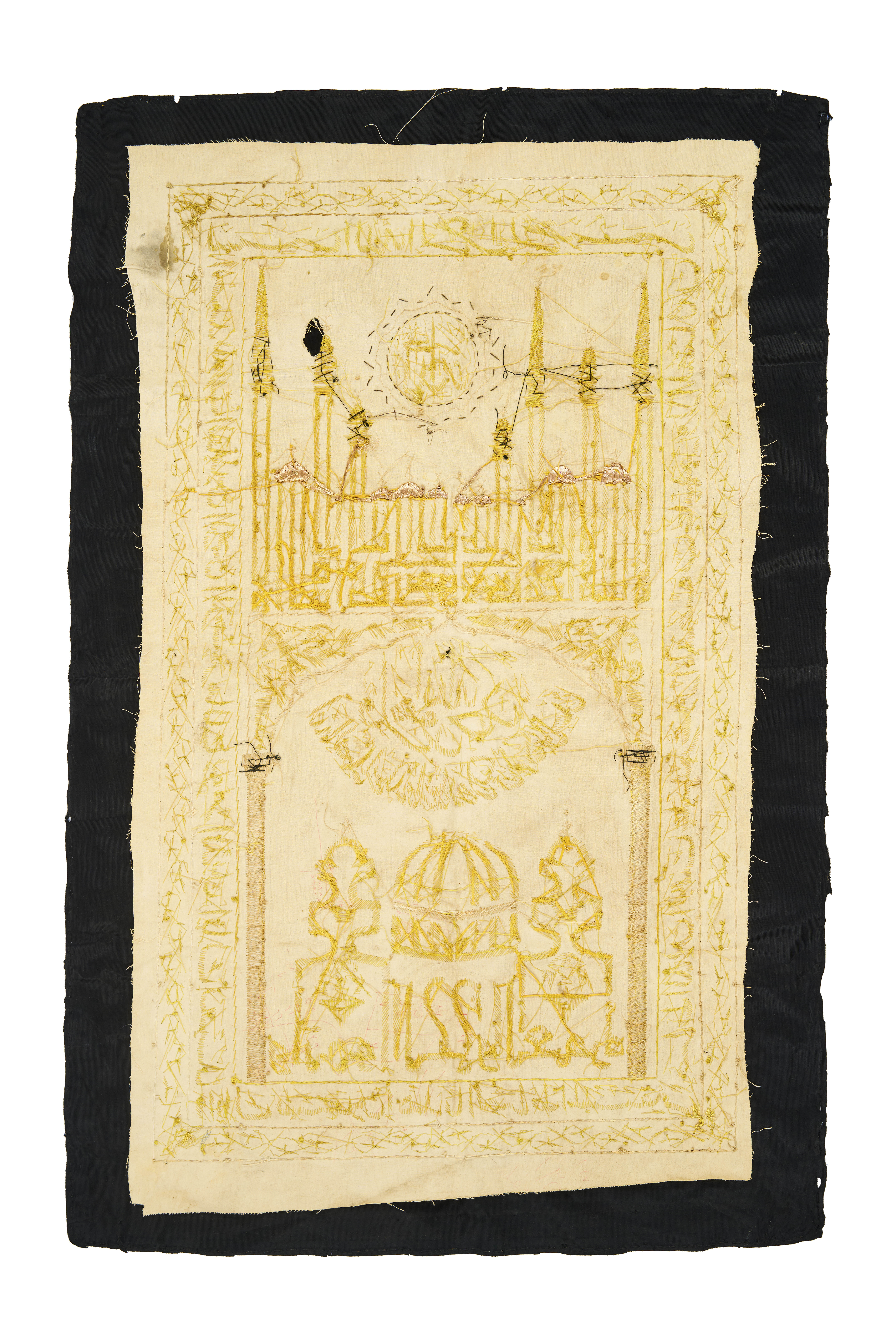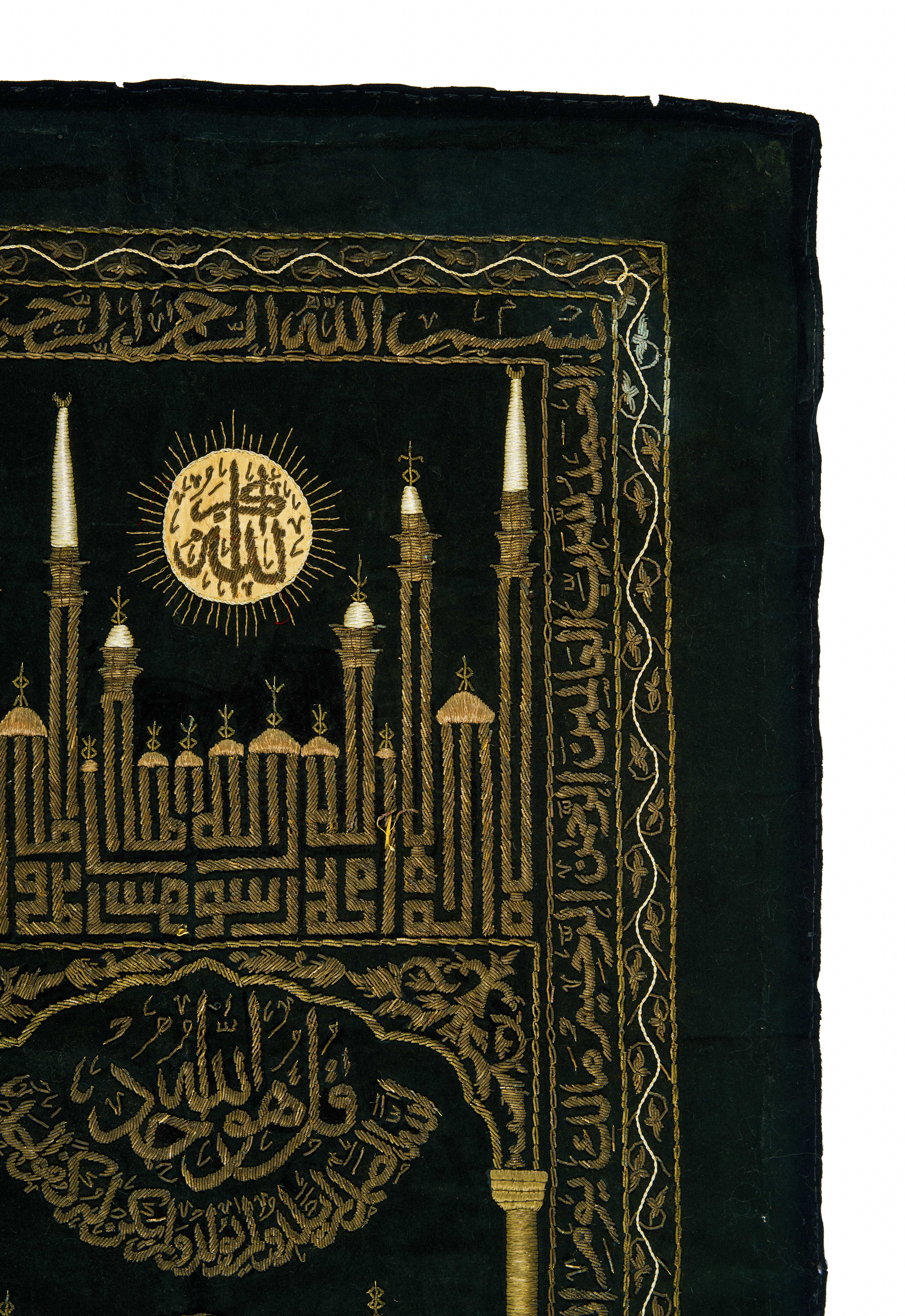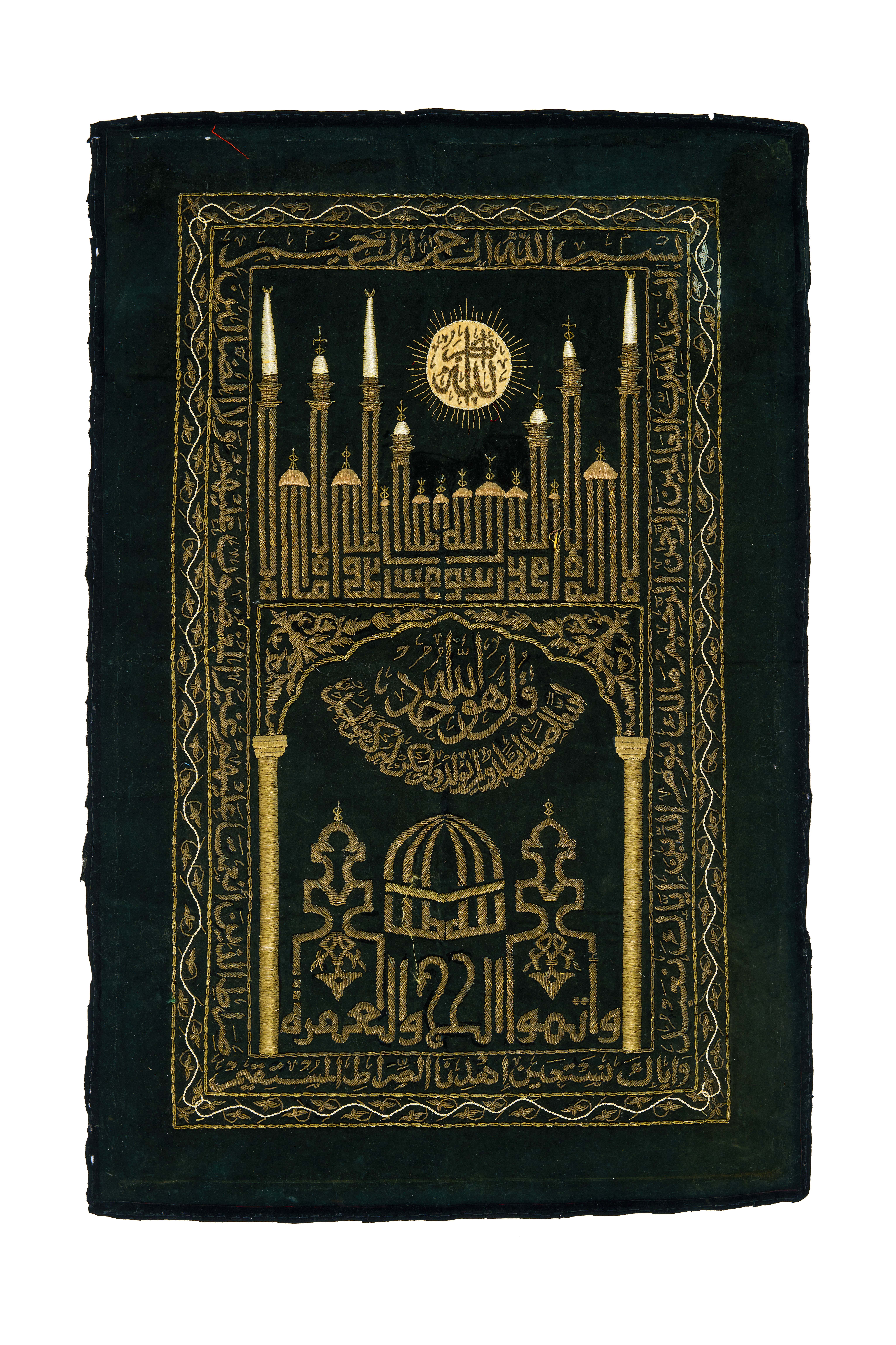 A black metal thread textile from India, dating to the mid-20th century. The textile features intricate gold embroidery with Arabic calligraphy and architectural motifs. The central design showcases a stylized mosque with tall minarets, domes, and arches, possibly representing the Prophet’s Mosque in Medina or another significant Islamic structure. The upper section contains a circular emblem with Arabic inscriptions, radiating like a sun. The borders are adorned with additional calligraphy and decorative patterns.